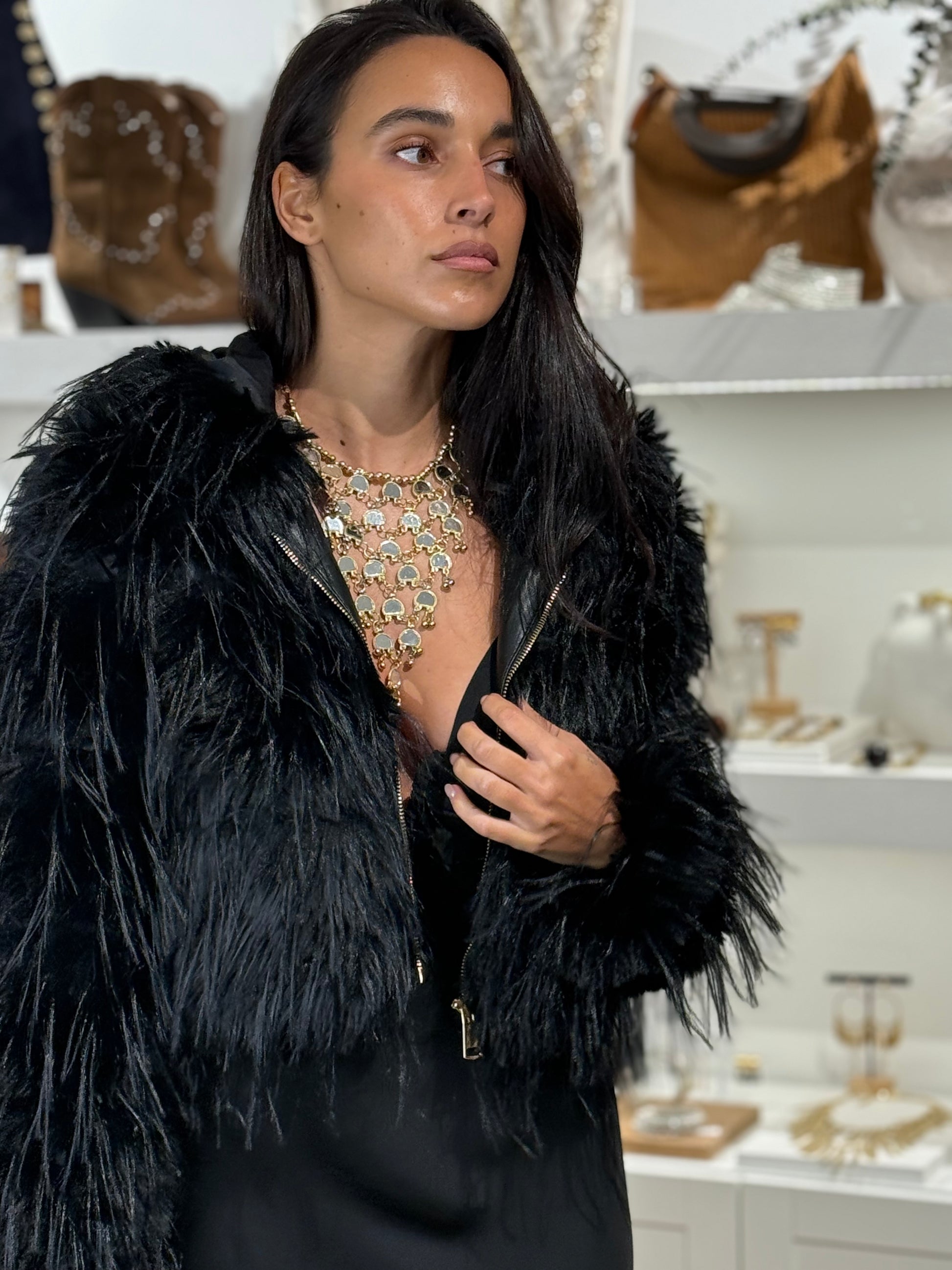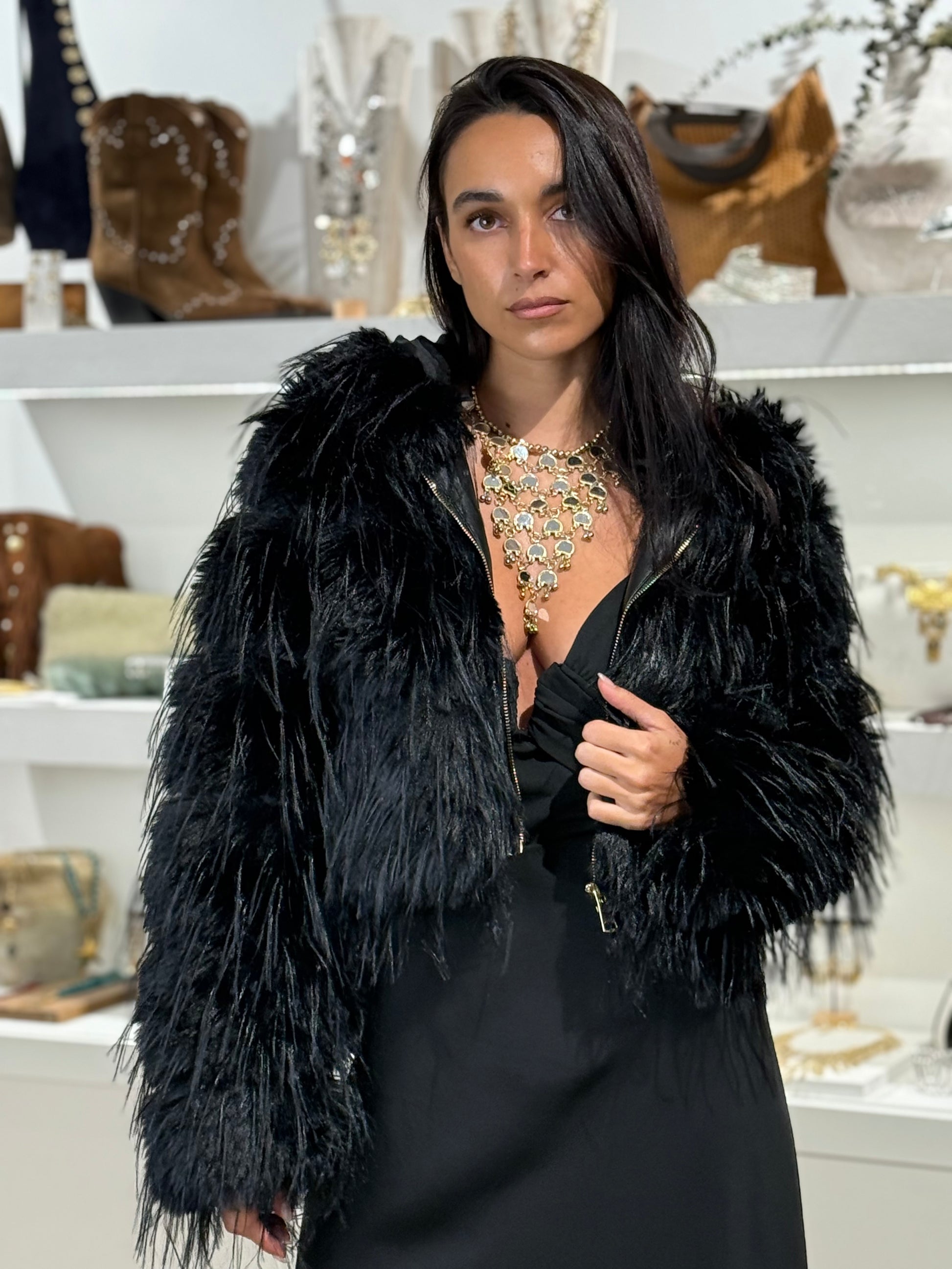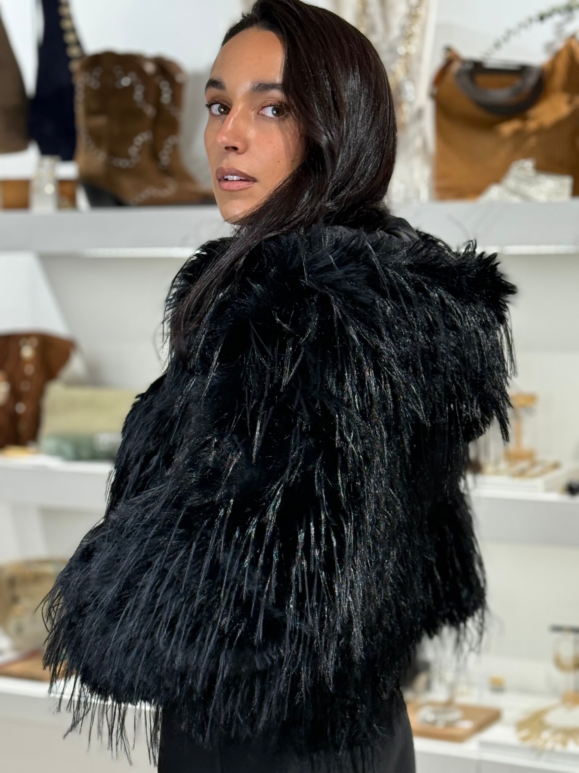 Chaqueta crop de pelo con forro interior, capucha y cierre de cremallera. La modelo mide 1,65 usa talla 36.