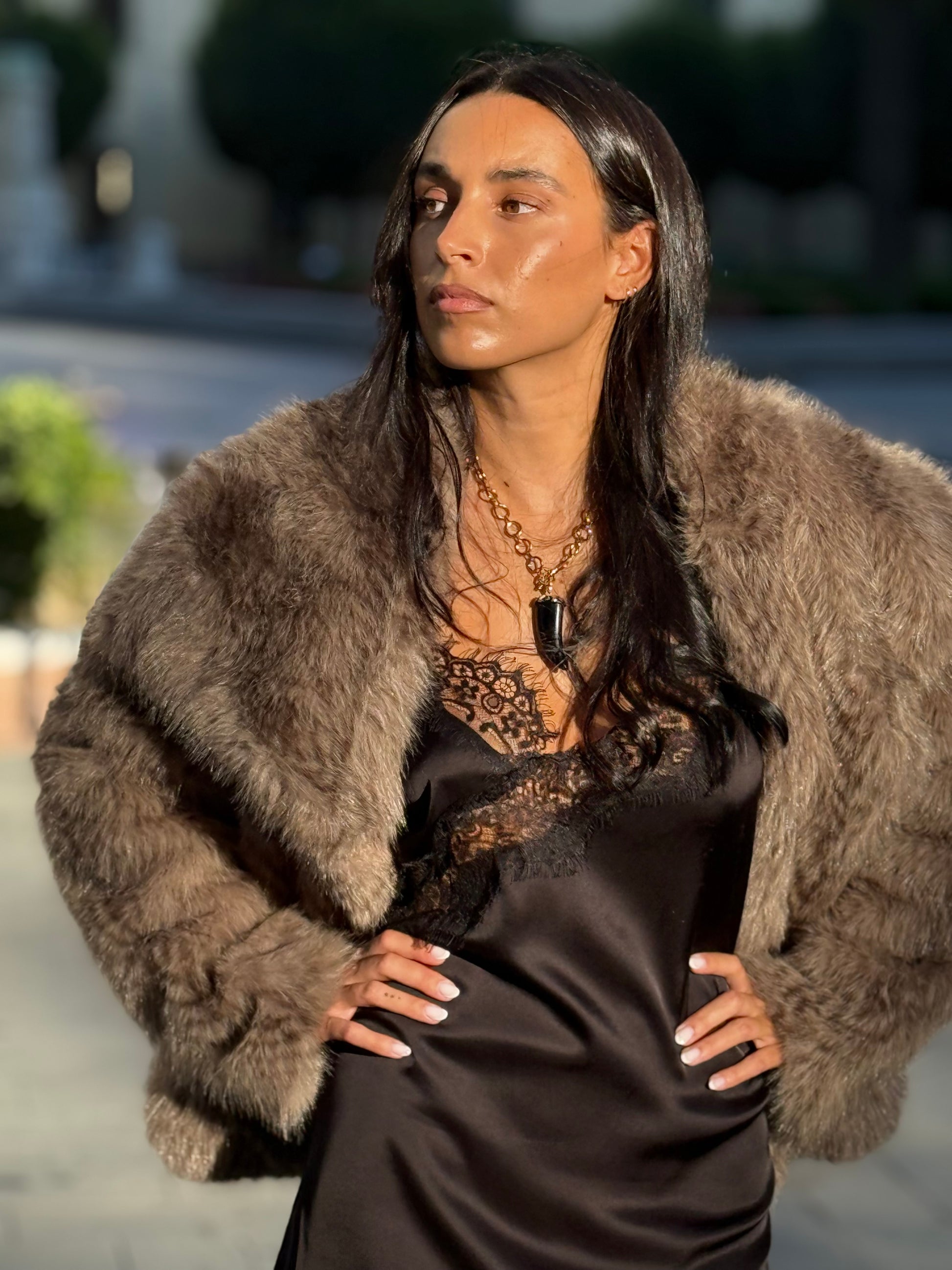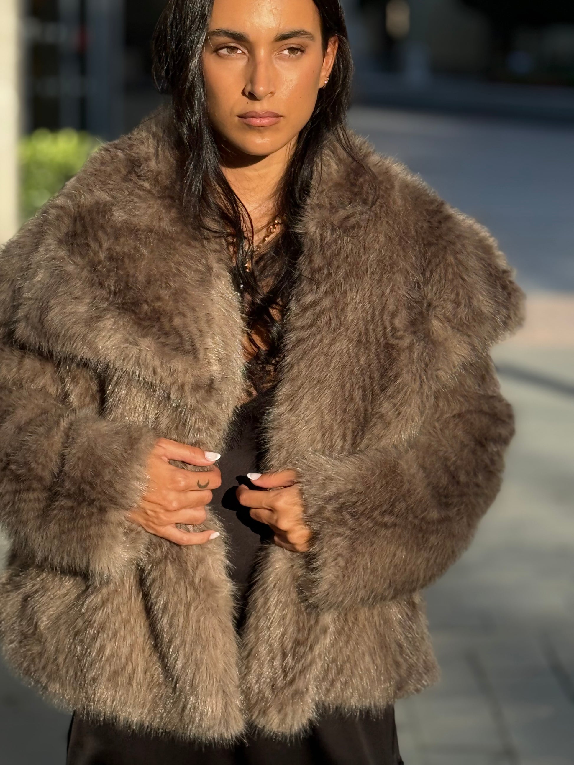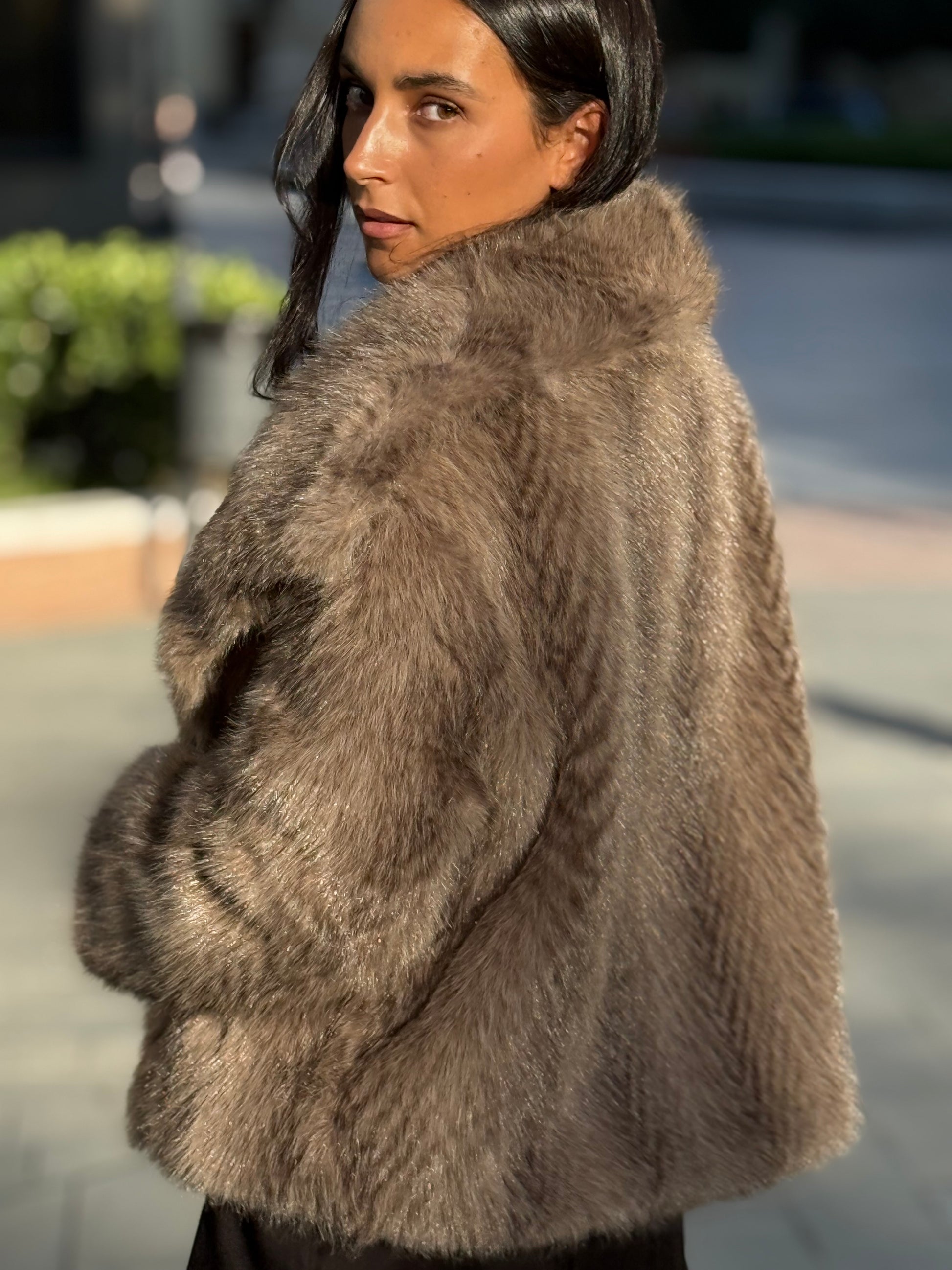 Abrigo de pelo con forro interior, bolsillos laterales y cierre de corchetes. La modelo mide 1,65 usa talla 36.