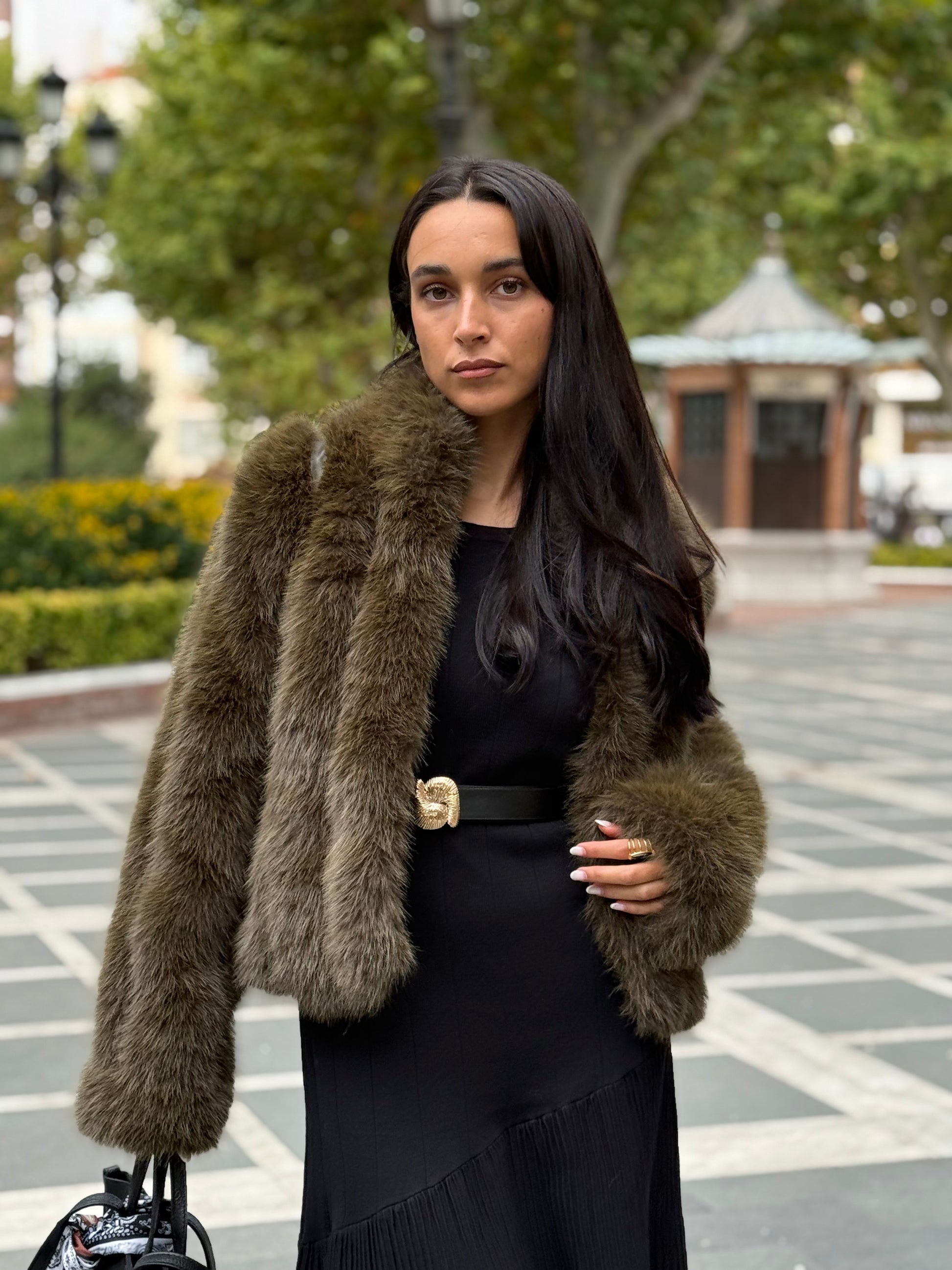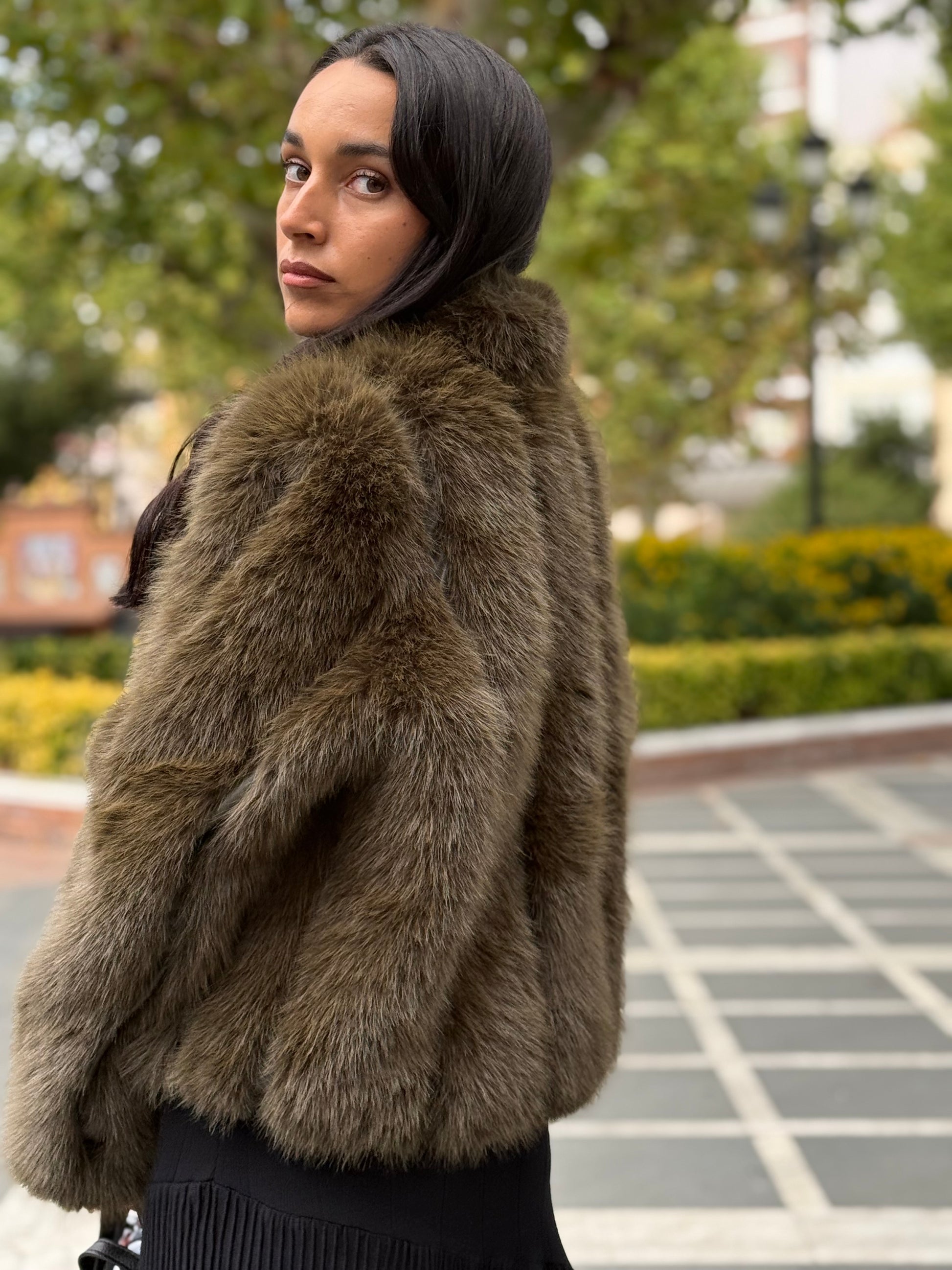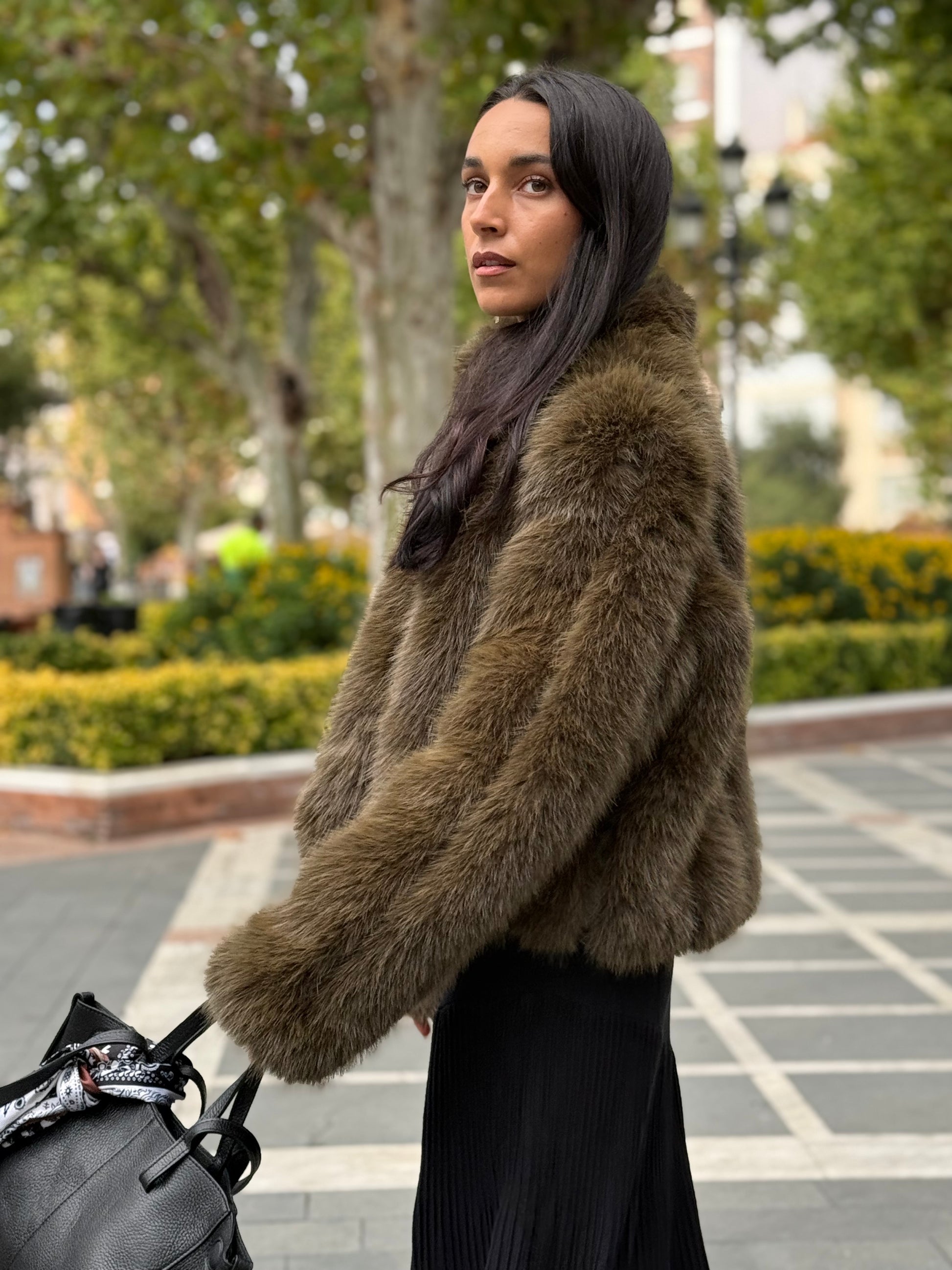 Chaqueta de pelito, bolsillos laterales. La modelo mide 1,65 usa talla 36.