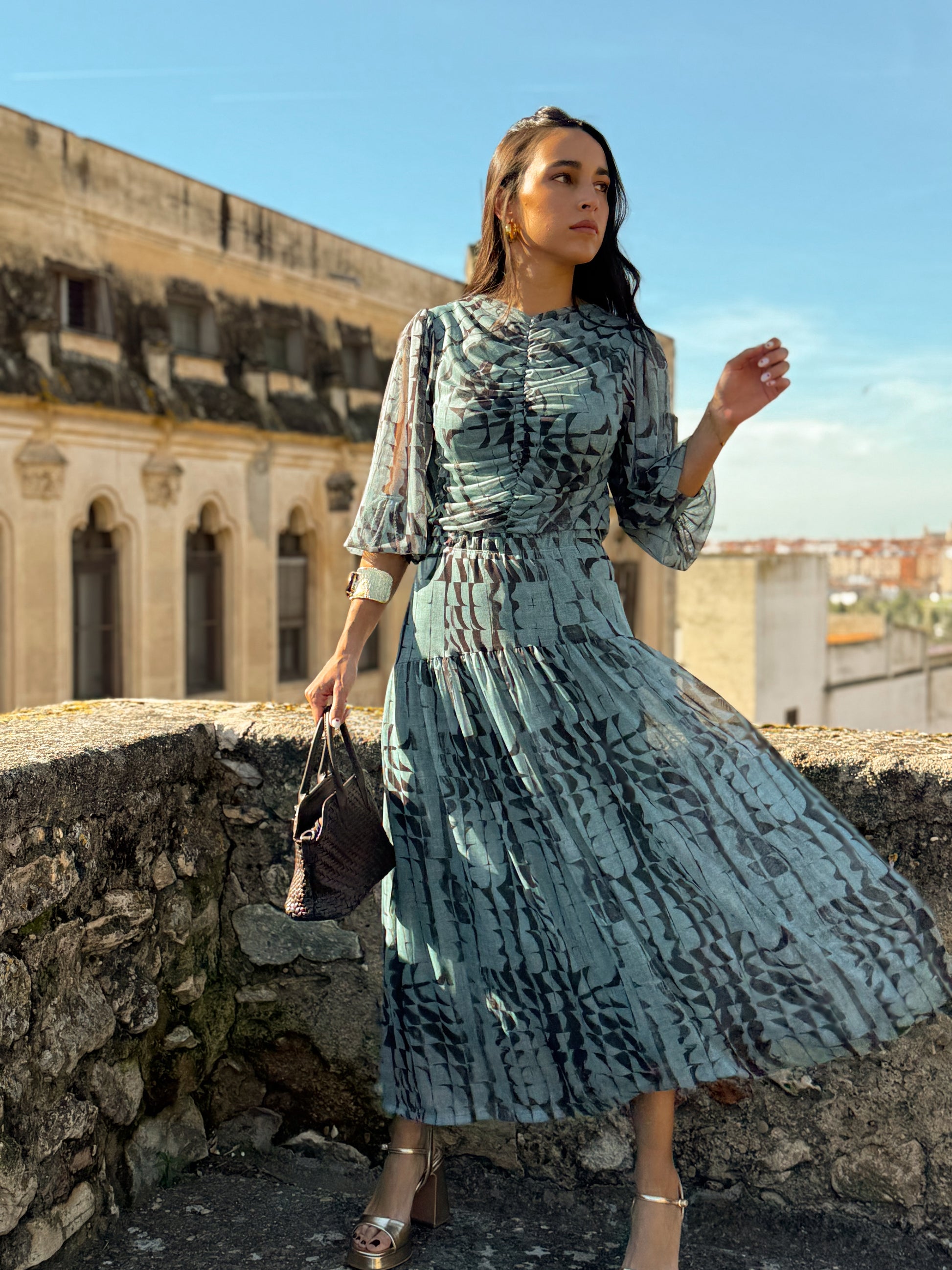 Blusa fluida de tul, forro en cuerpo, frunce en parte delantera. La modelo mide 1,65 y usa talla S.