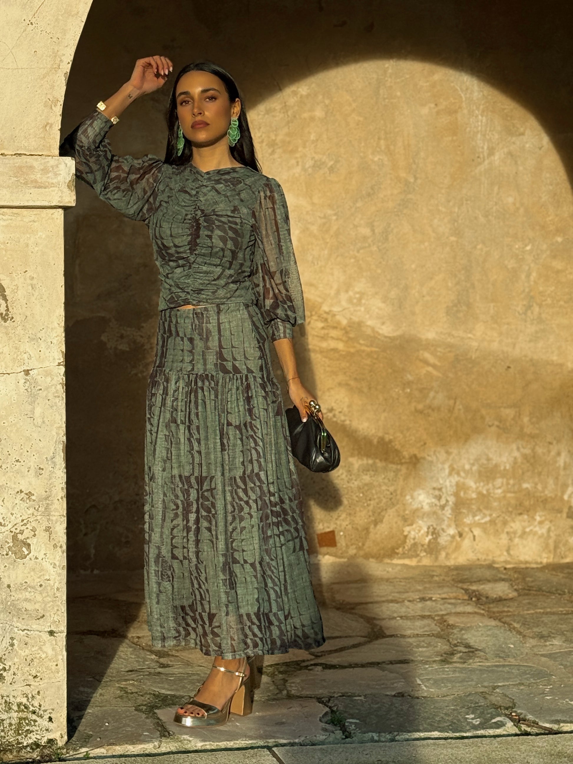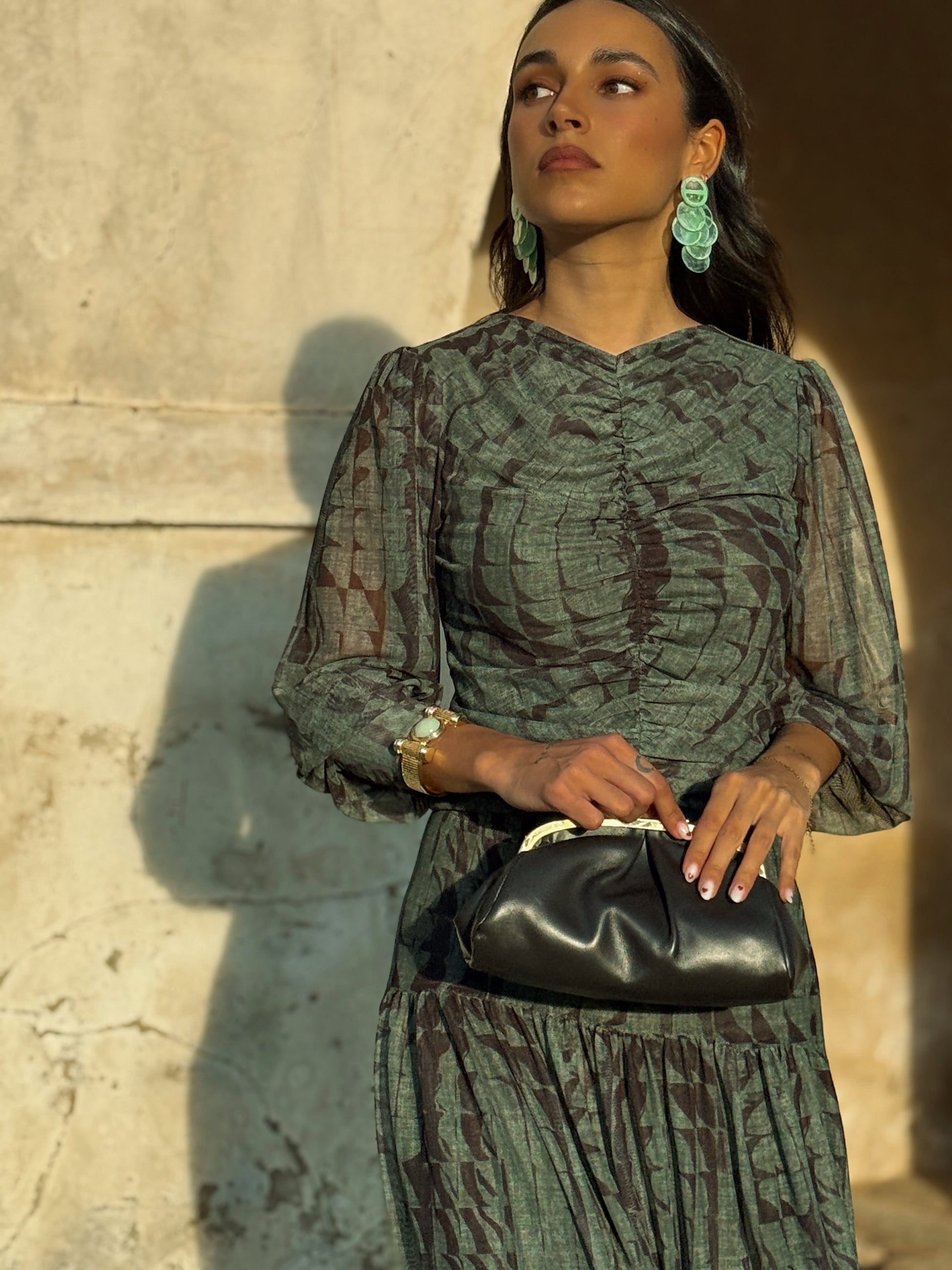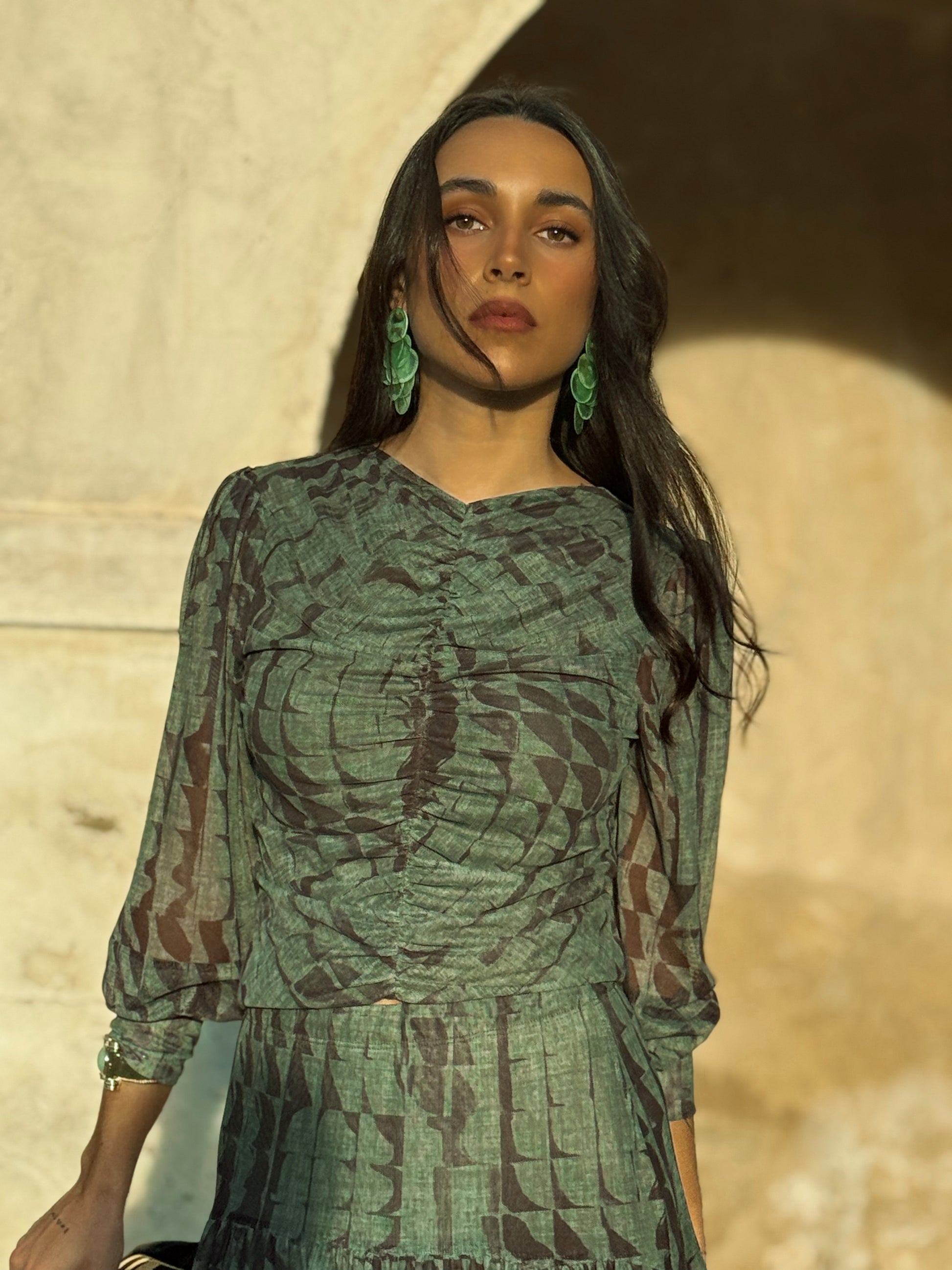 Blusa fluida de tul, forro en cuerpo, frunce en parte delantera . Color verde combinado con marrón. La modelo mide 1,65 y usa talla S.