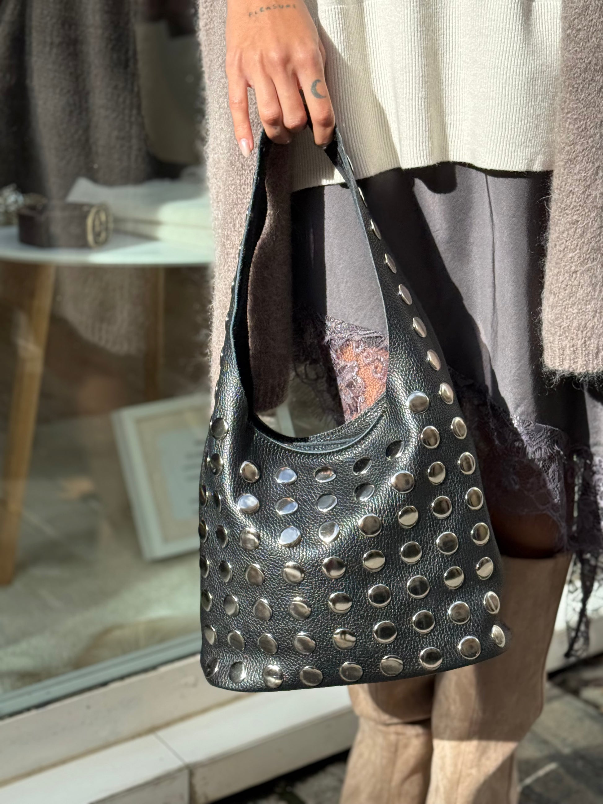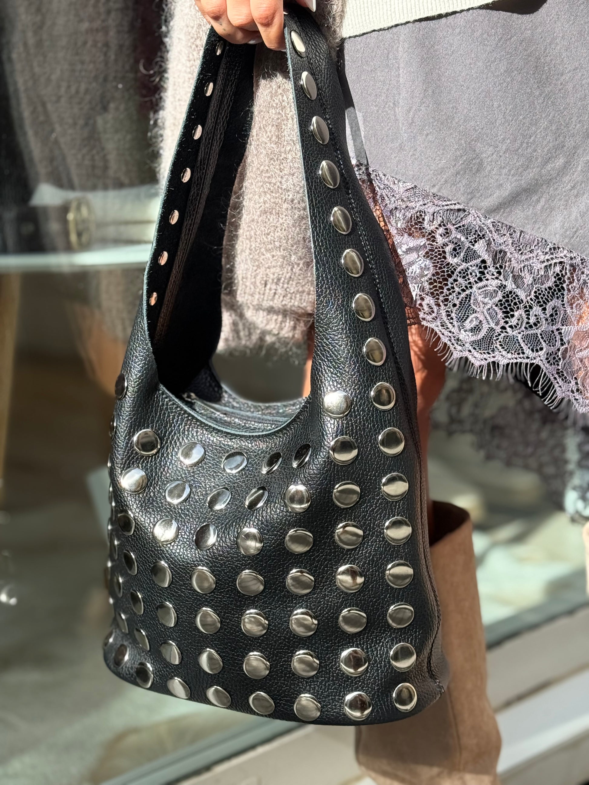 Bolso de piel con asa de hombro, tachas plateadas y cierre de cremallera. Color negro.