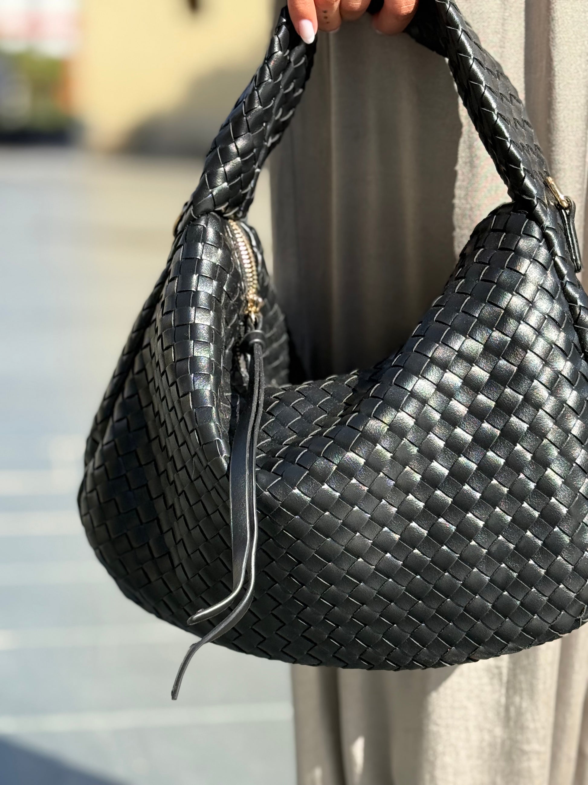 Bolso efecto piel con asa de mano y larga de colgar en mismo material y cierre de cremallera.