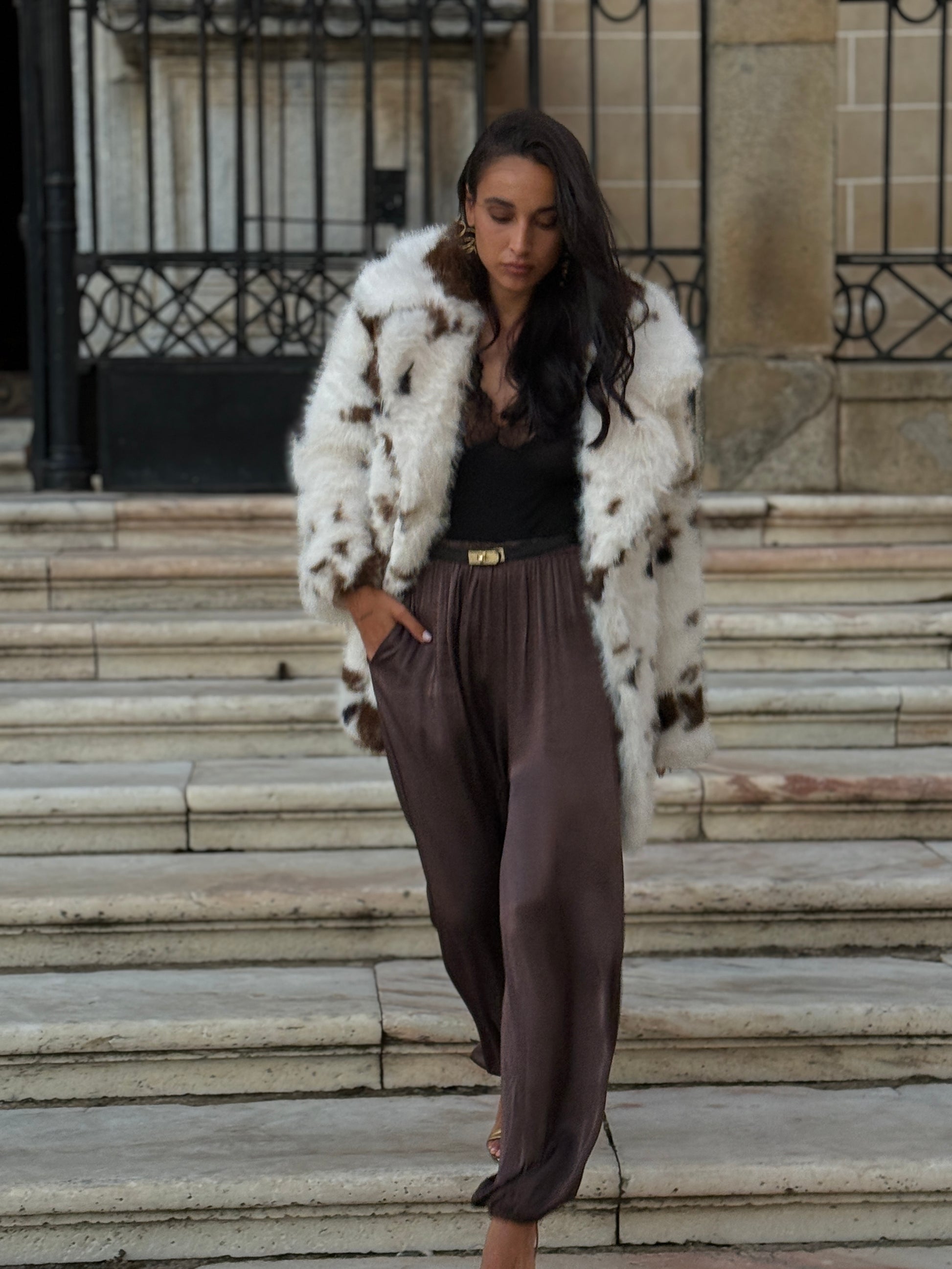 Pantalón bombacho satinado, bolsillos laterales, elástico en tobillo y cintura. La modelo mide 1,65 y usa talla 36.