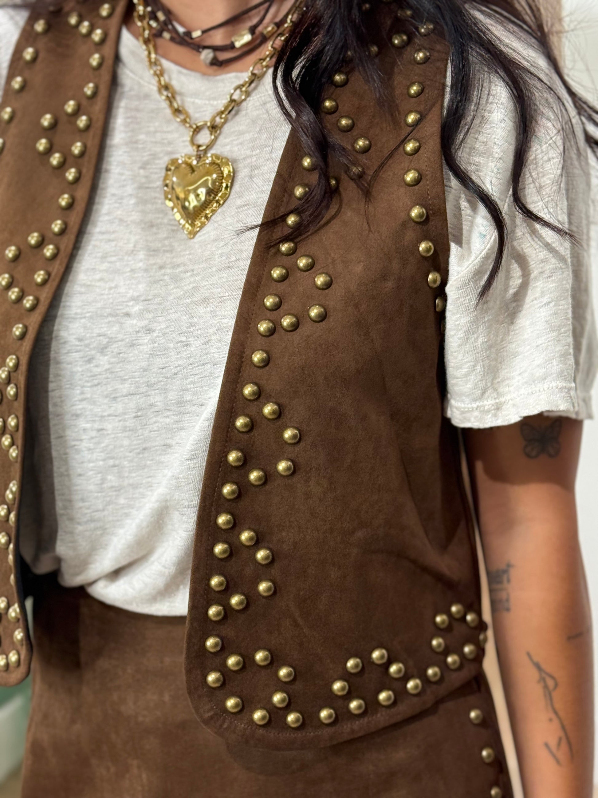 Chaleco de ante abotonado decorado con tachas doradas. La modelo mide 1,65 usa talla 36 y lleva S/M.