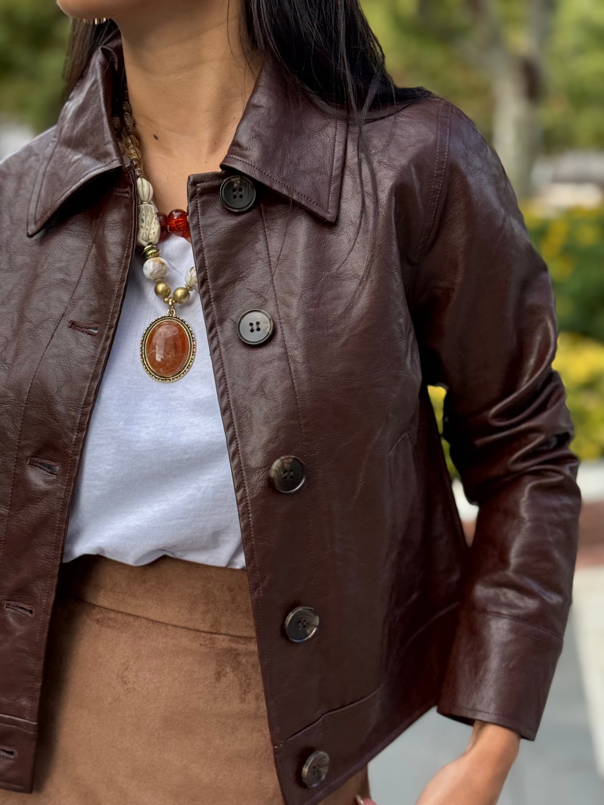 Chaqueta efecto piel con corte recto, cuello inglés, cierre delantero con botones y forro completo. Color marrón. La modelo mide 1,72 usa talla 36 y lleva talla S/M.