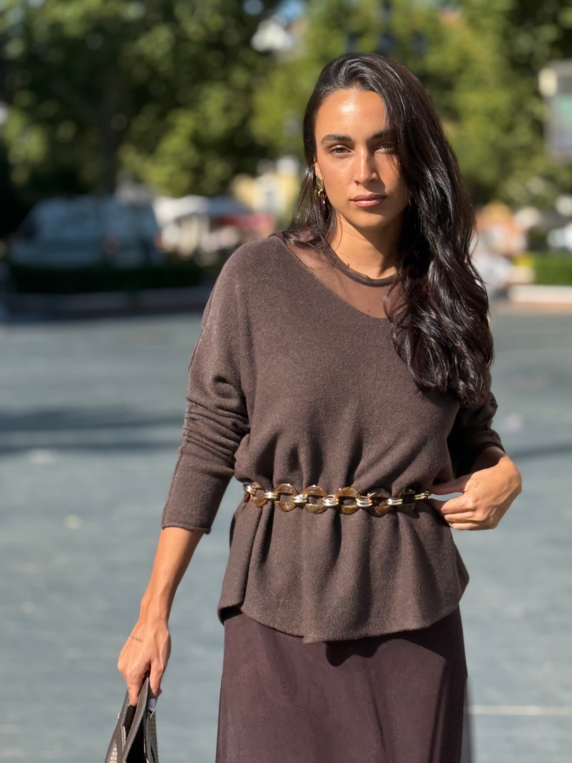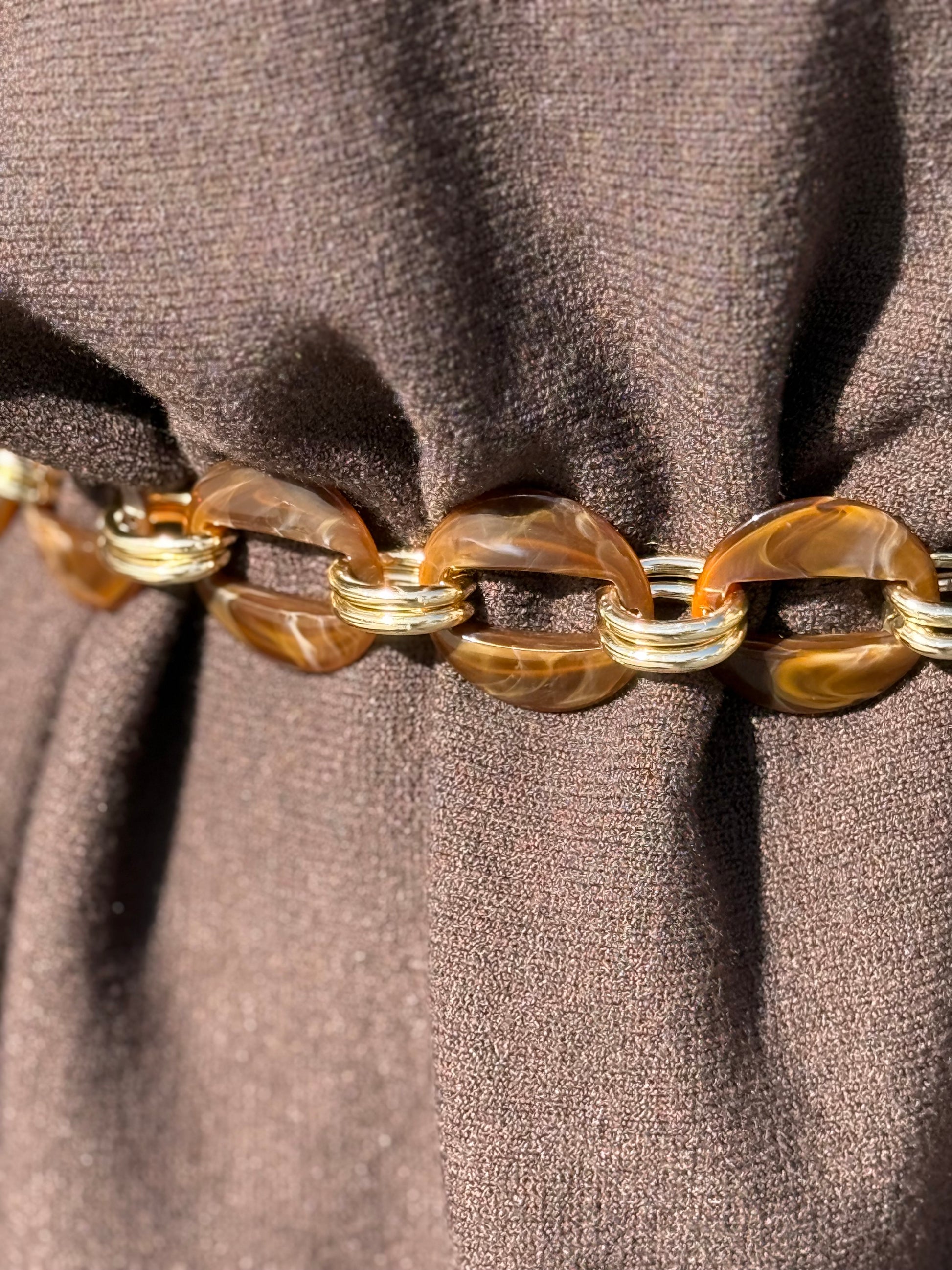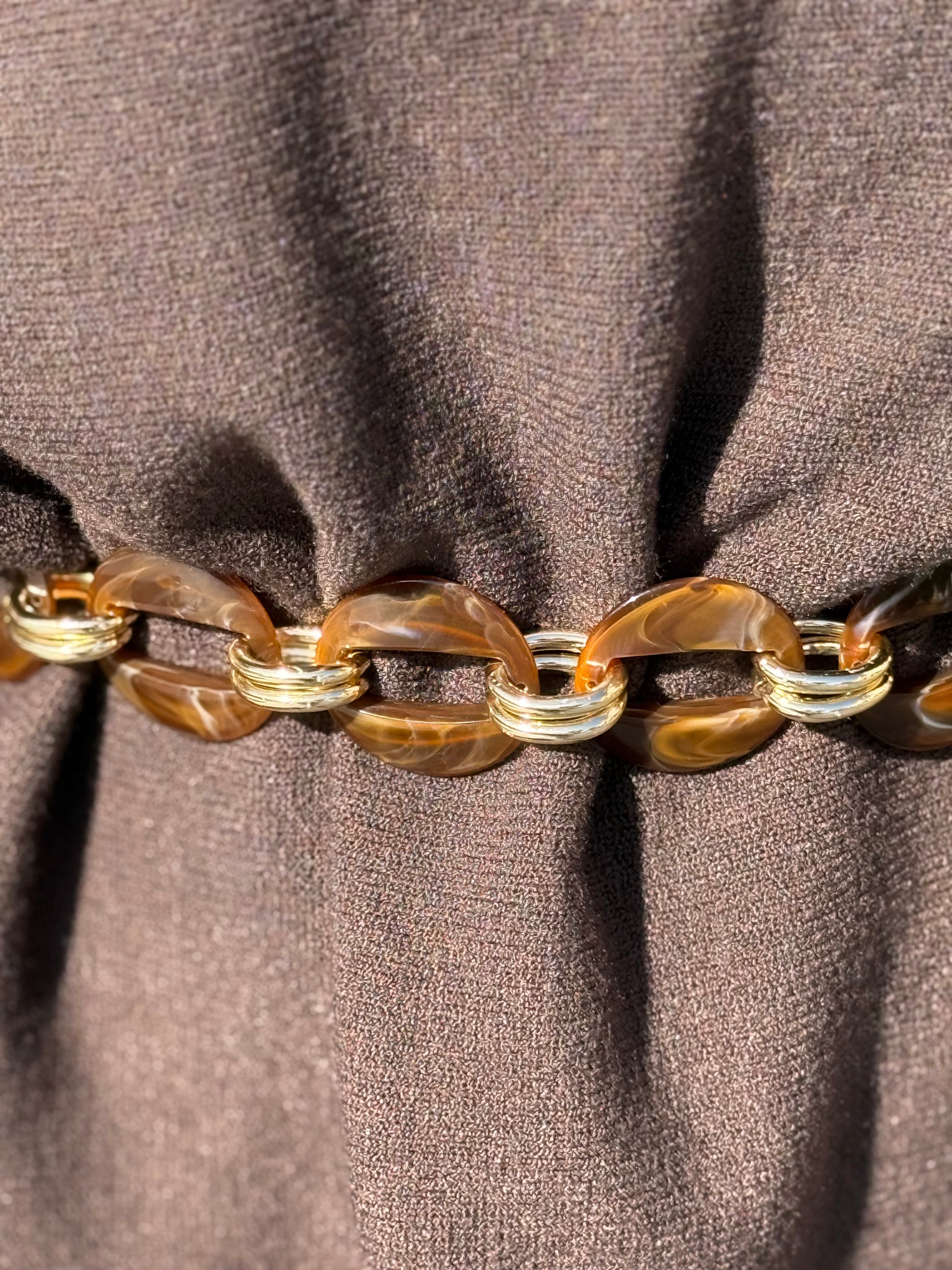 Cinturón ajustable de resina efecto carey y metálico dorado.