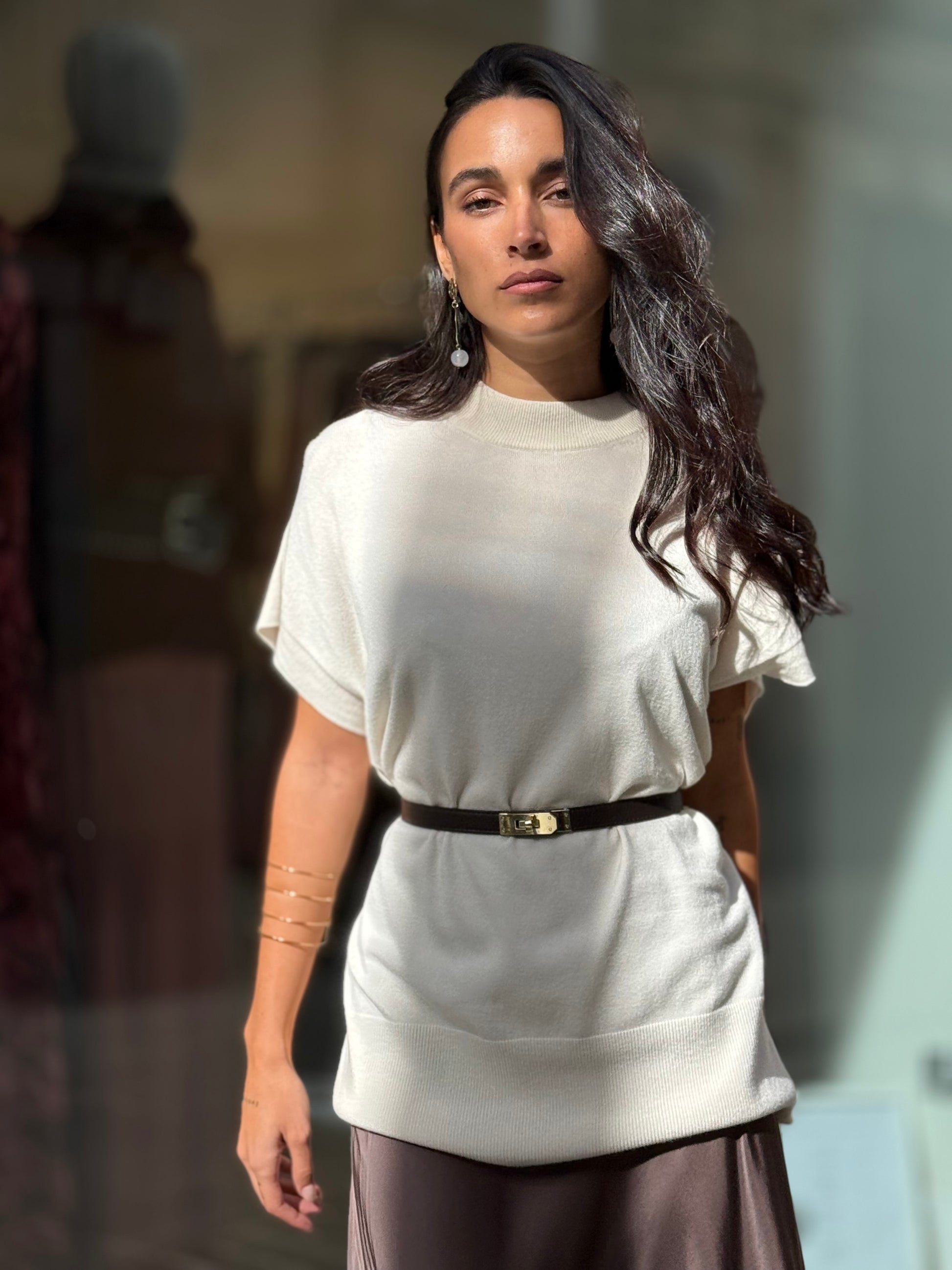 Jersey largo de punto fluido, agradable al tacto. La modelo mide 1,65 y usa talla 36.
