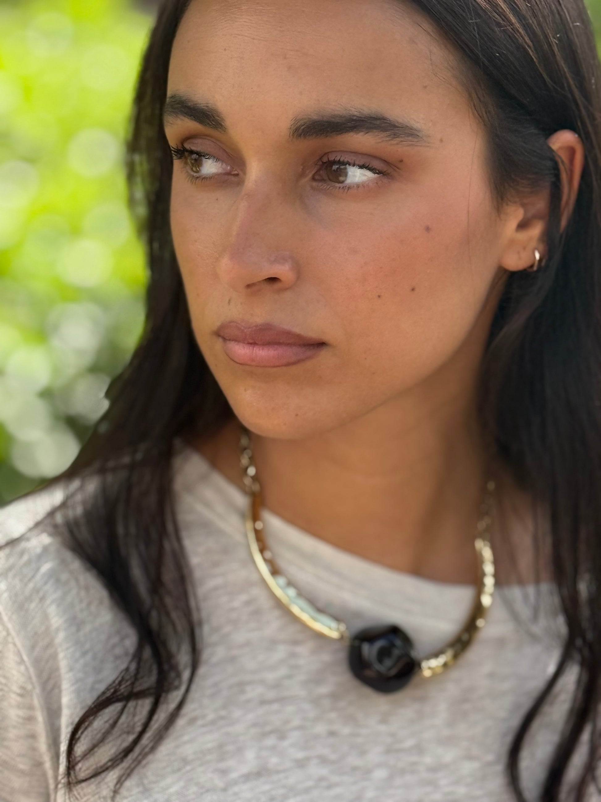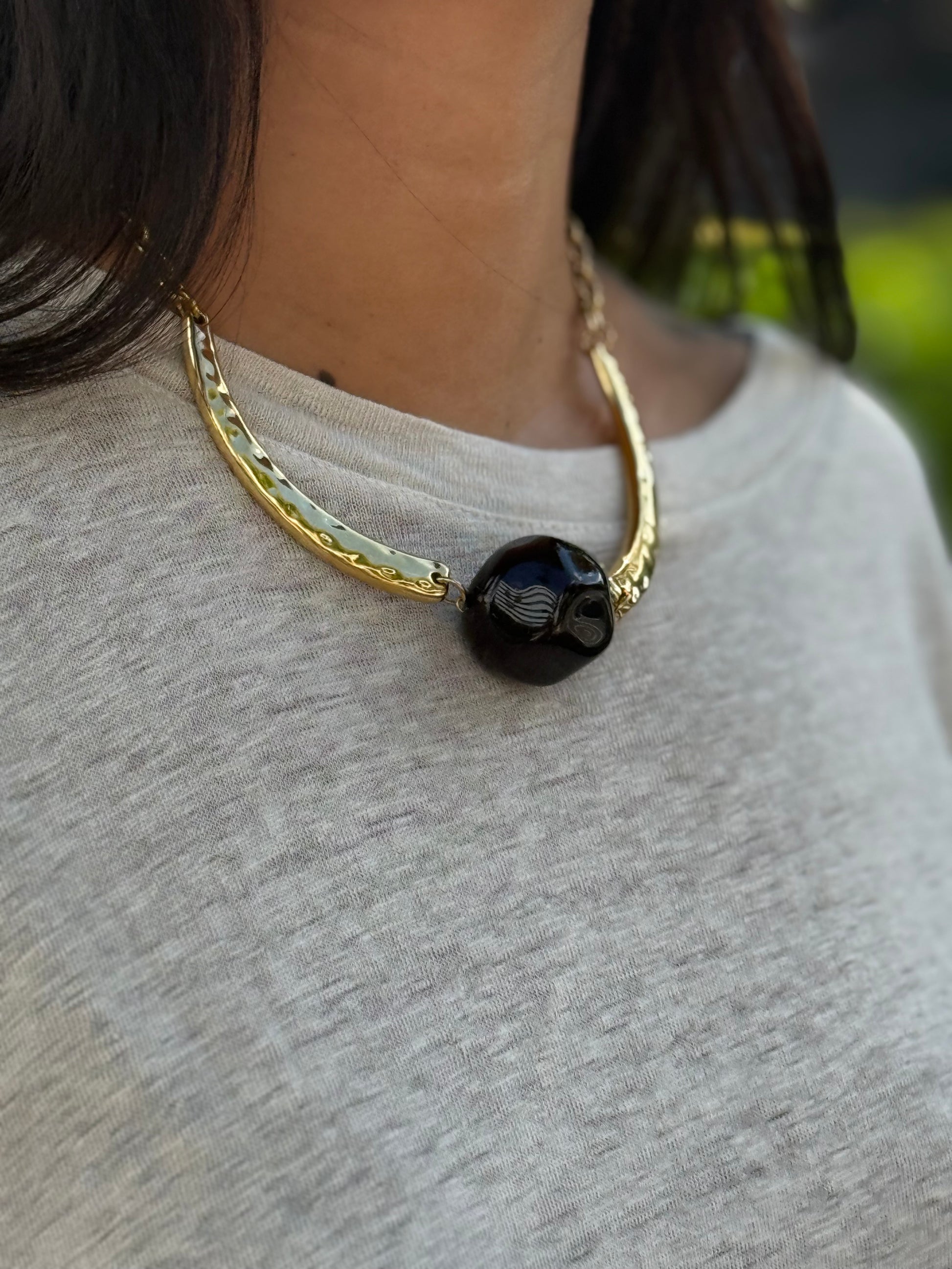 Collar de acero dorado de eslabones y colgante negro efecto carey.