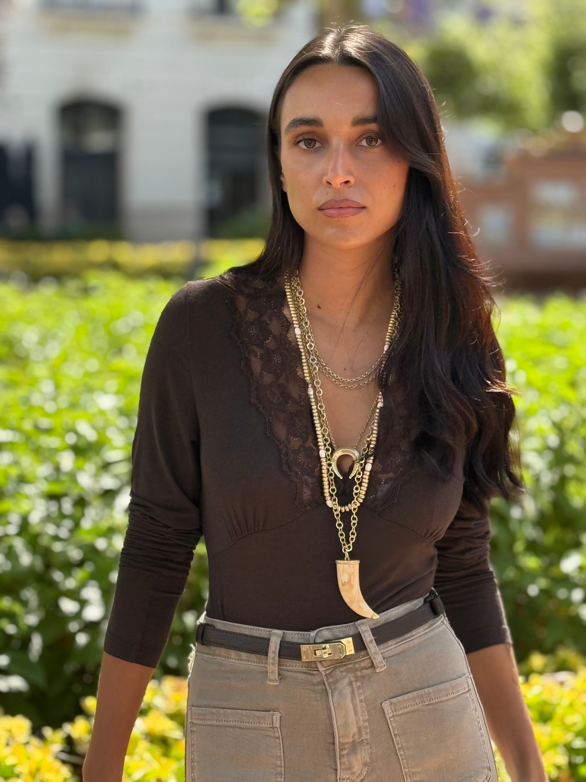 Multicollar de acero y colgantes efecto marfil.