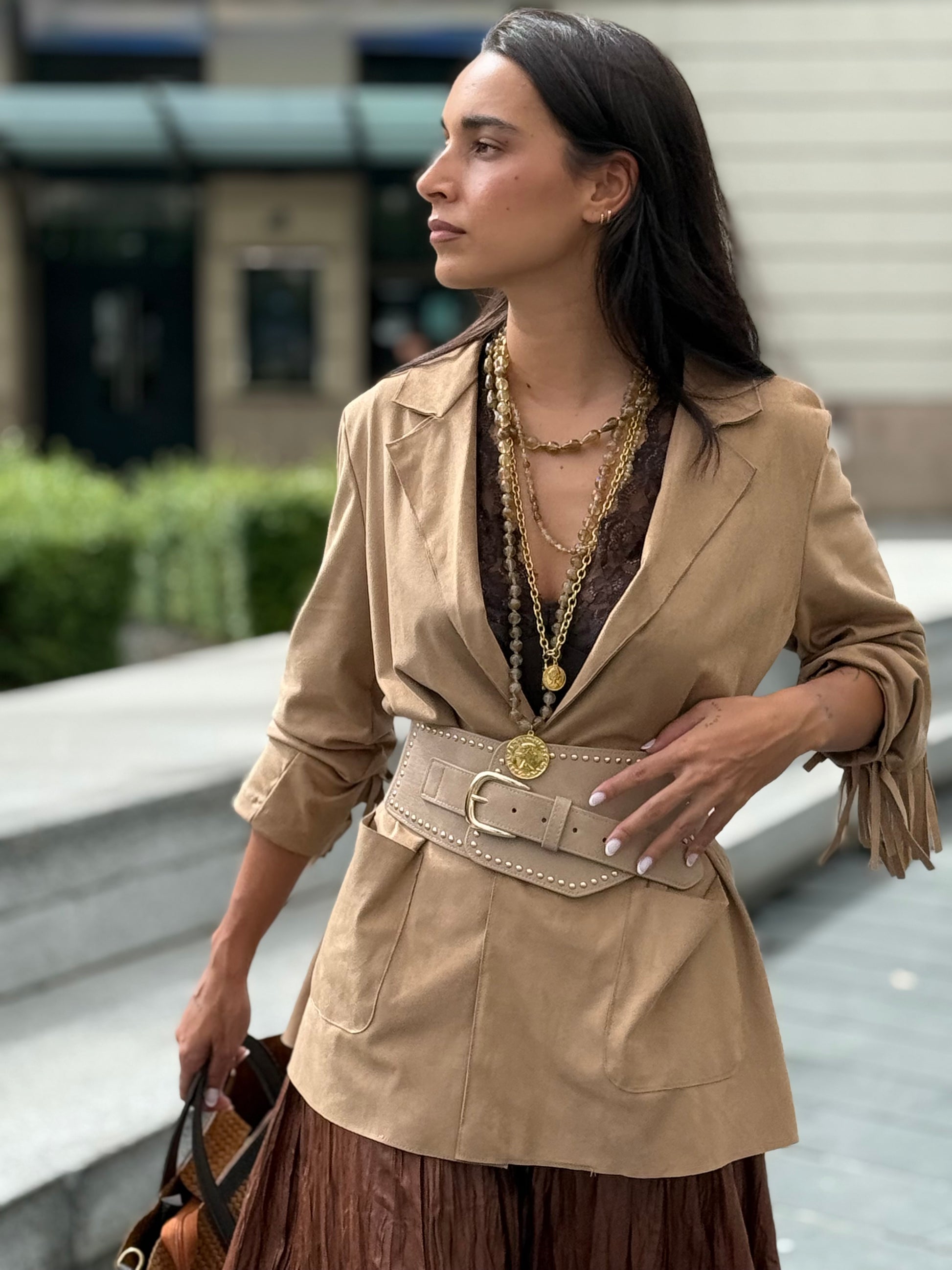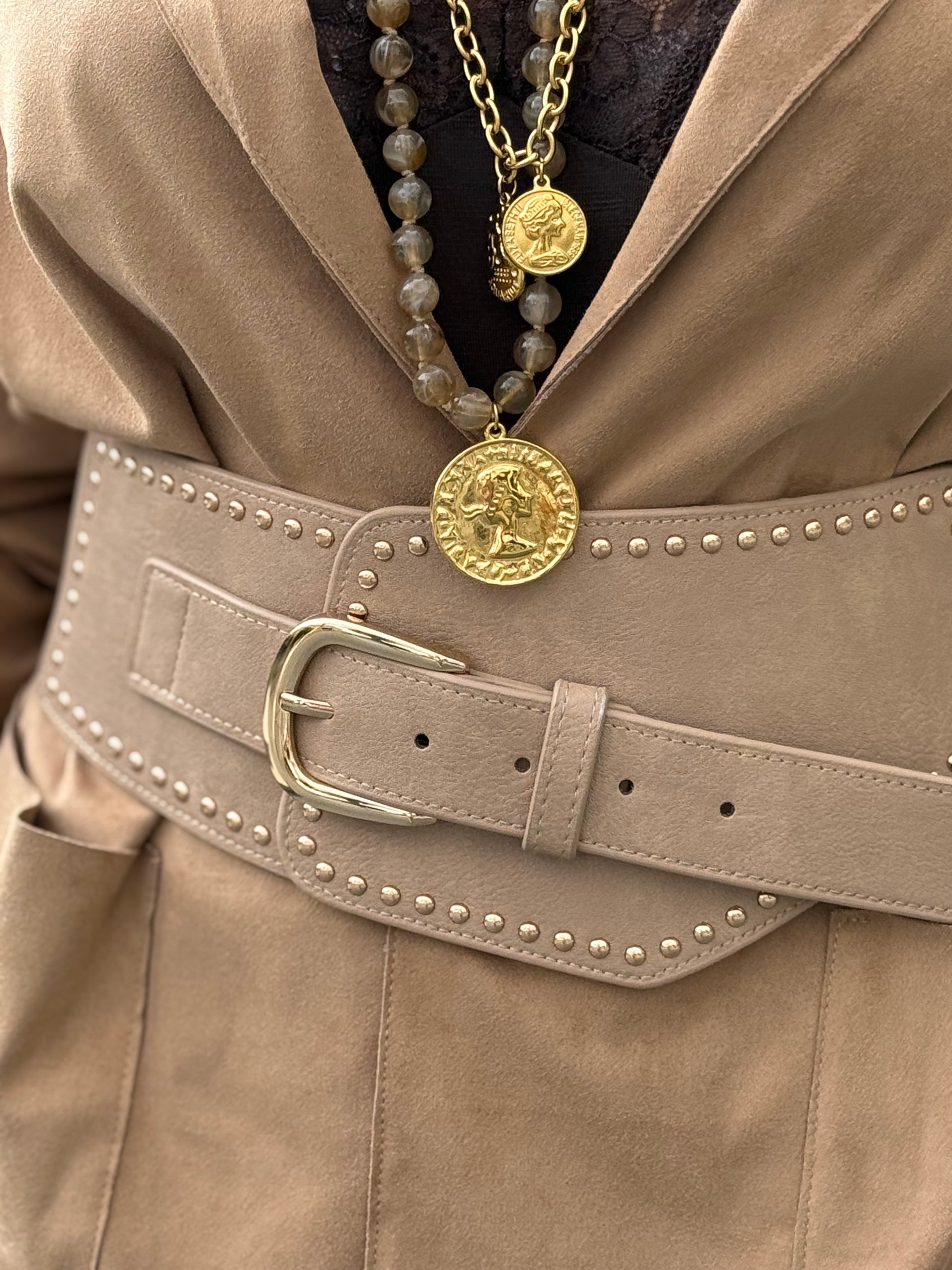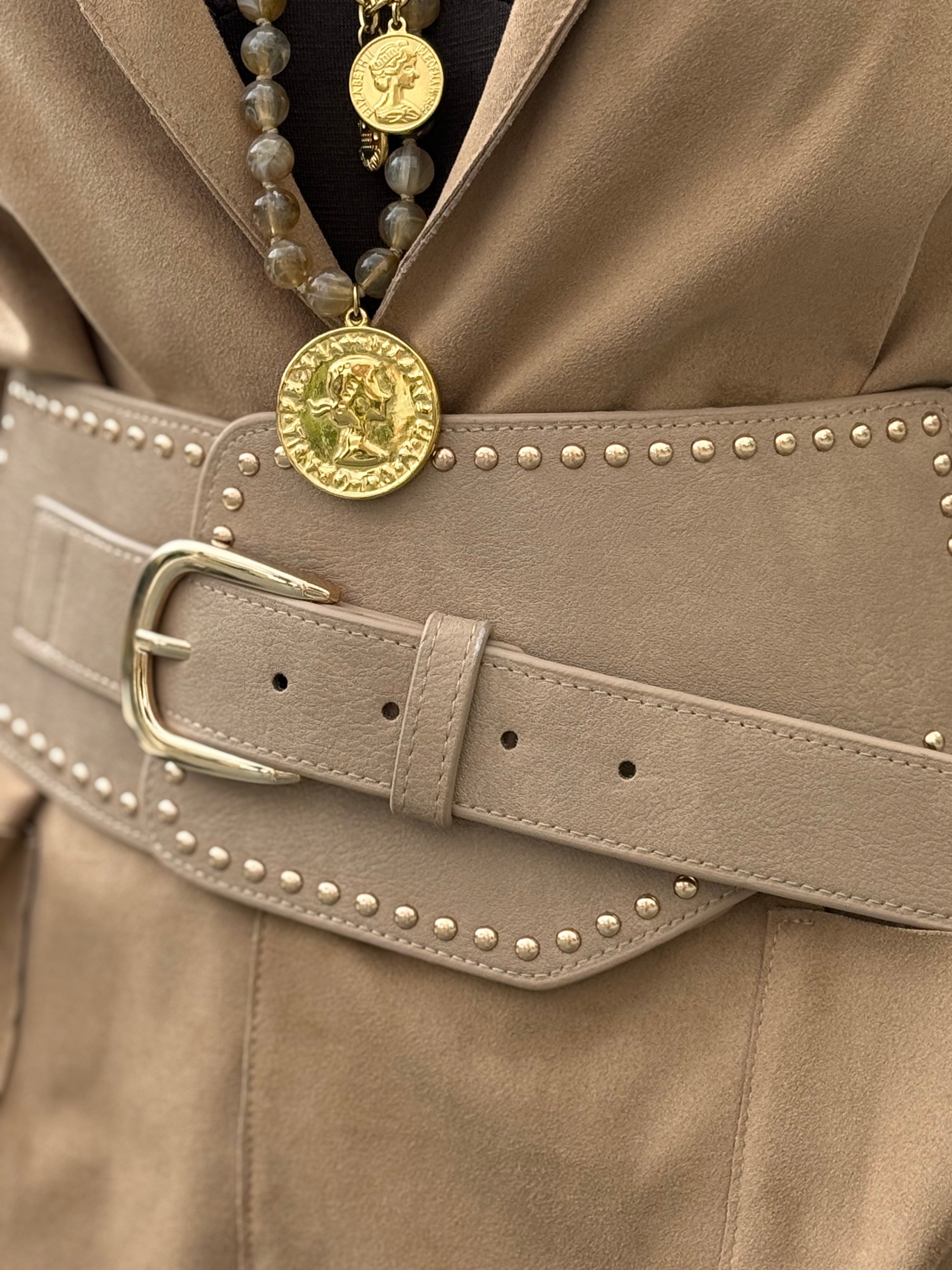 Fajín de ante elástico ajustable y tachas doradas con cierre de hebilla.