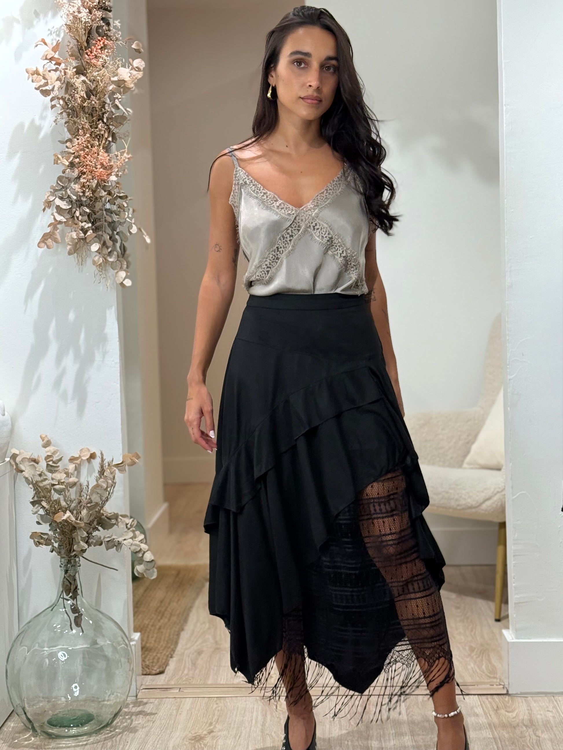 Falda de antelina, volantes, blonda de encaje en bajo con flecos y cierre de cremallera lateral invisible . La modelo mide 1,65 y usa talla 36 y lleva S.