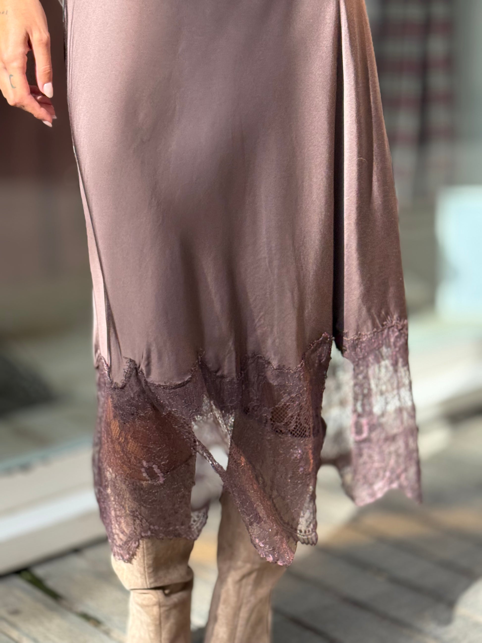 Falda satinada recta, elástico en cintura y detalle de blonda en bajo. La modelo mide 1.65 y usa talla S.