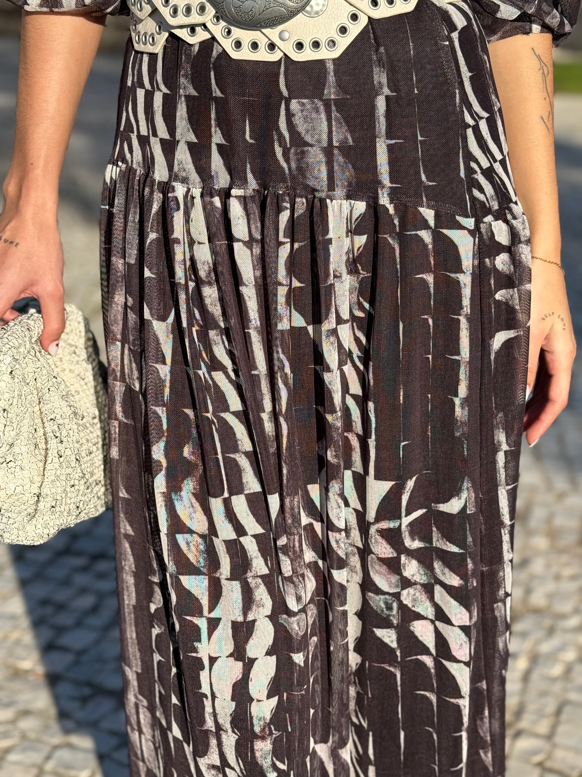 Falda fluida de tul estampada, elástico en cintura, forrito interior. La modelo mide 1,65 usa talla 36 y lleva S.