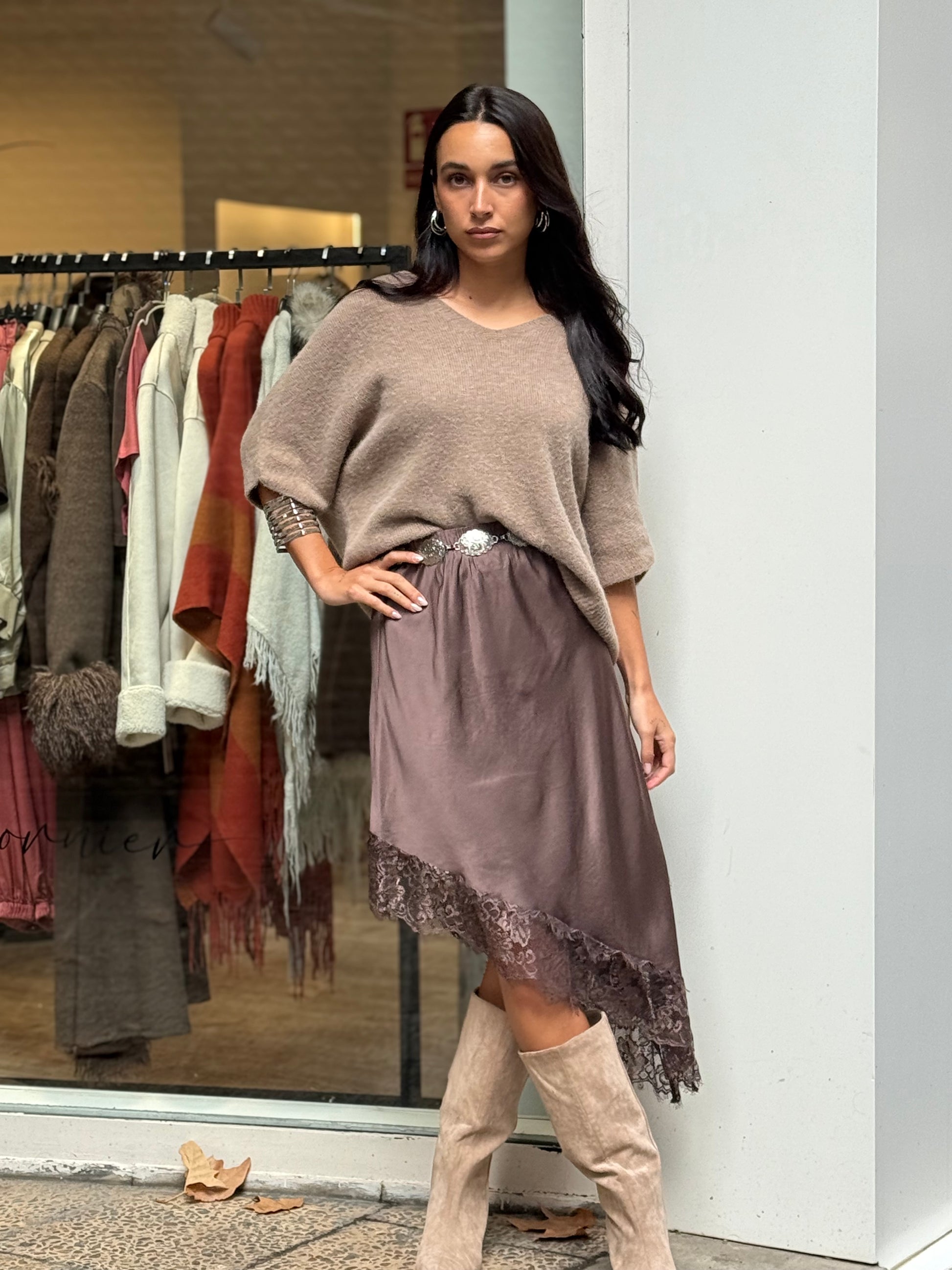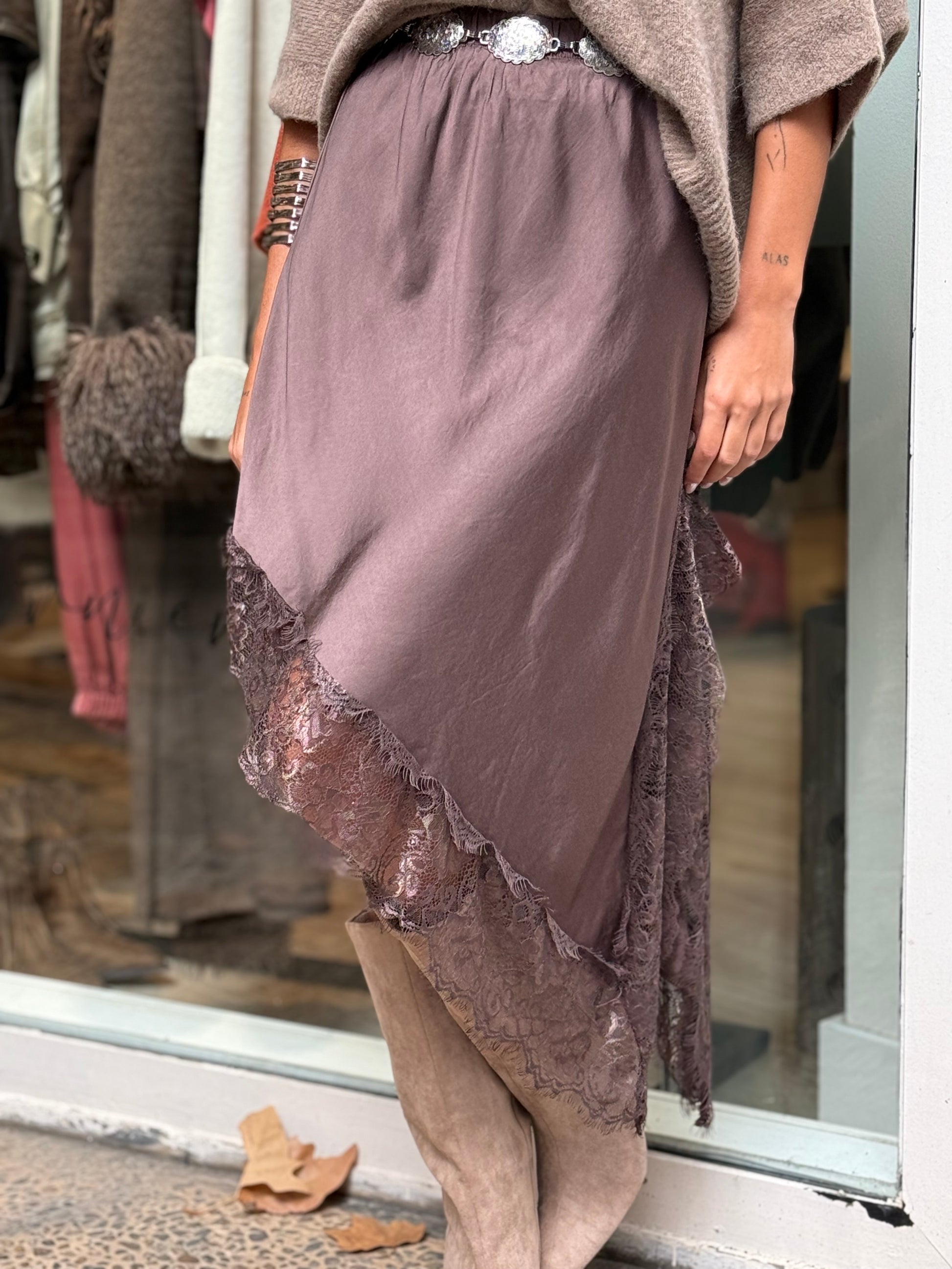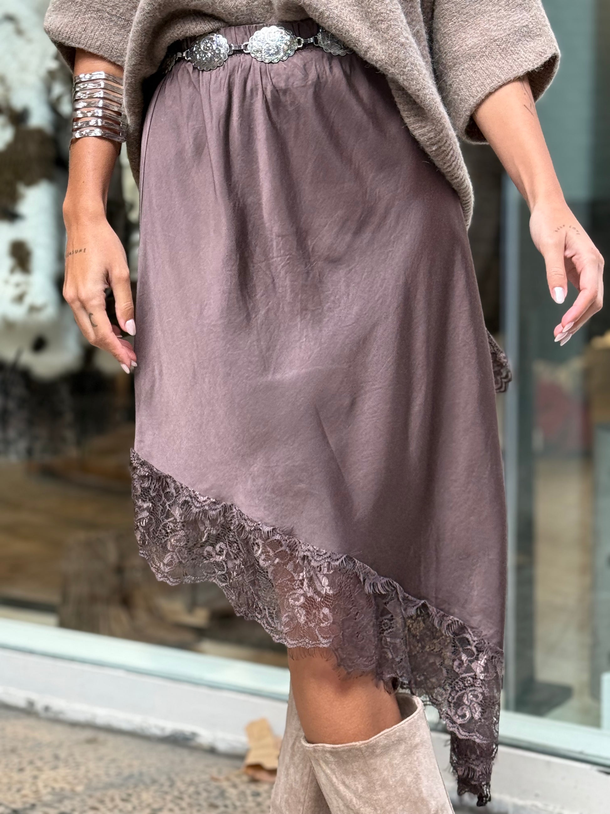 Falda satinada asimétrica, elástico en cintura y detalle de blonda en bajo. La modelo mide 1.65 y usa talla S.