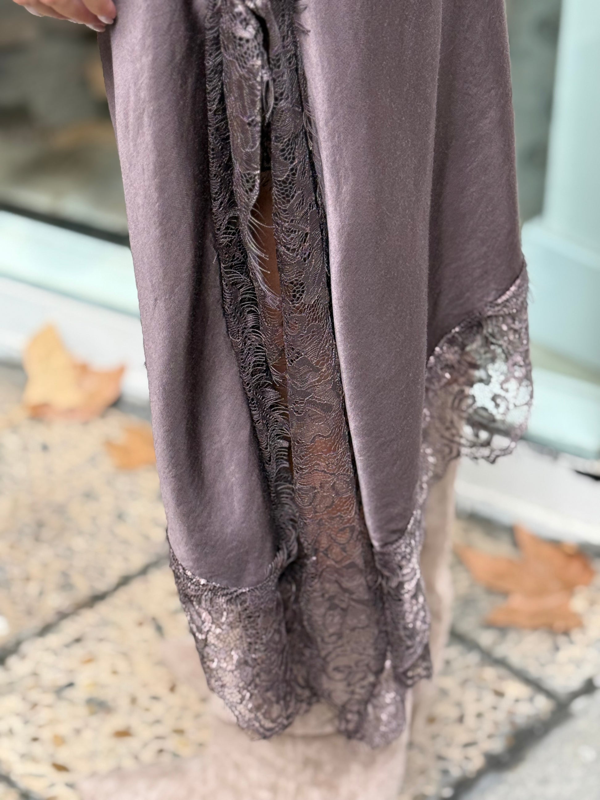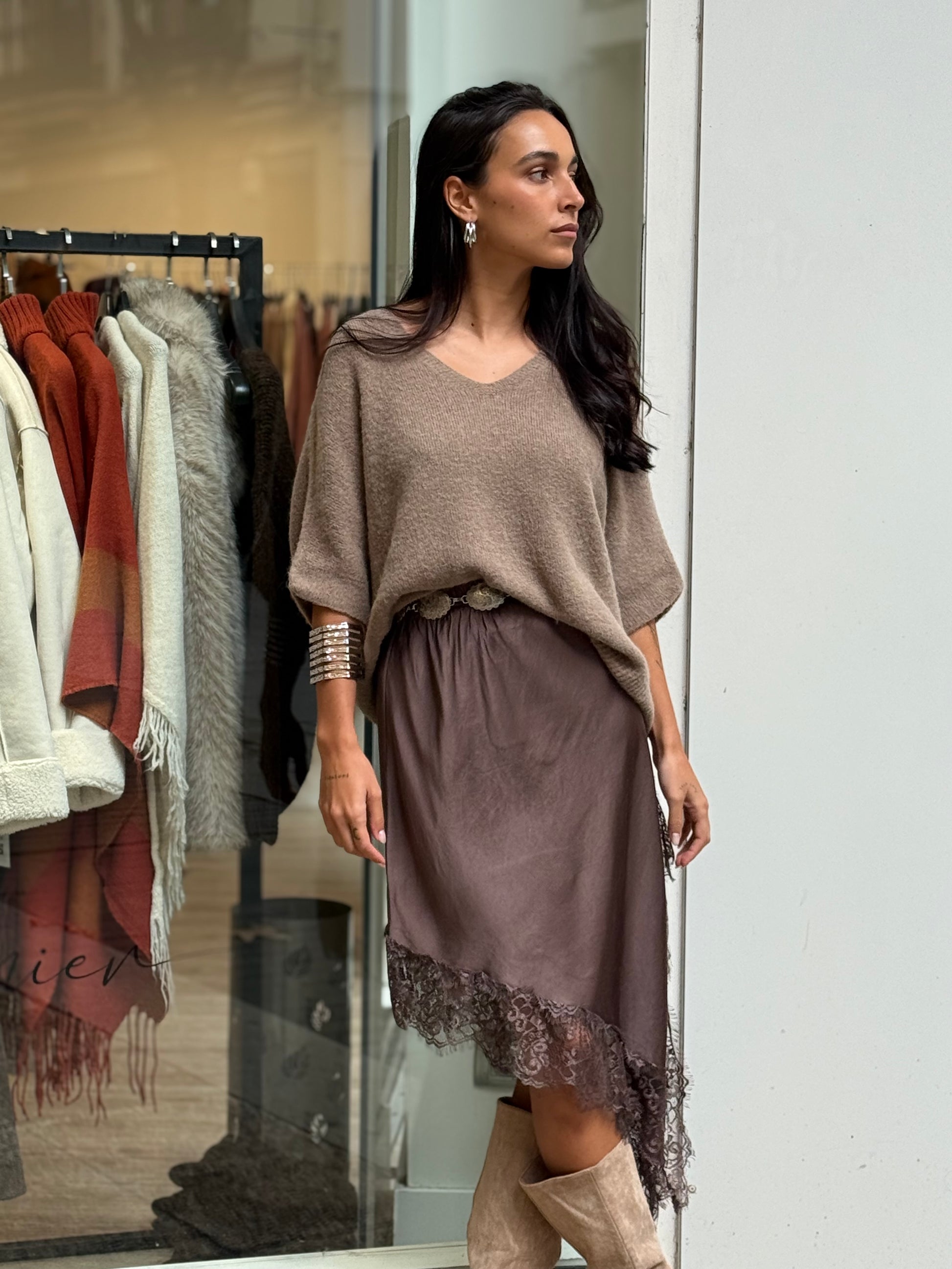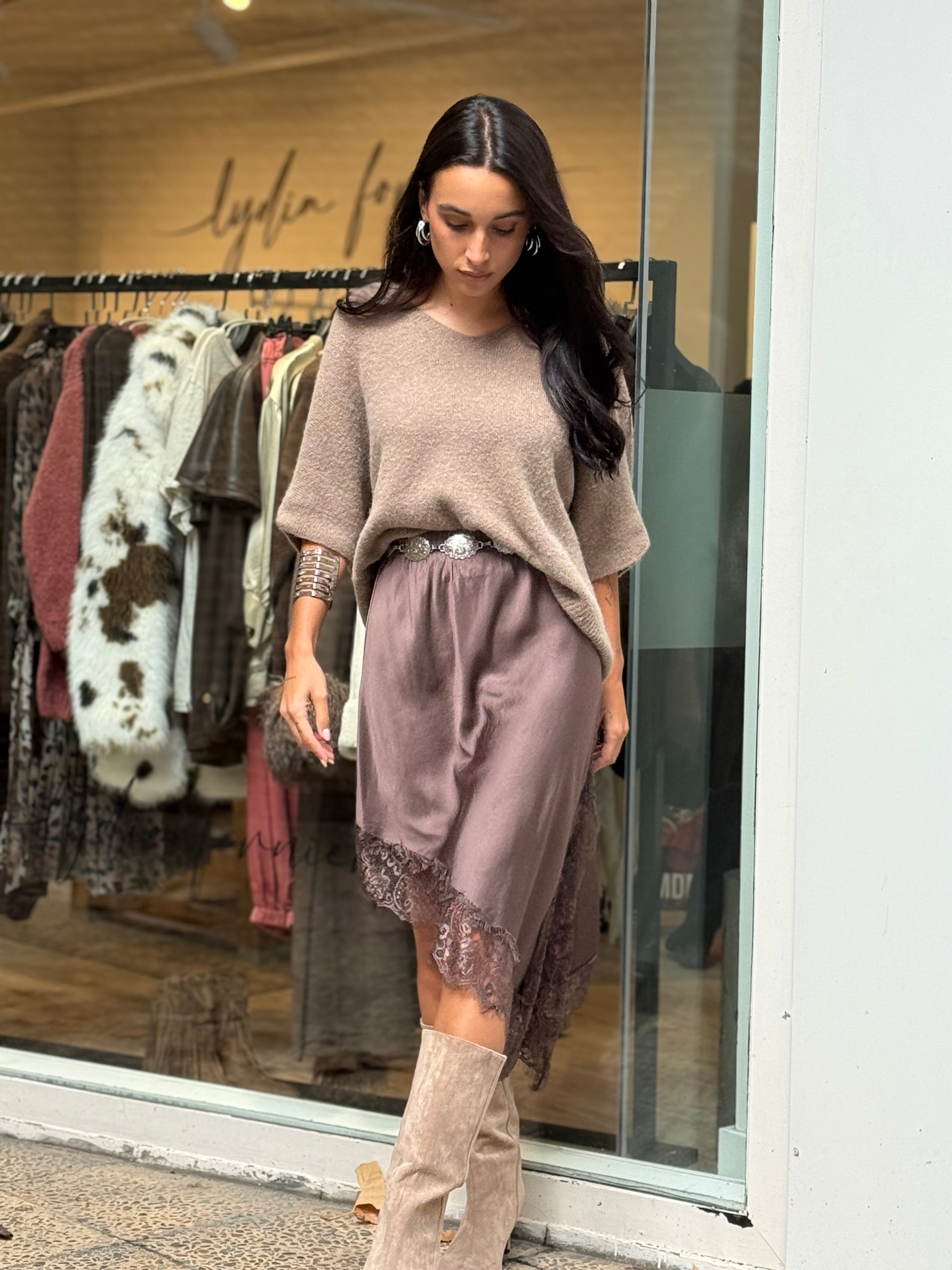 Falda satinada asimétrica, elástico en cintura y detalle de blonda en bajo. La modelo mide 1.65 y usa talla S.
