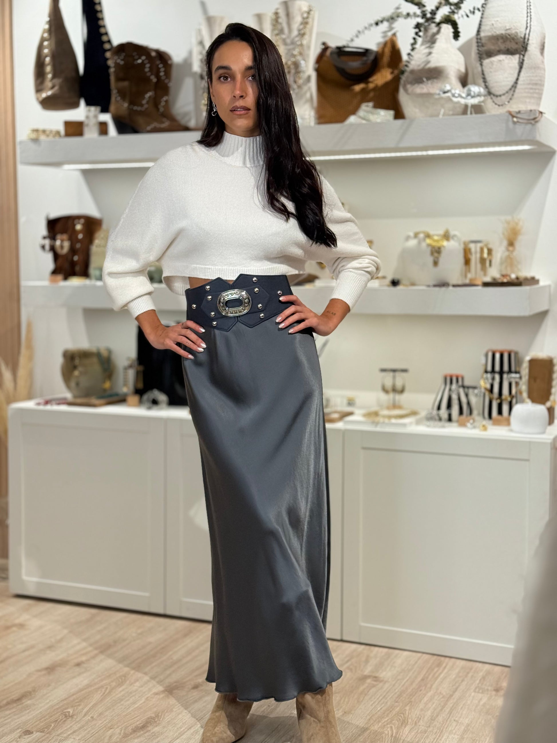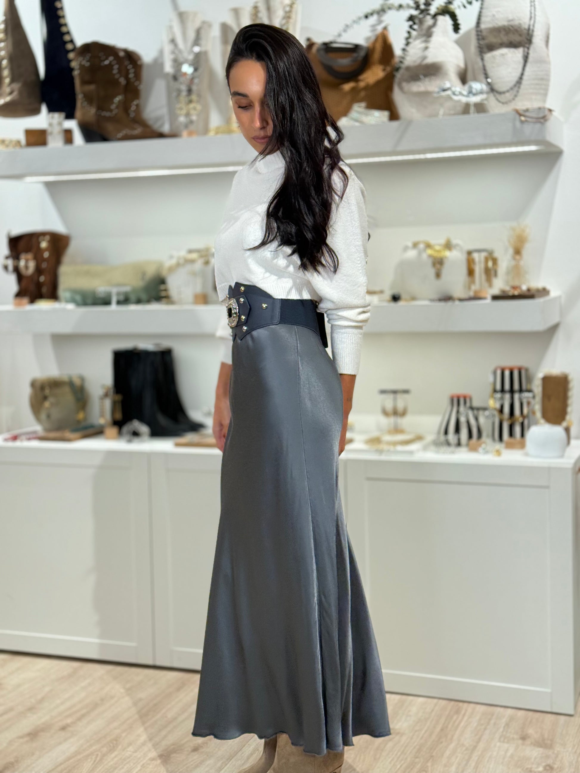 Falda larga satinada, elástico en cintura. La modelo mide 1.65 y usa talla S.