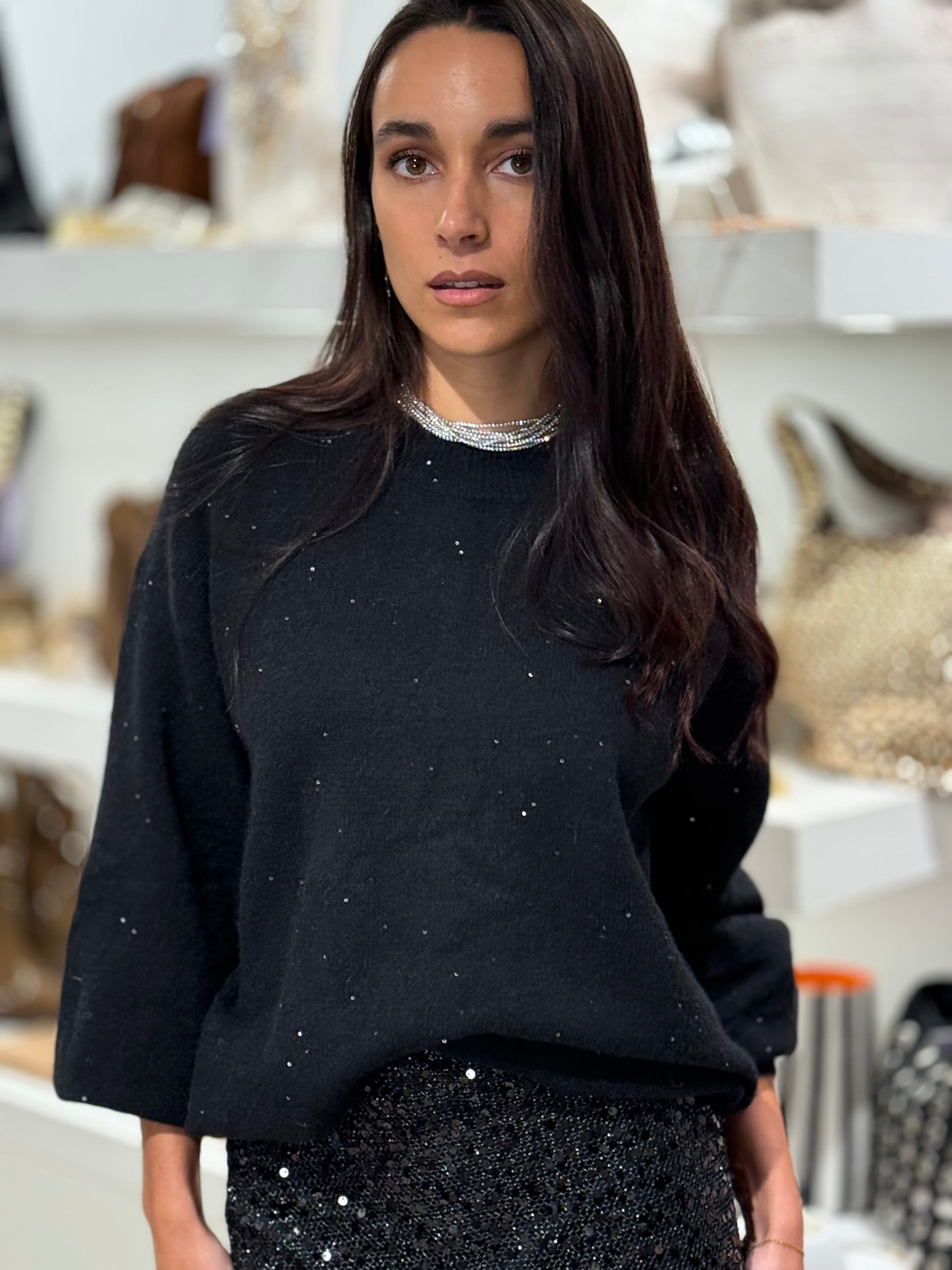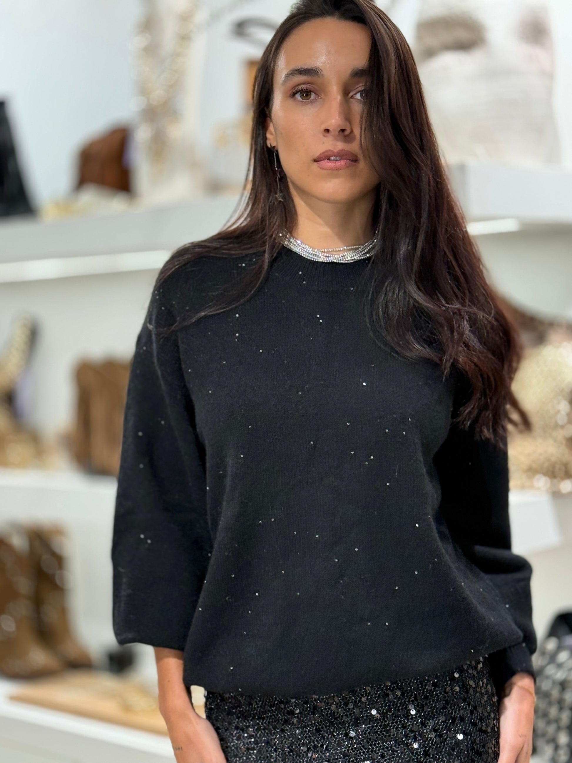 Jersey de punto flexible , cuello redondo, detalle de pailletes y agradable al tacto. Color negro. La modelo mide 1,65 y usa talla 36.