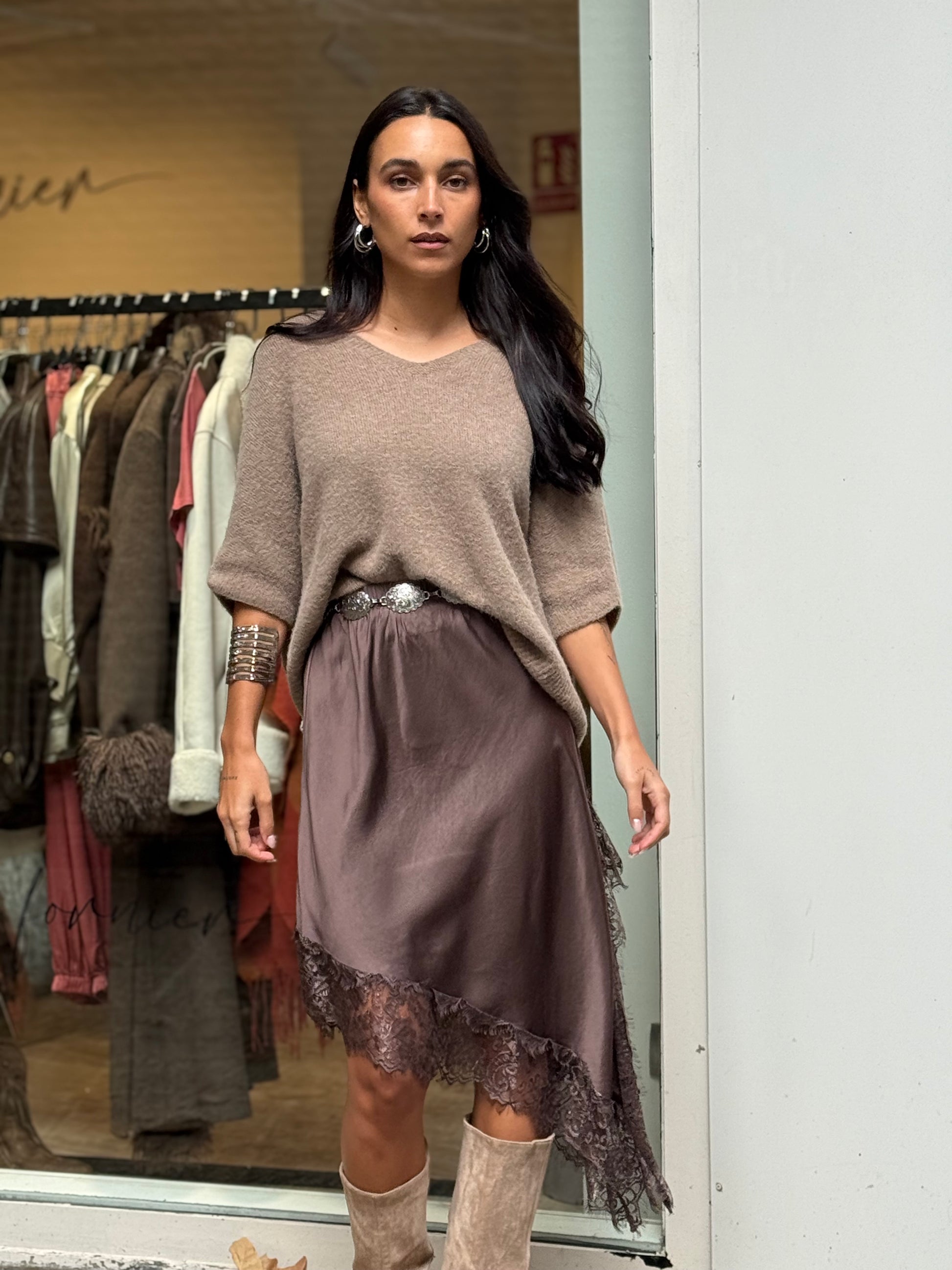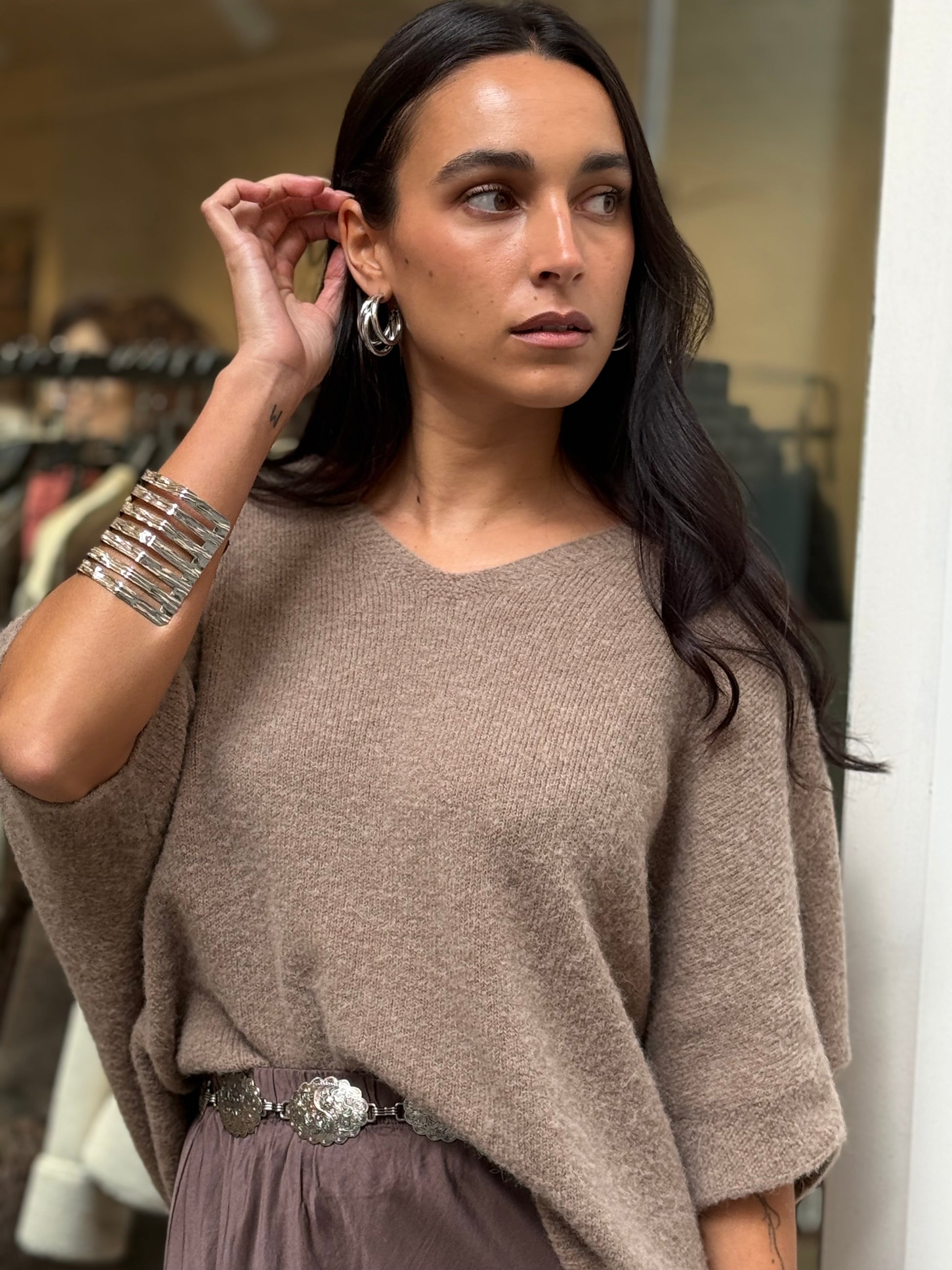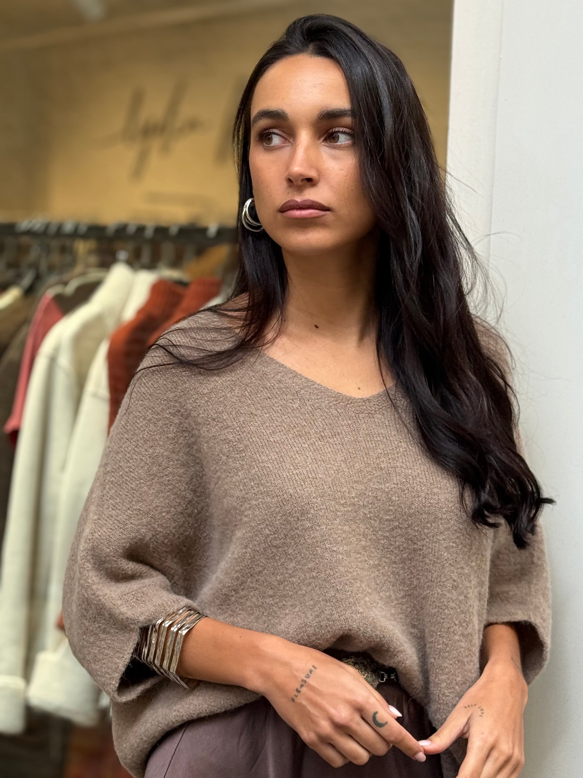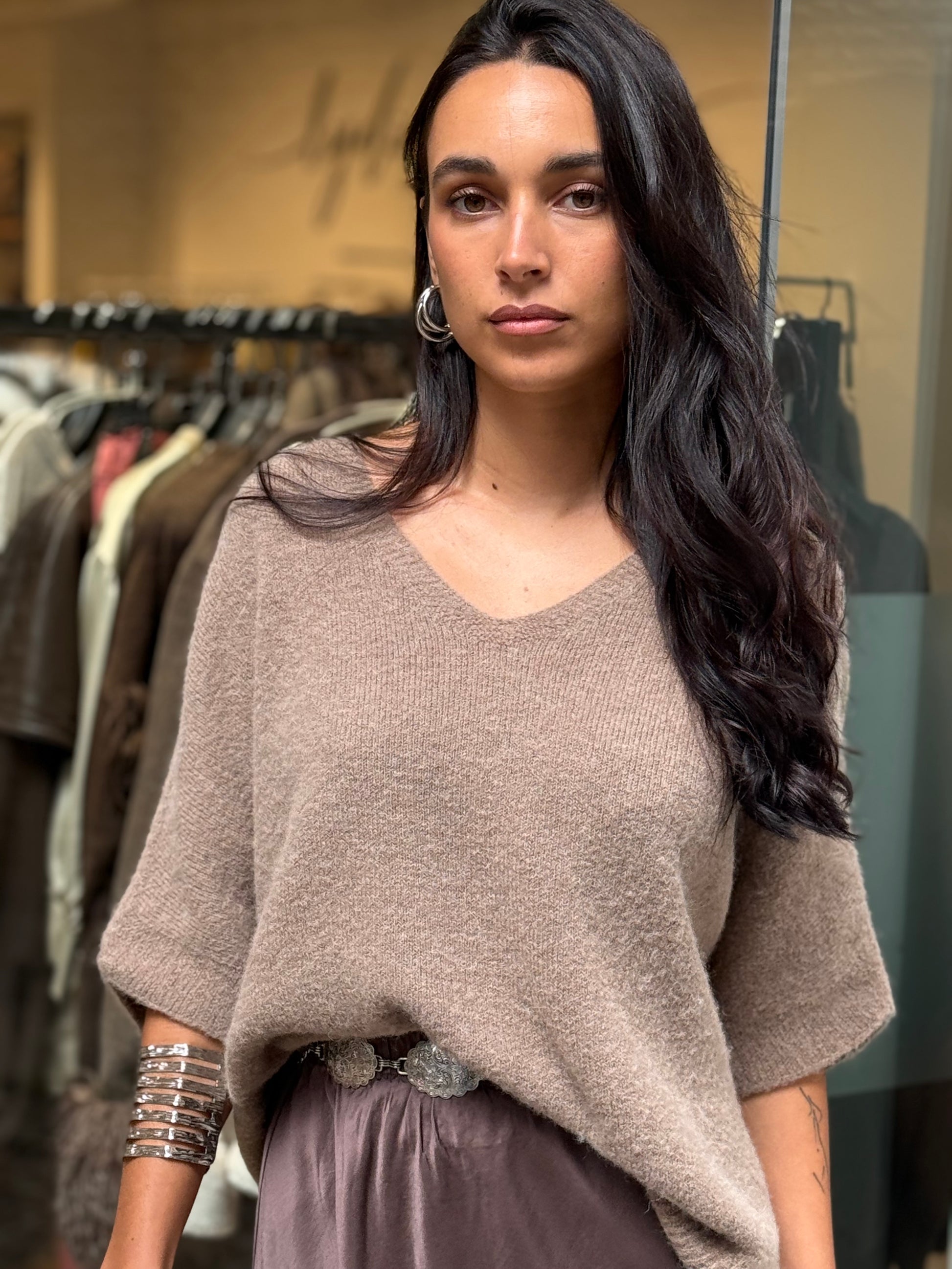Jersey de corte amplio y cuello en v, gustoso al tacto. La modelo mide 1,65 y usa talla 36.