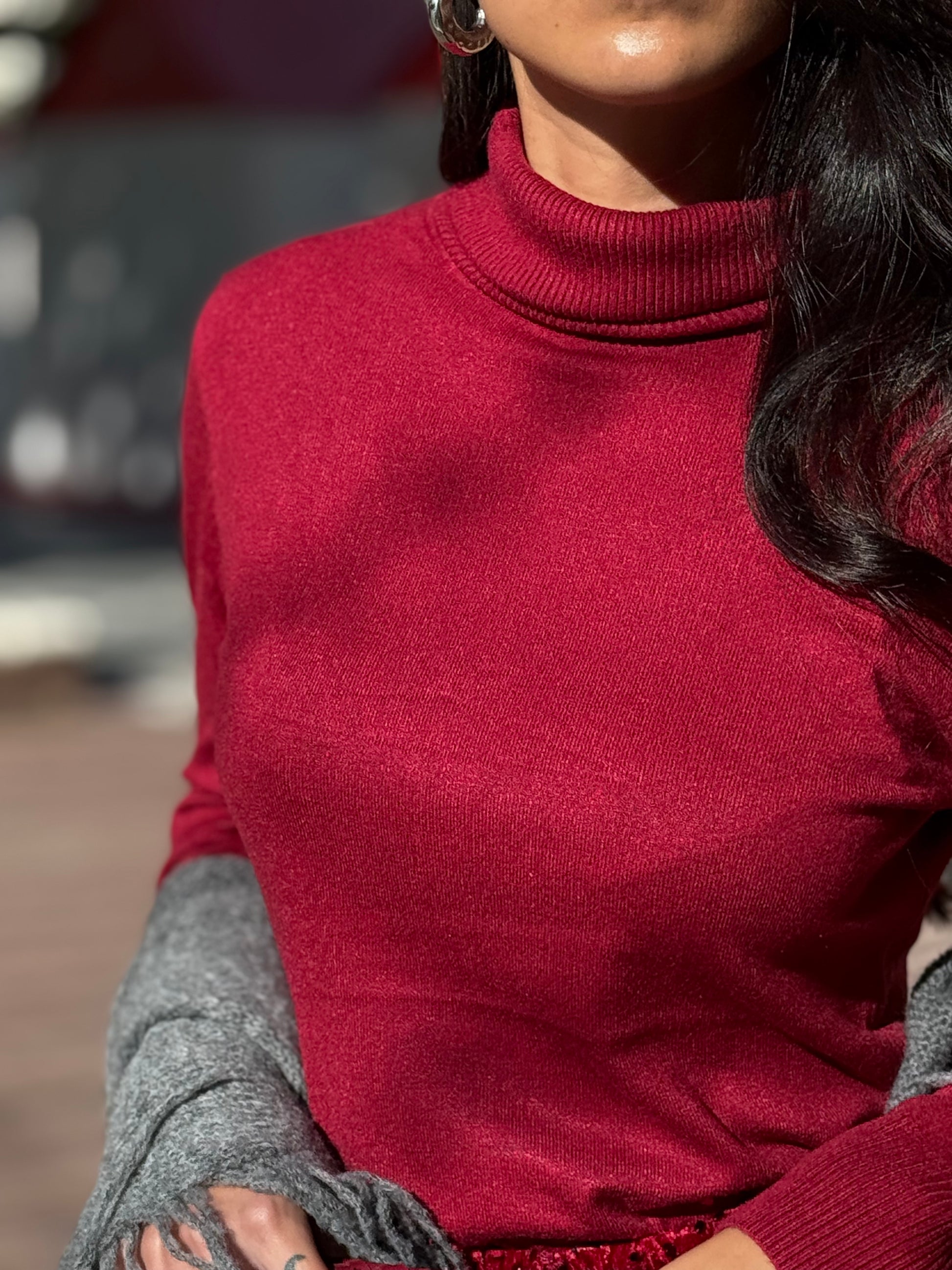 Jersey de punto flexible , cuello vuelto agradable al tacto. Color rojo oscuro. La modelo mide 1,65 y usa talla 36.
