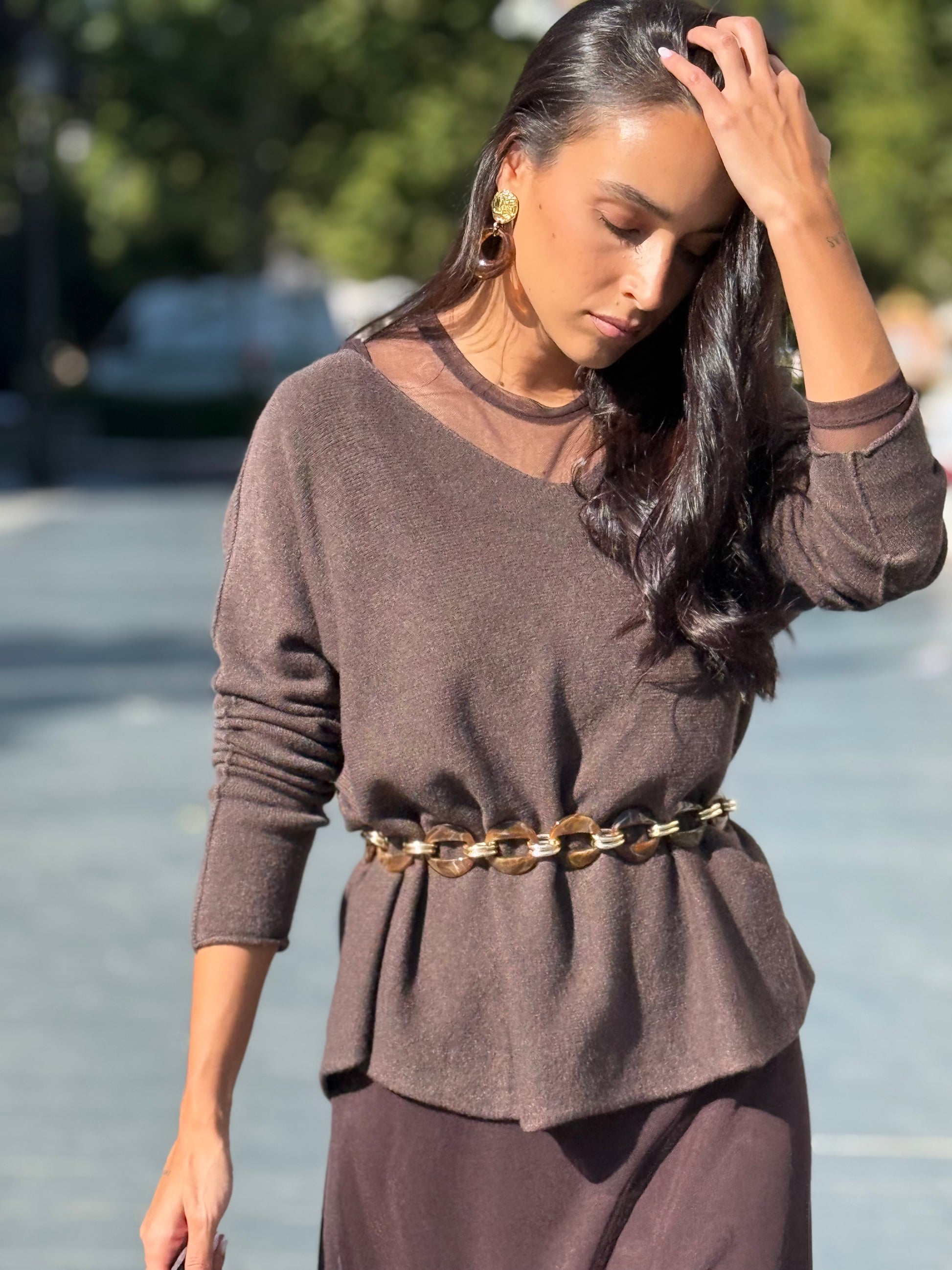 Jersey de punto, escote en V muy gustoso al tacto. La modelo mide 1,65 y usa talla 36.