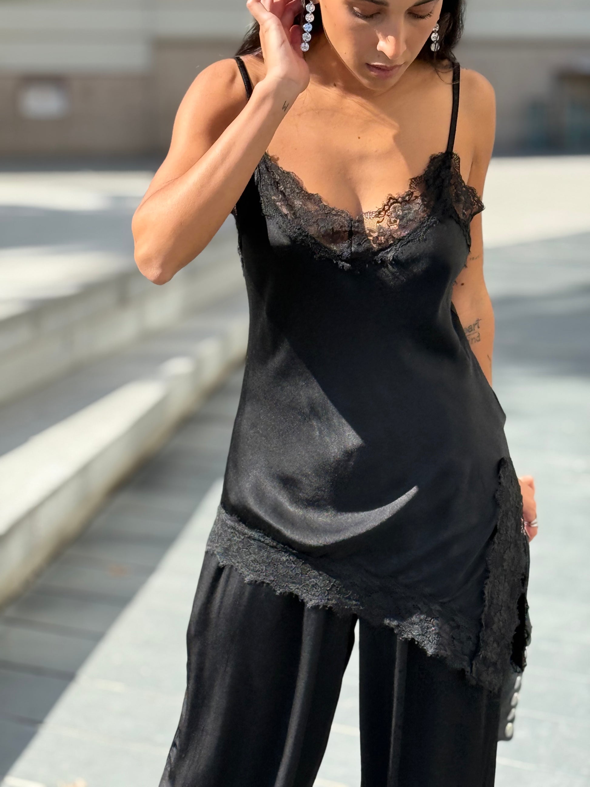 Top lencero asimétrico, escote en V, elástico en espalda y detalle de encaje. La modelo mide 1,65 usa talla 36.