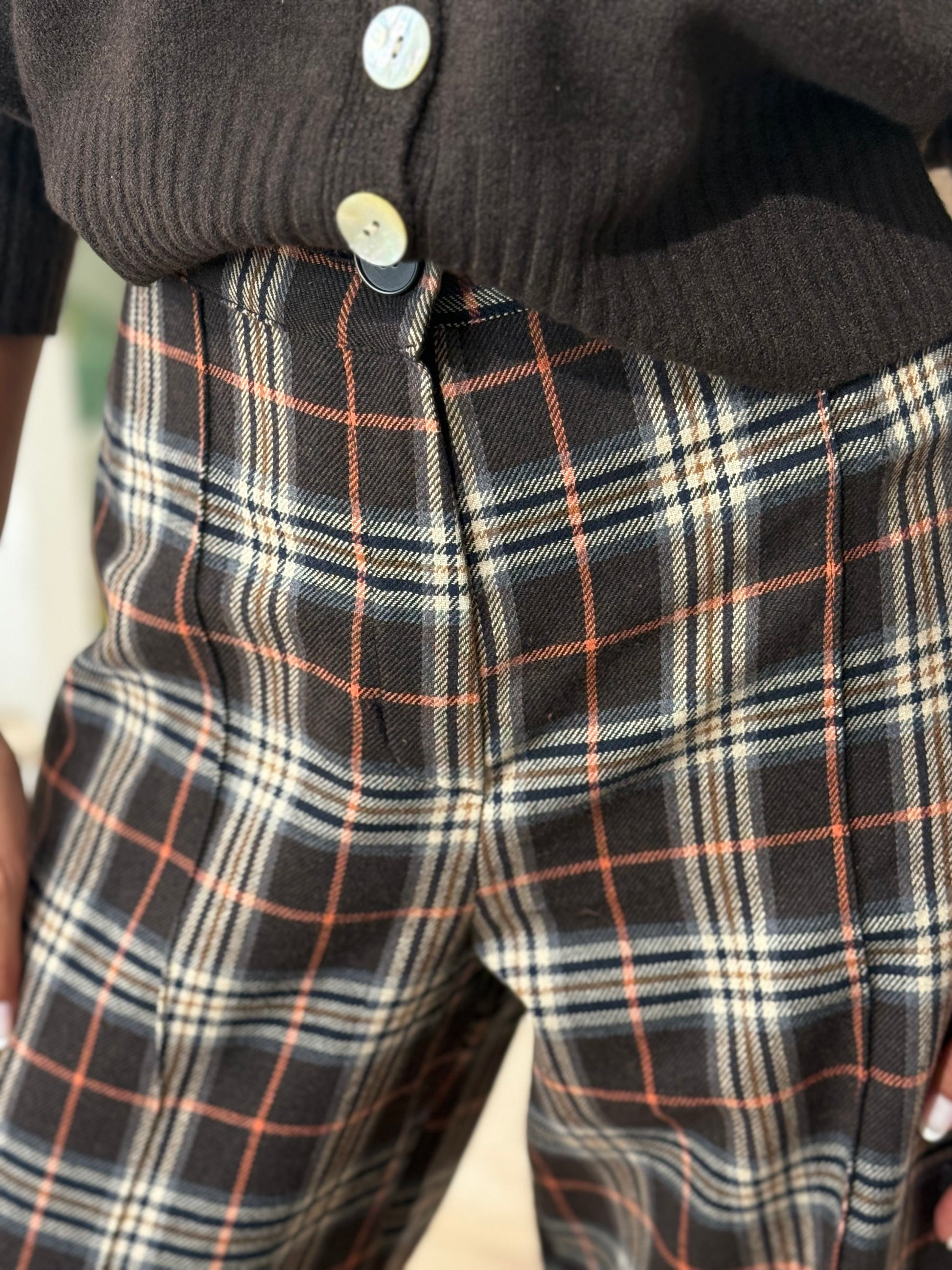 Pantalón recto de algodón de cuadros, elástico en cintura bolsillos traseros simulados y cierre de cremallera y botón. La modelo mide 1,65 y usa talla 36 y lleva talla S.