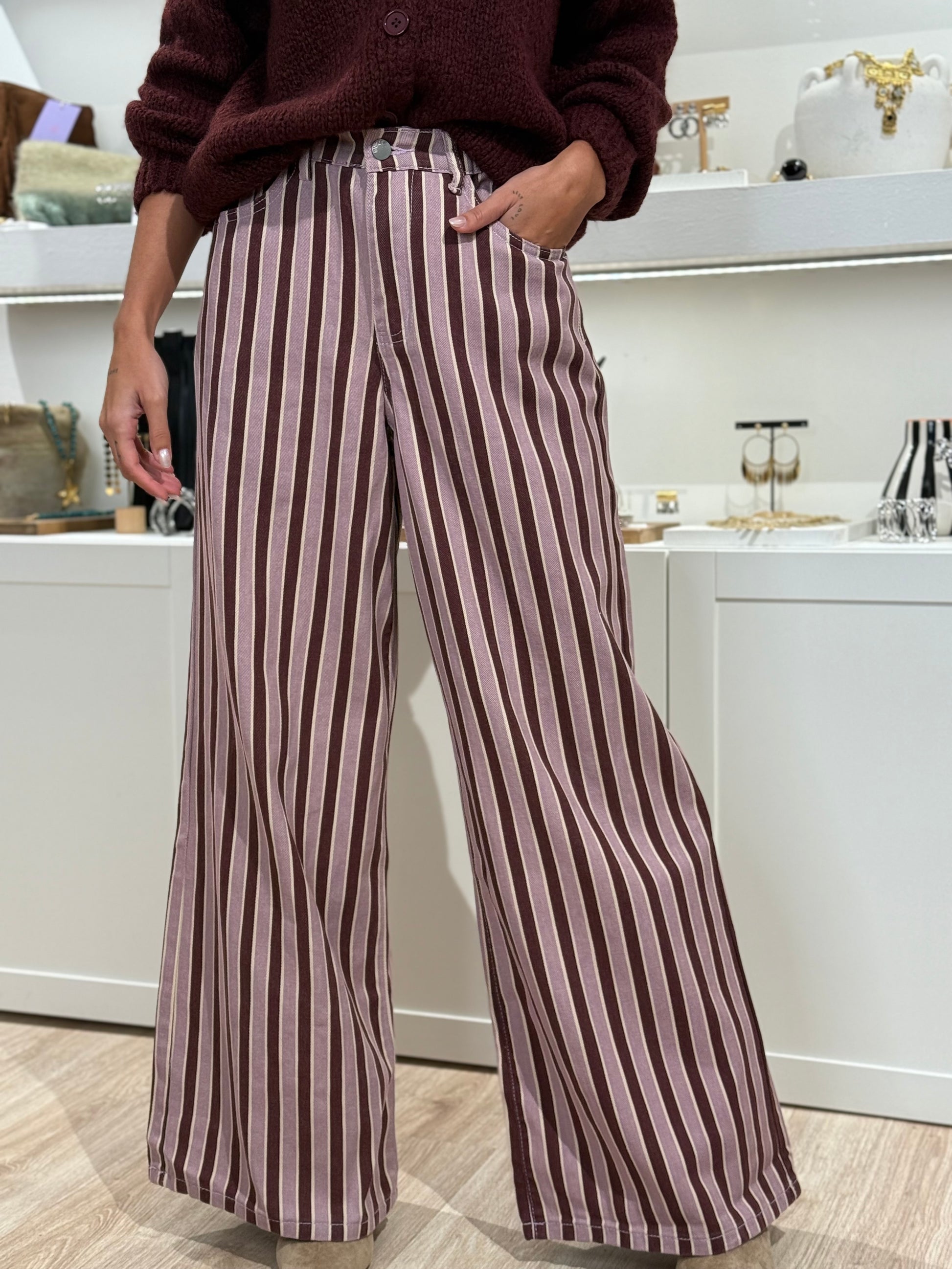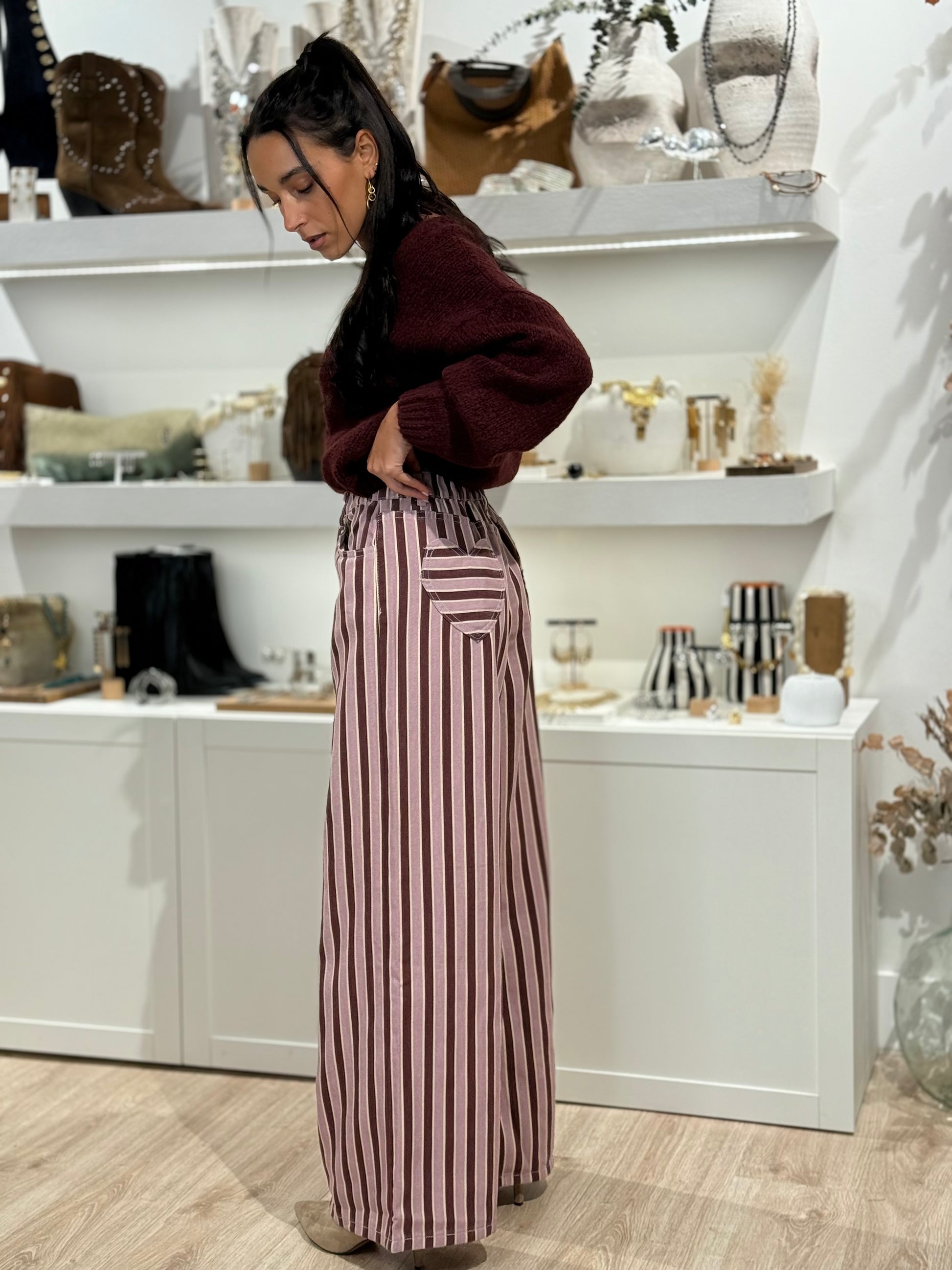 Pantalón de rayas, elástico en cintura, cierre de botón en cremallera y bolsillos laterales y traseros estos últimos en forma de corazón. La modelo mide 1,67 usa talla 36 y lleva talla S.