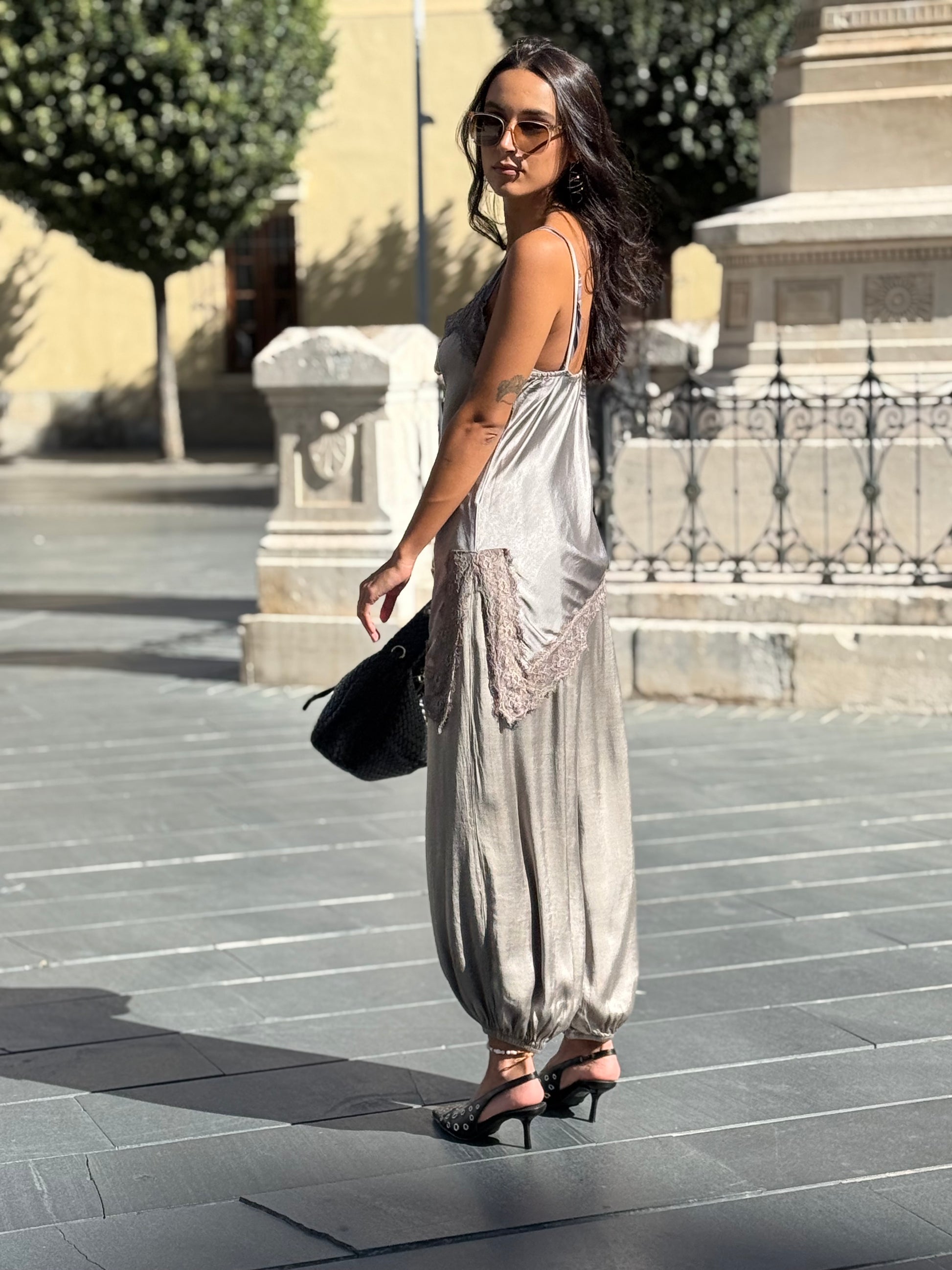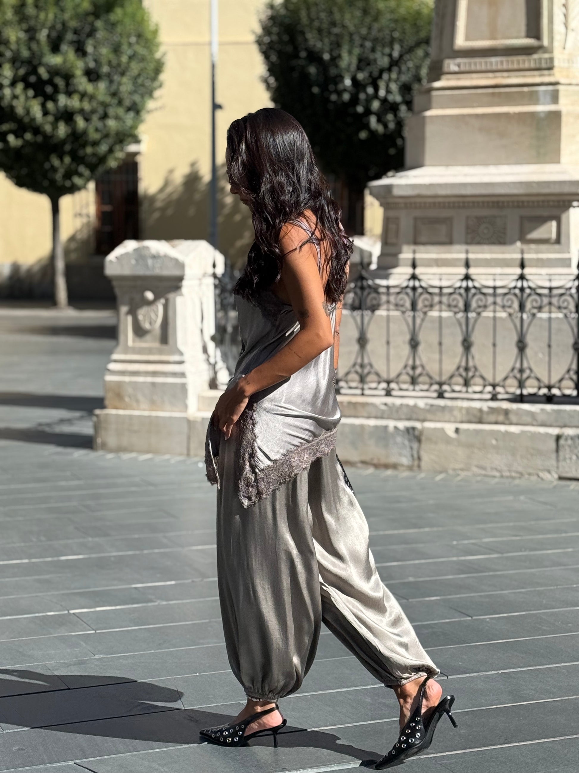 Pantalón bombacho fluido satinado, bolsillos laterales, elástico en cintura y tobillos. La modelo mide 1,65 y usa talla 36 y lleva talla S.