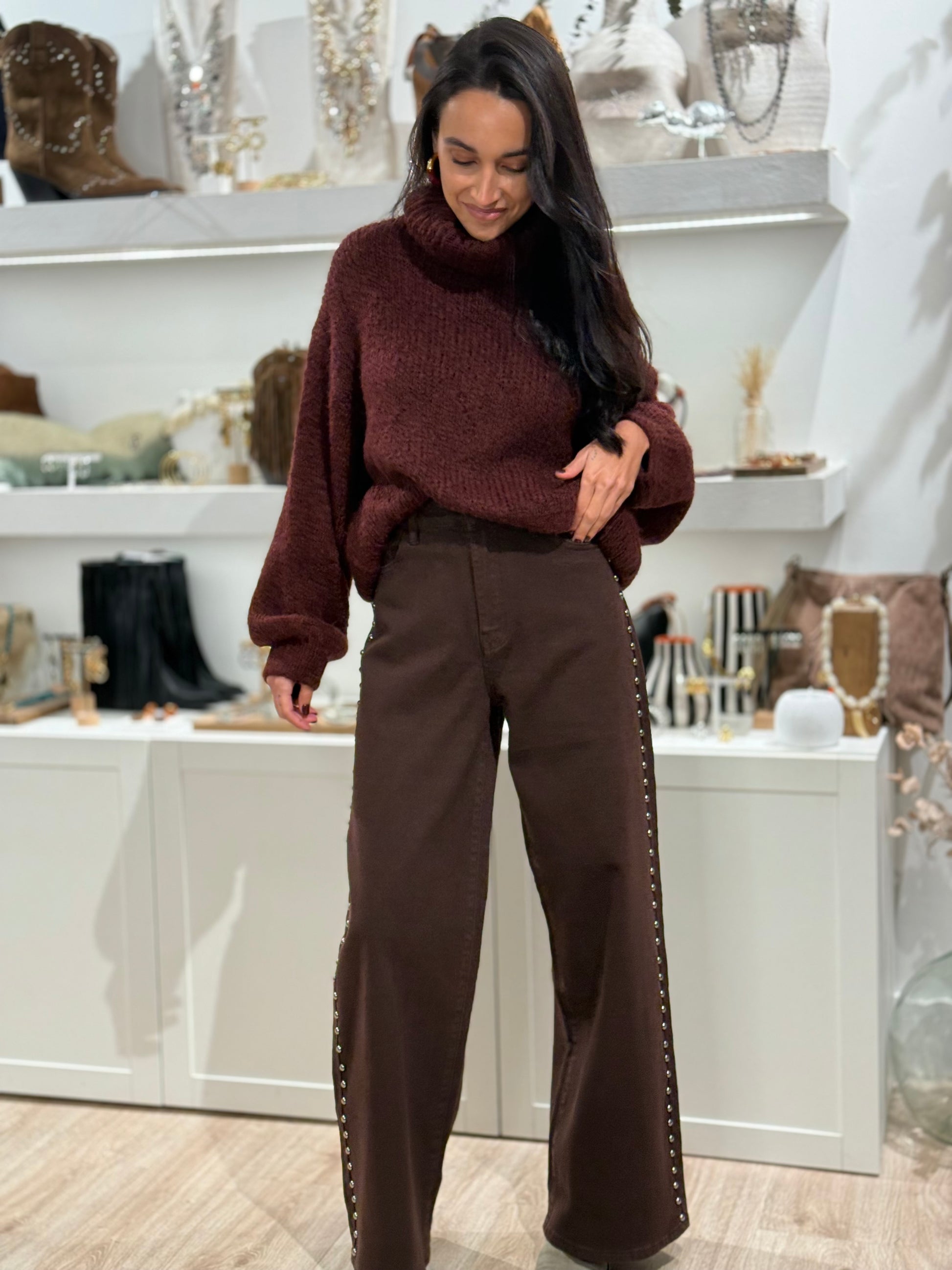 Pantalón de corte recto, tiro alto, cierre de botón en cremallera y bolsillos laterales y traseros. La modelo mide 1,65 usa talla 36 y lleva talla S.