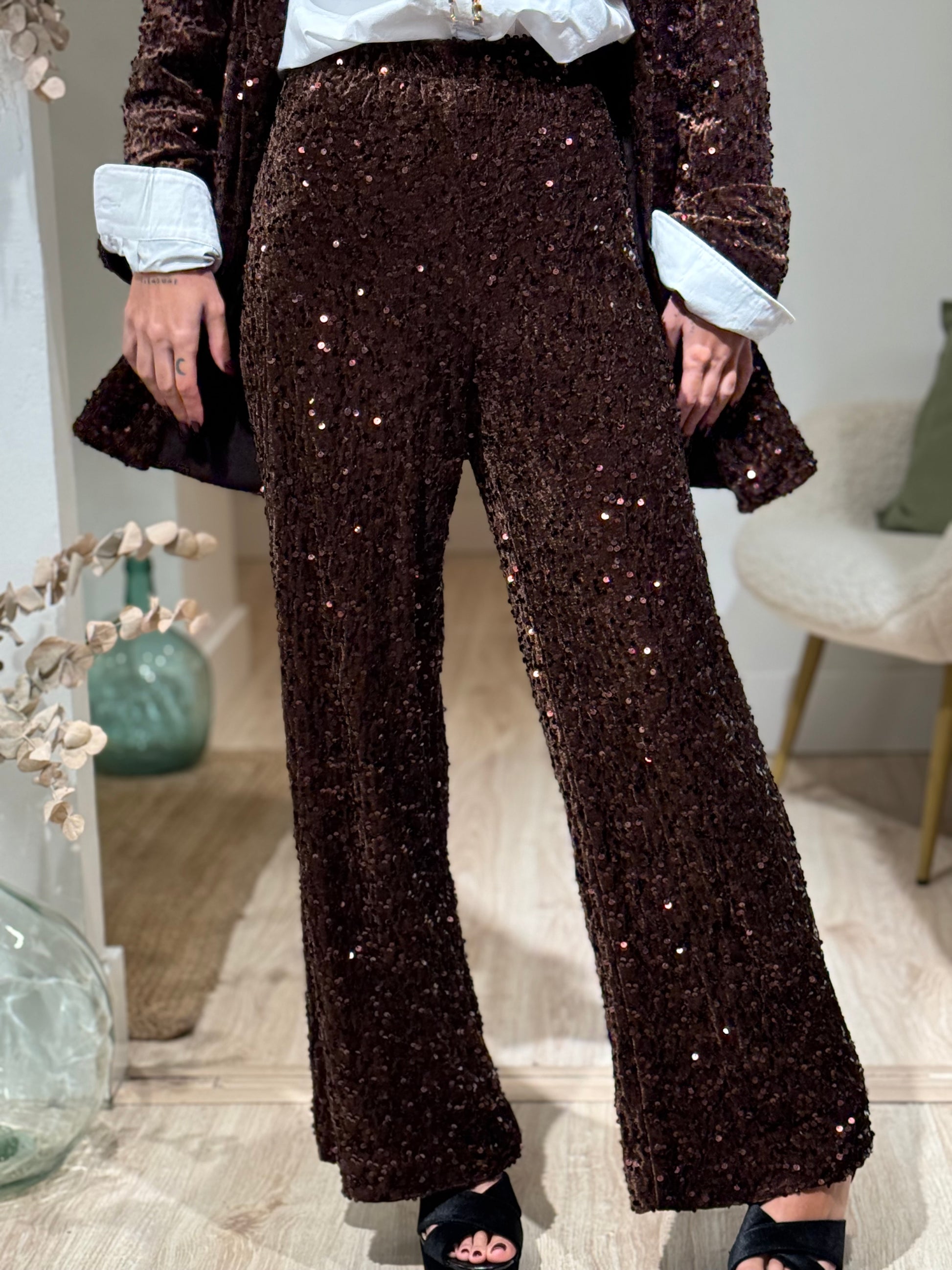 Pantalón de terciopelo y paillet, tiro alto y corte recto, forrado interior, elástico en cintura. Color terciopelo y lentejuelas marrón. La modelo mide 1,65 y usa talla 36.