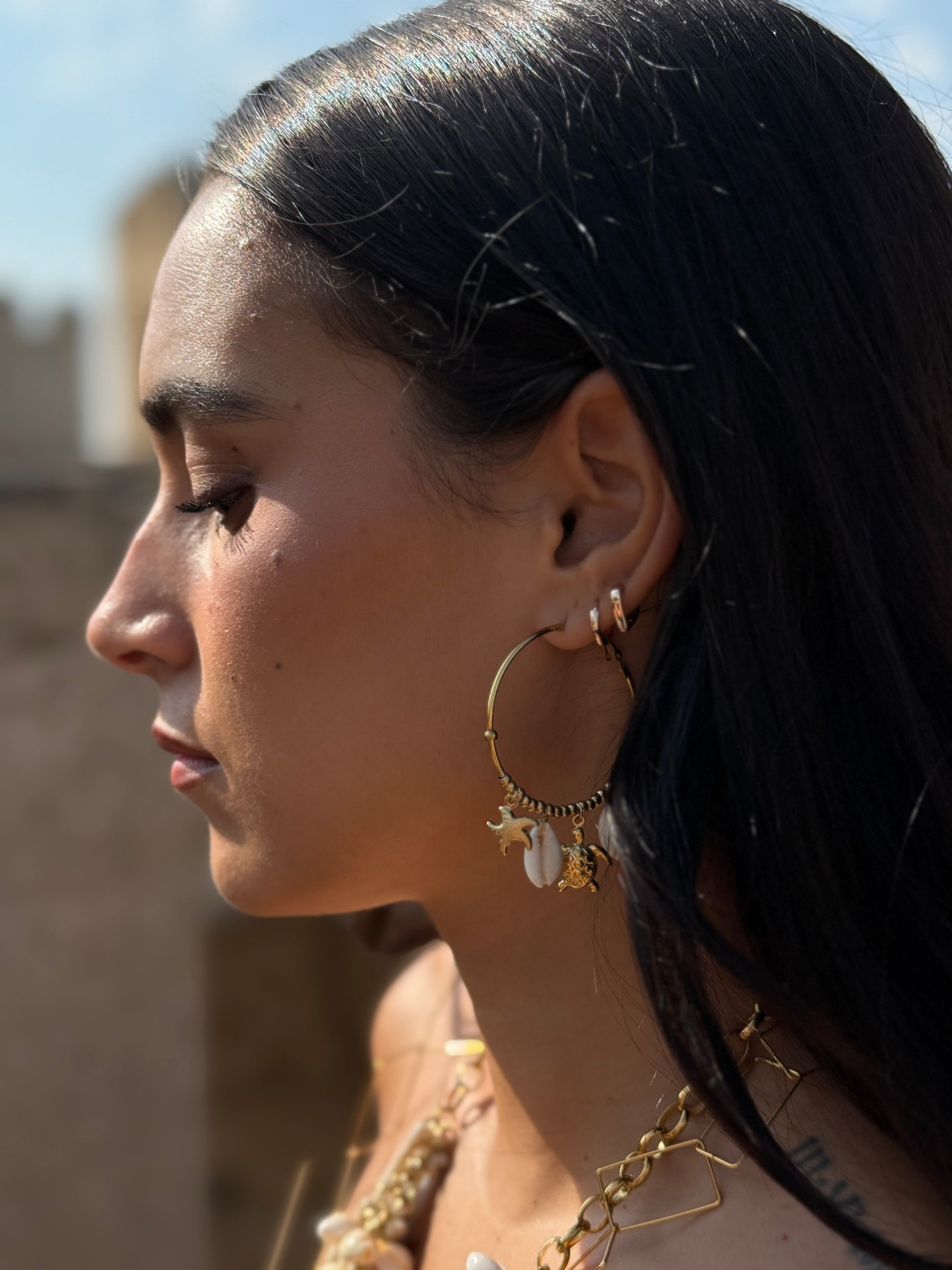 Pendientes de aro de acero dorado con bucios y abalorios.