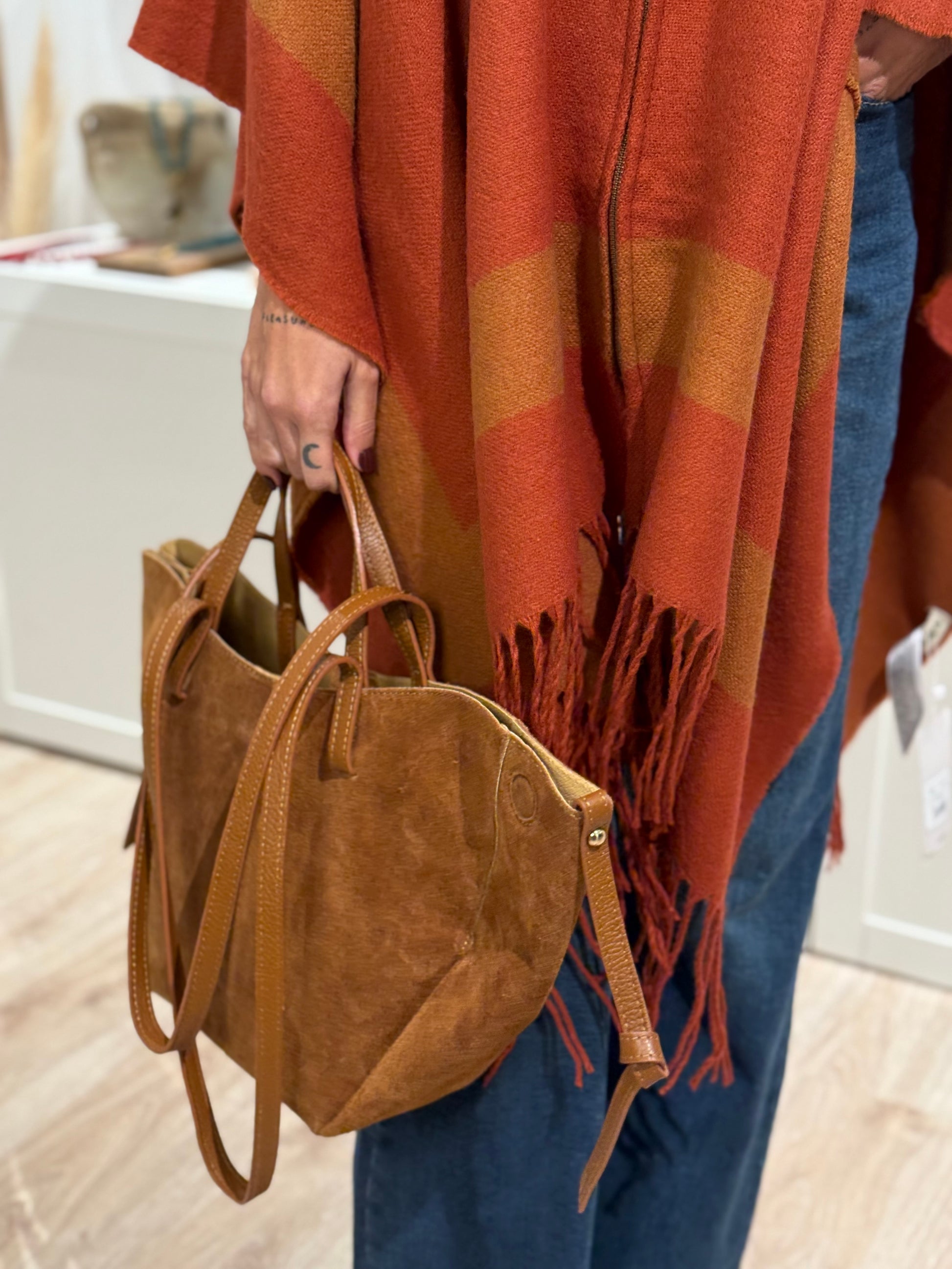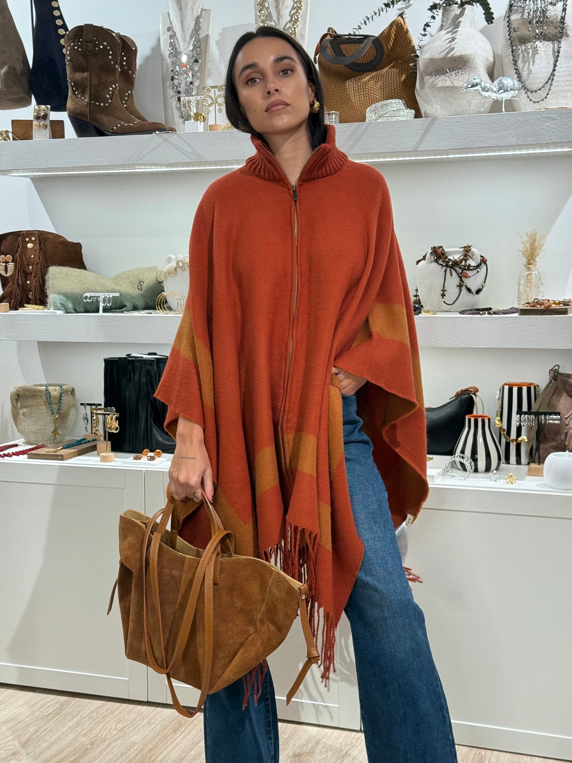 Poncho de corte amplio y tejido fino con cierre frontal de cremallera y cuello subido. Presenta un diseño con franjas contrastadas y flecos largos en el bajo que le aportan un aire dinámico y elegante.