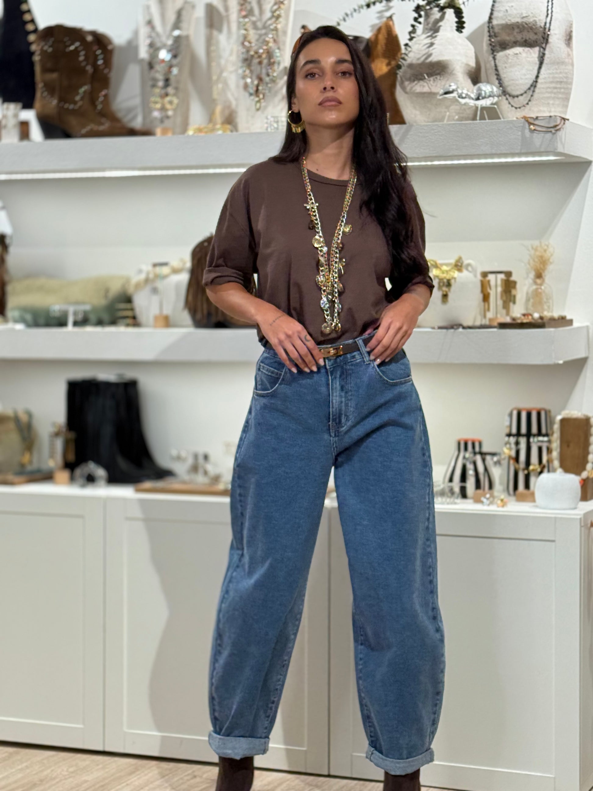Slouchy denim, bolsillos delanteros y traseros, cierre de botón y cremallera. La modelo mide 1,65 usa talla 36 y lleva talla S.