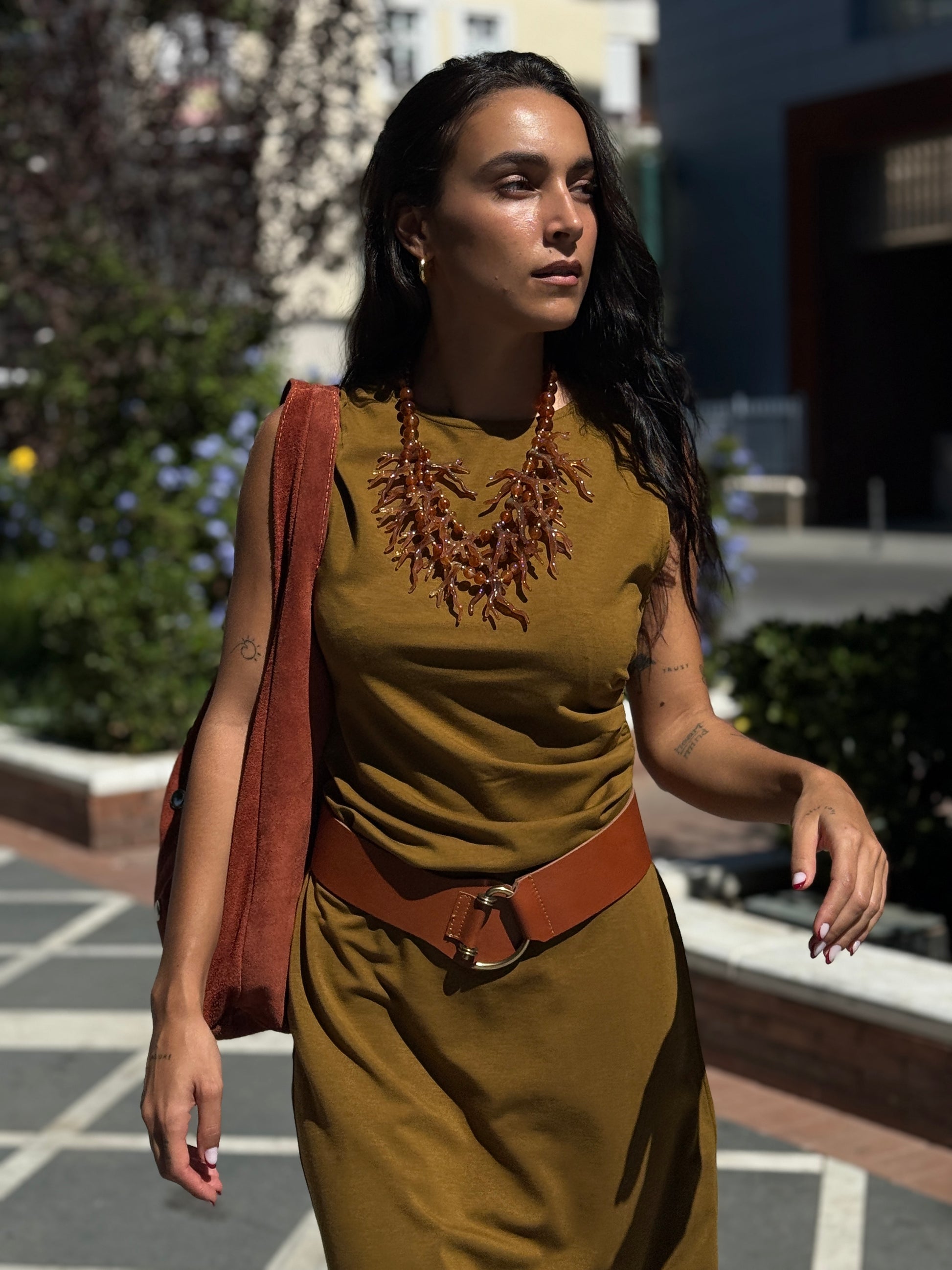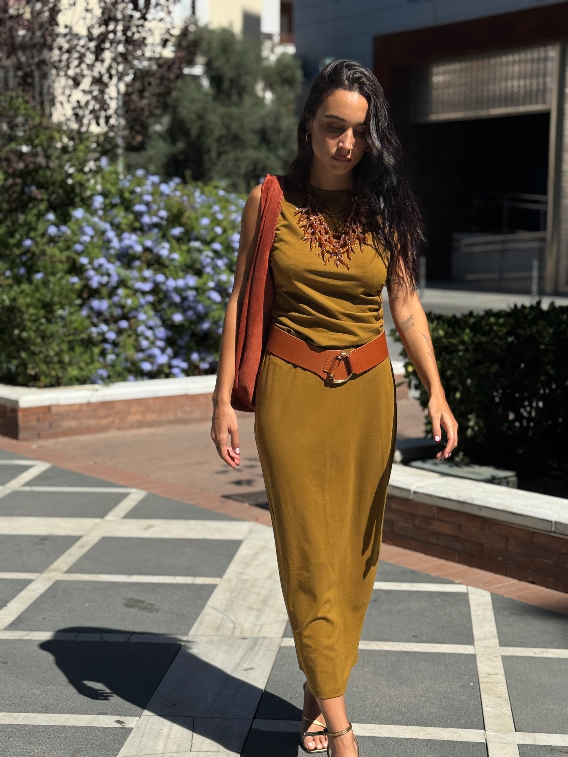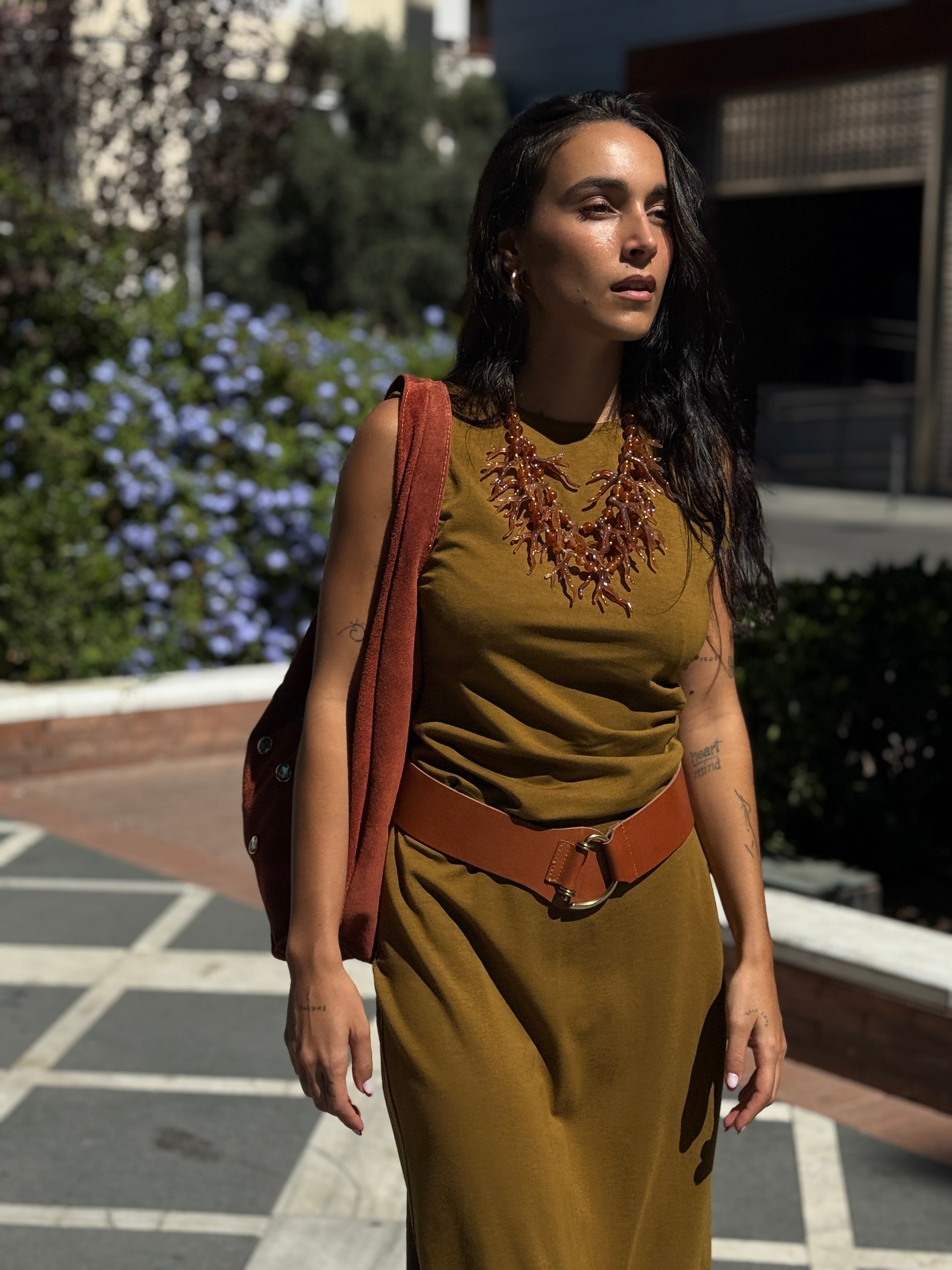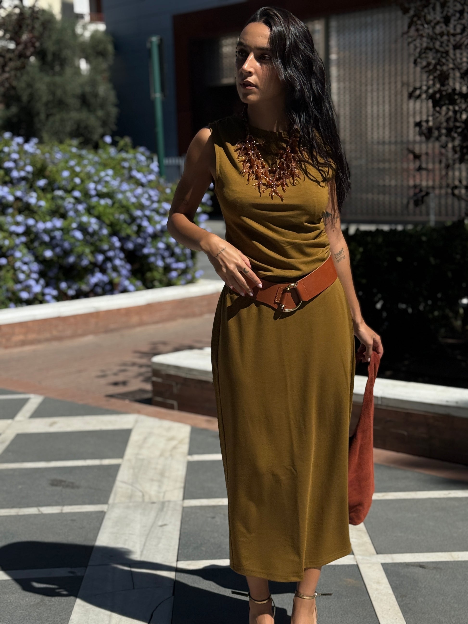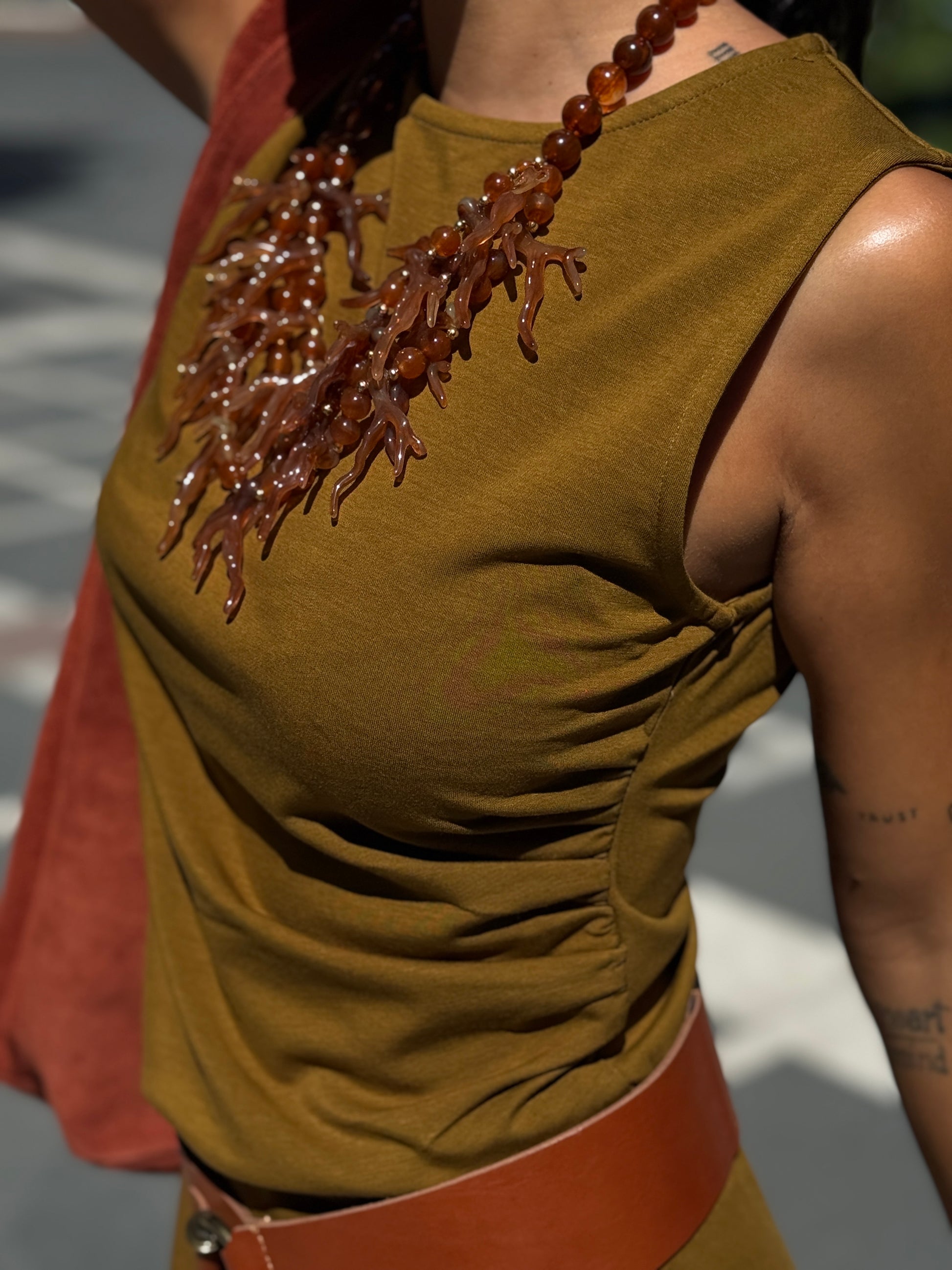 Top sin mangas con cuello redondo y detalle de drapeado en la cintura y en el hombro. . La modelo mide 1,65 y usa talla 34/36 y lleva XS.