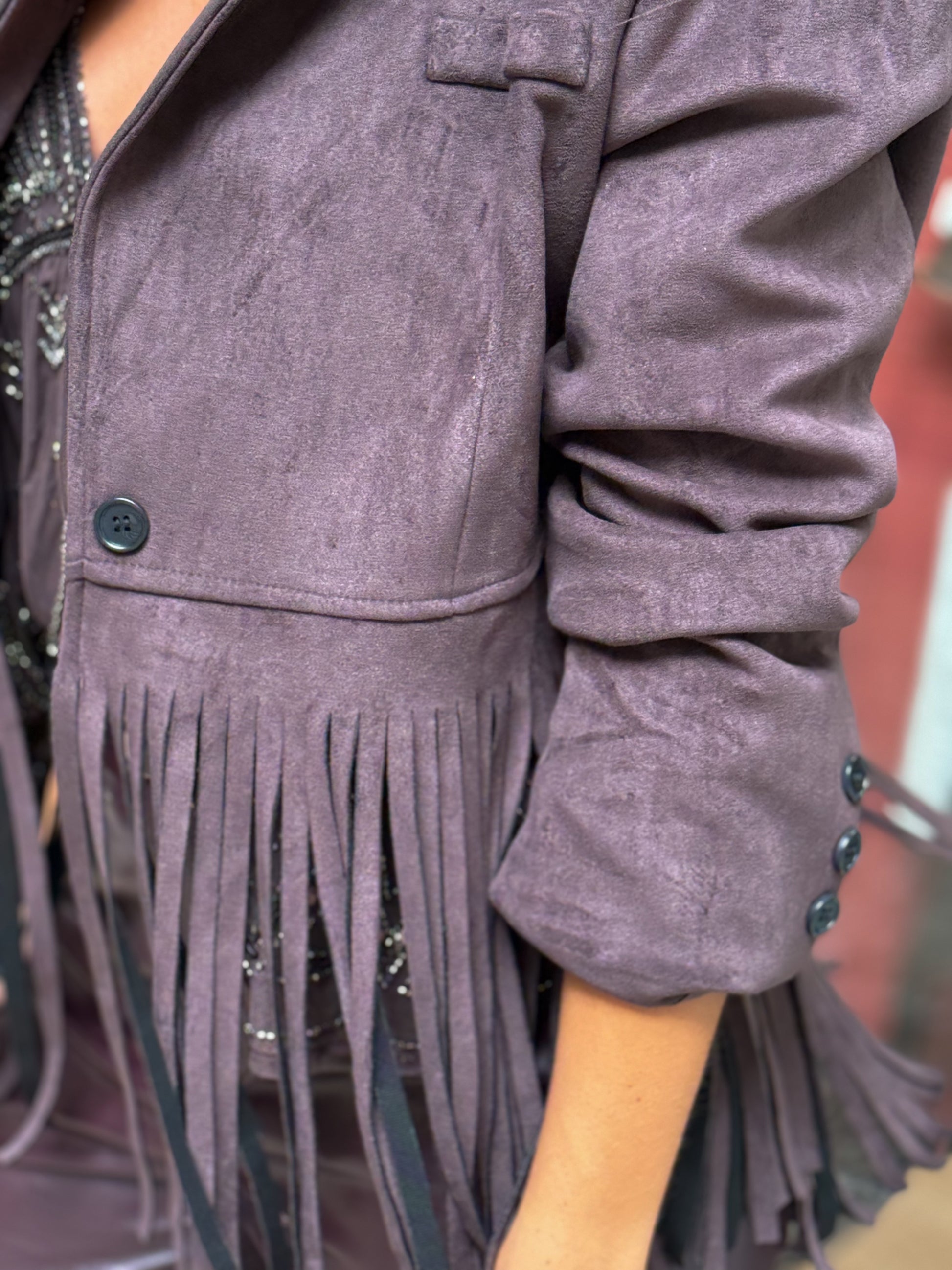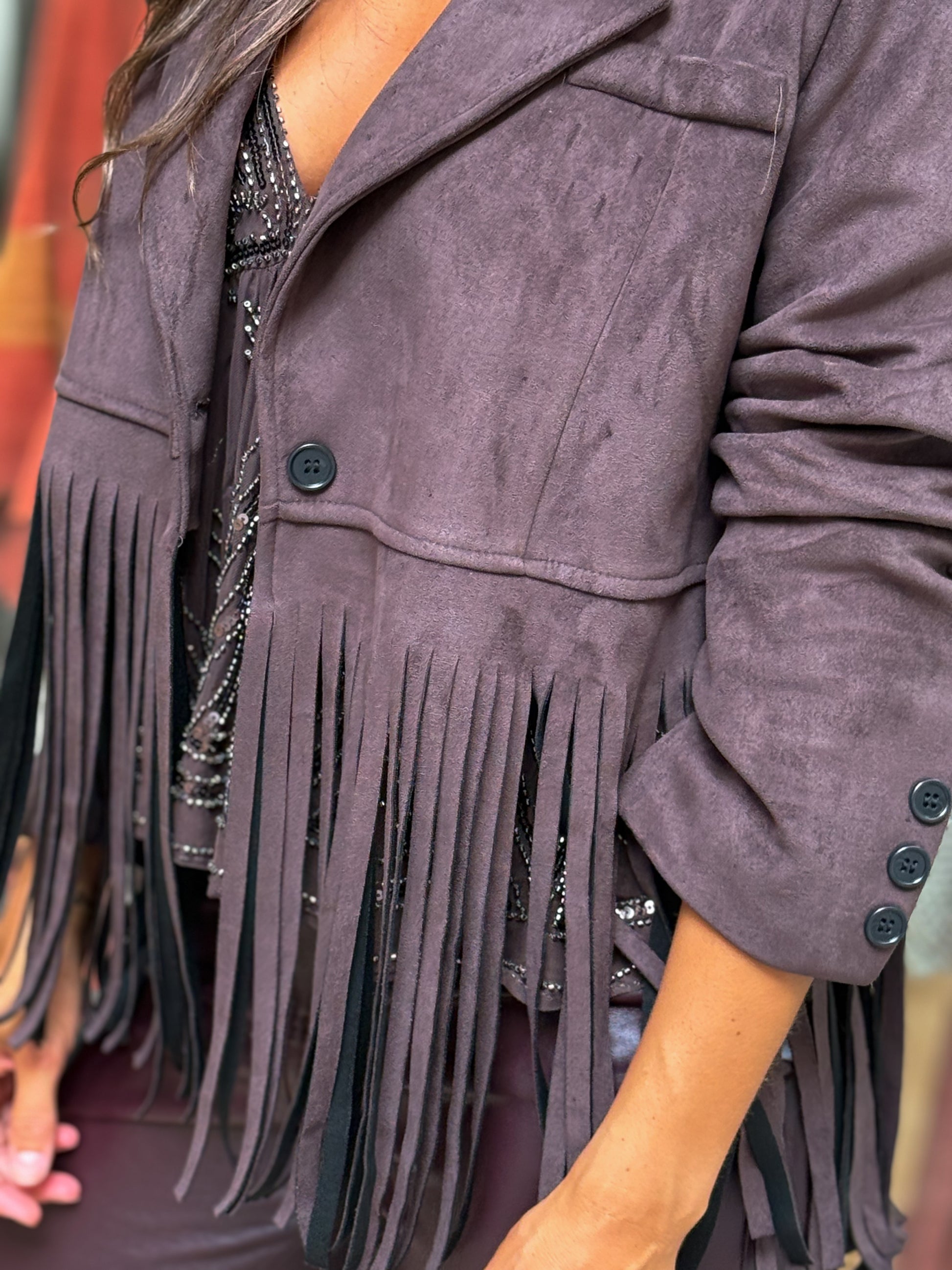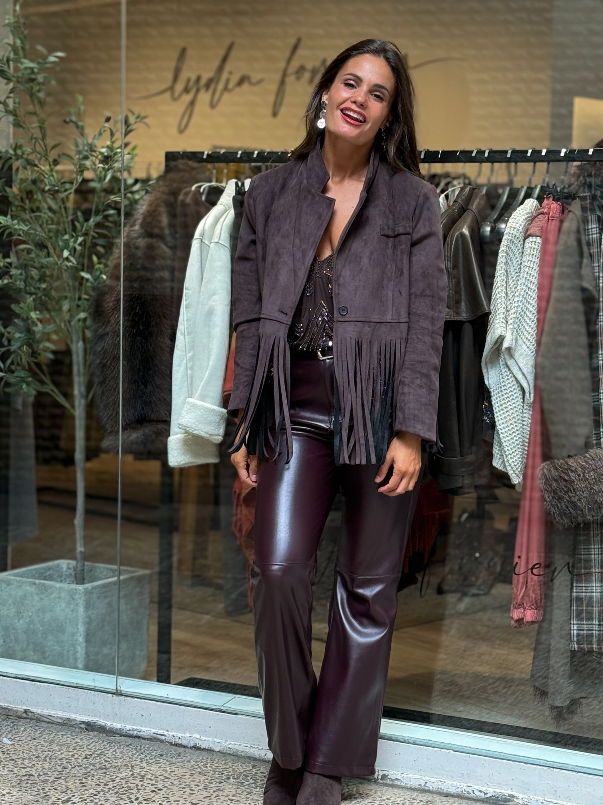 Chaqueta torera de corte amplio, cierre de botón y detalle de flecos. La modelo mide 1,67 usa talla 36.