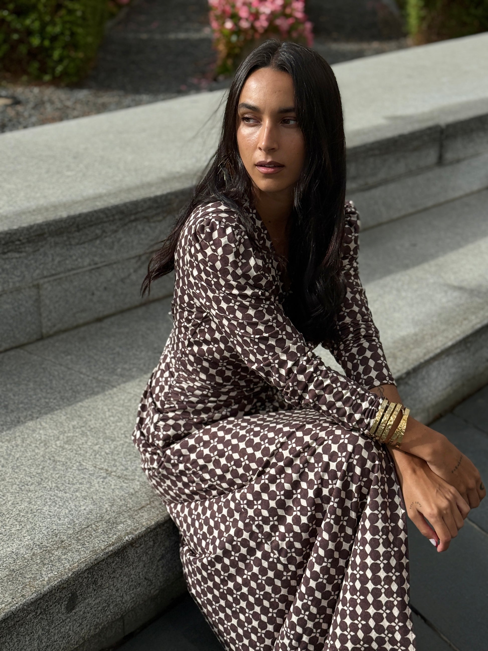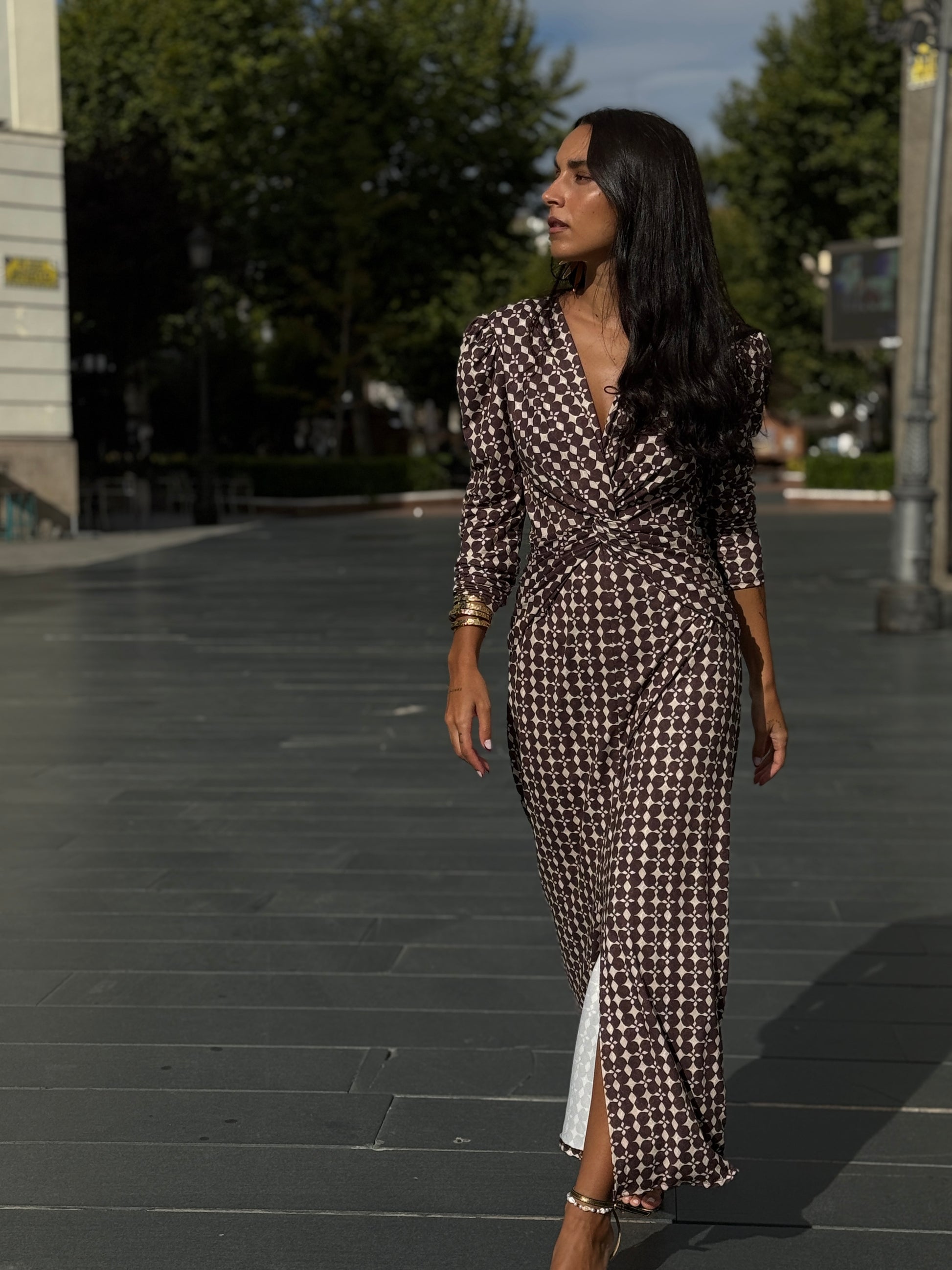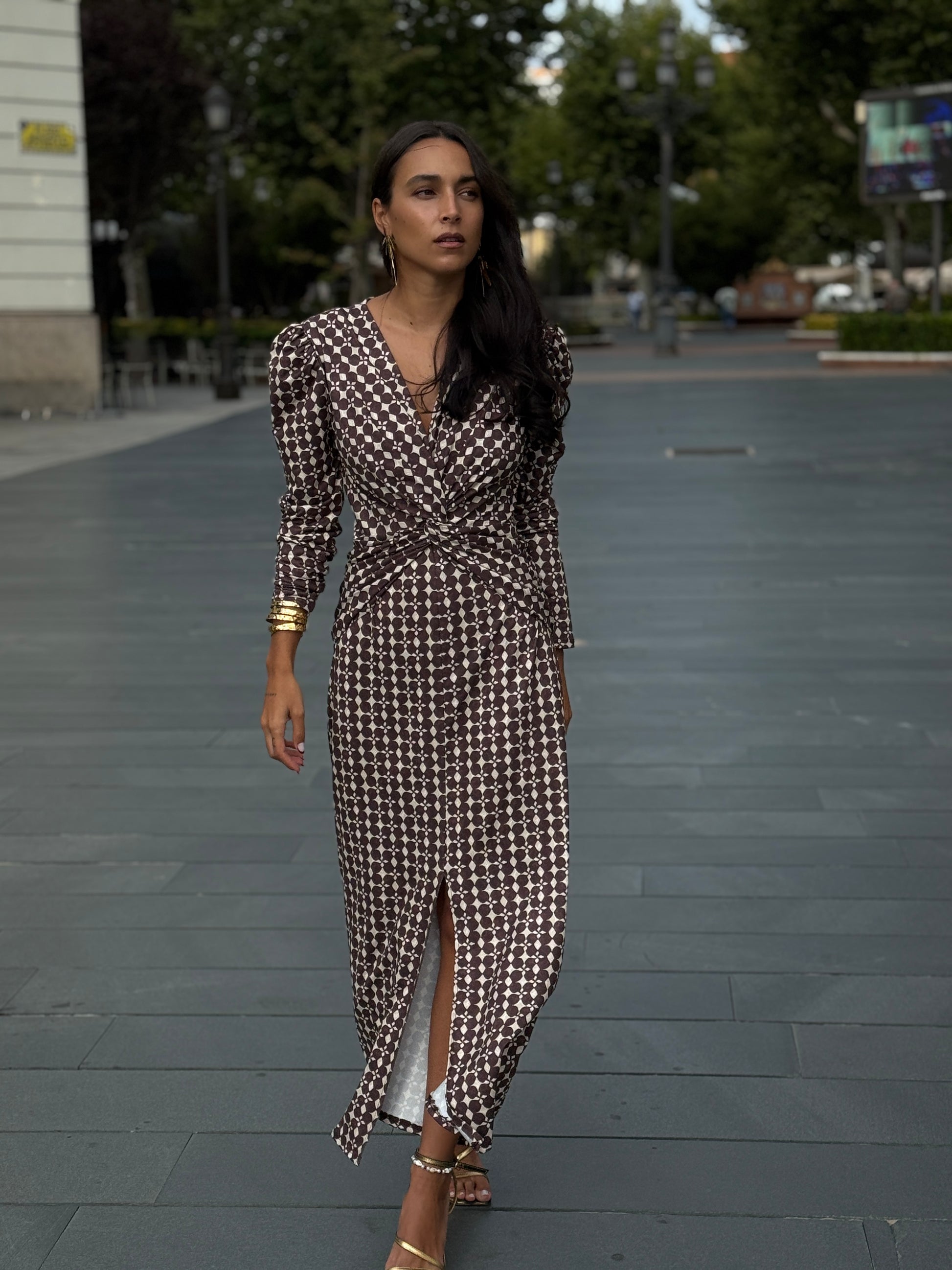 Vestido elástico estampado, escote en V, drapeado efecto nudo en abdomen, hombreras y abertura delantera. La modelo mide 1,65 usa talla 36 y lleva la S.