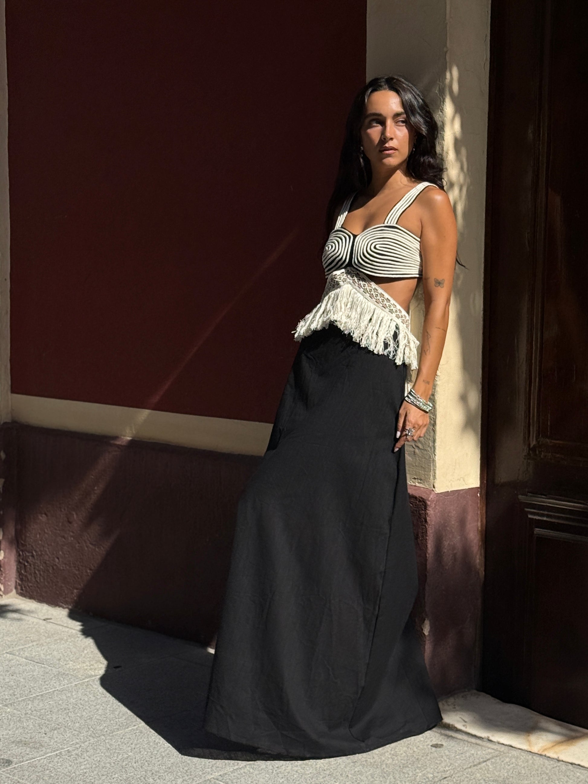 Vestido largo con cut-out en cintura, detalles de flecos, anudado en espalda y forro interior. La modelo mide 1,65 usa talla 36 y lleva S/M