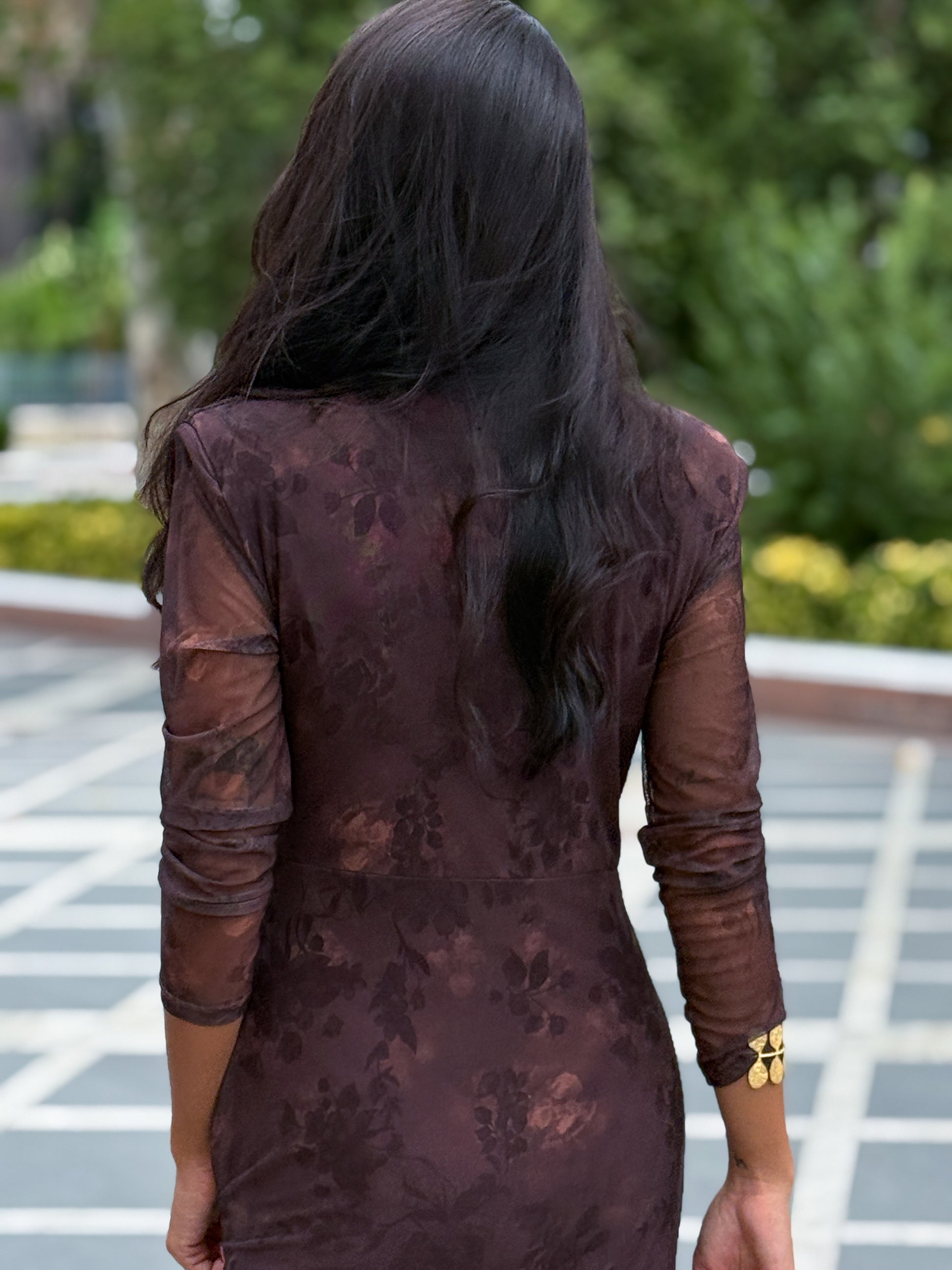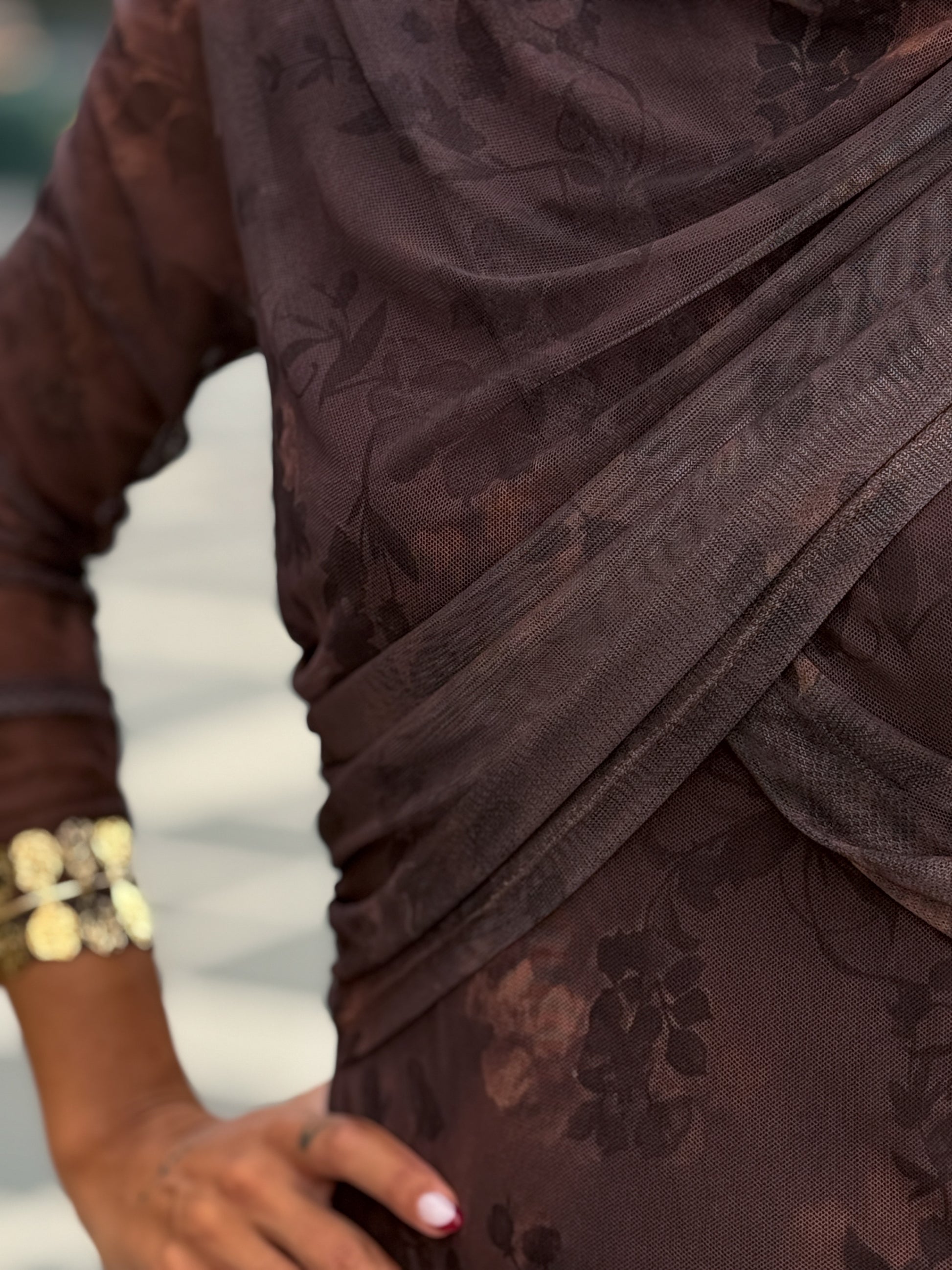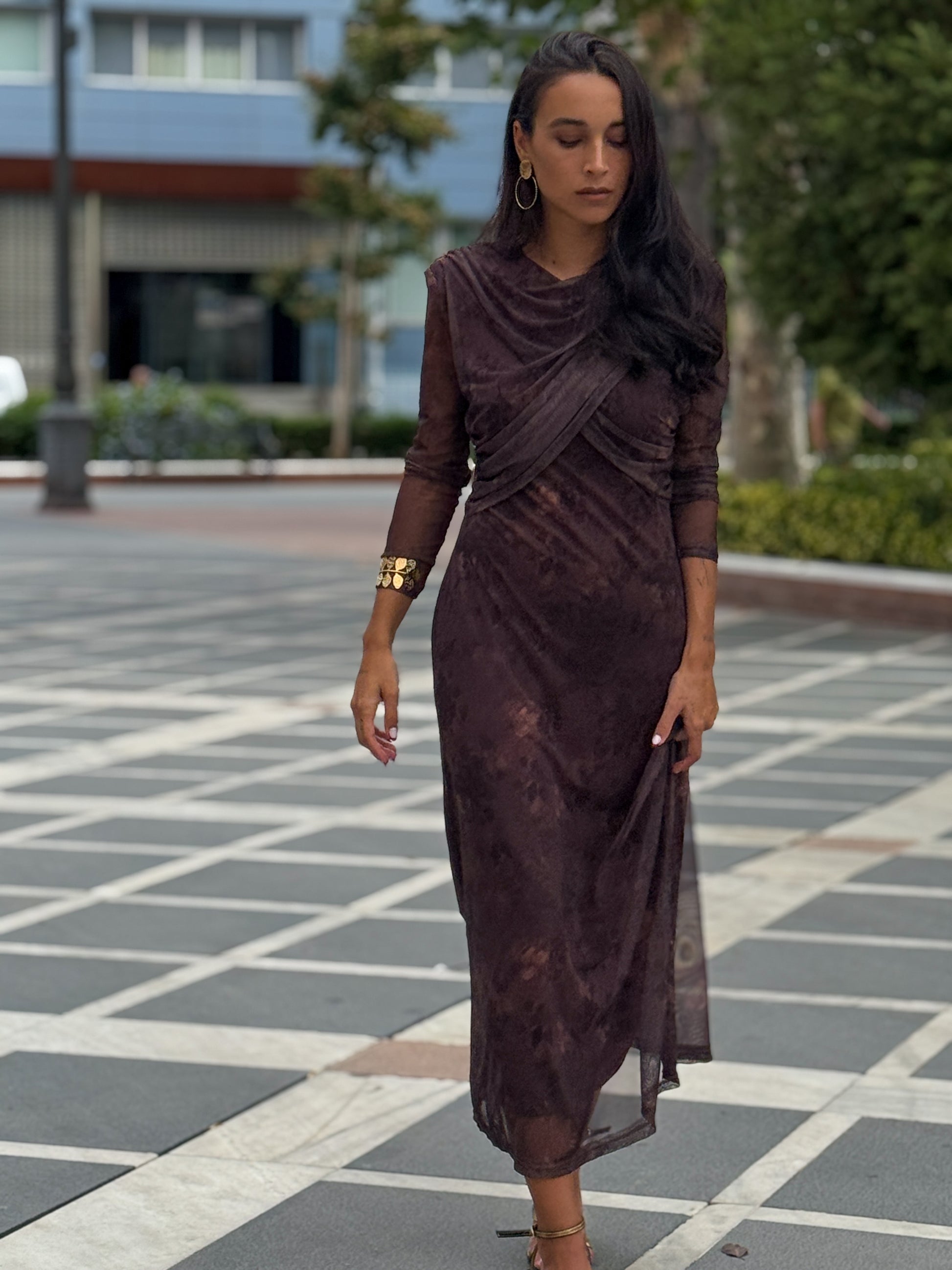 Vestido largo flexible de tul estampado, forro interior con escote cruzado y hombreras . La modelo mide 1,65 usa talla 36 y lleva la S.
