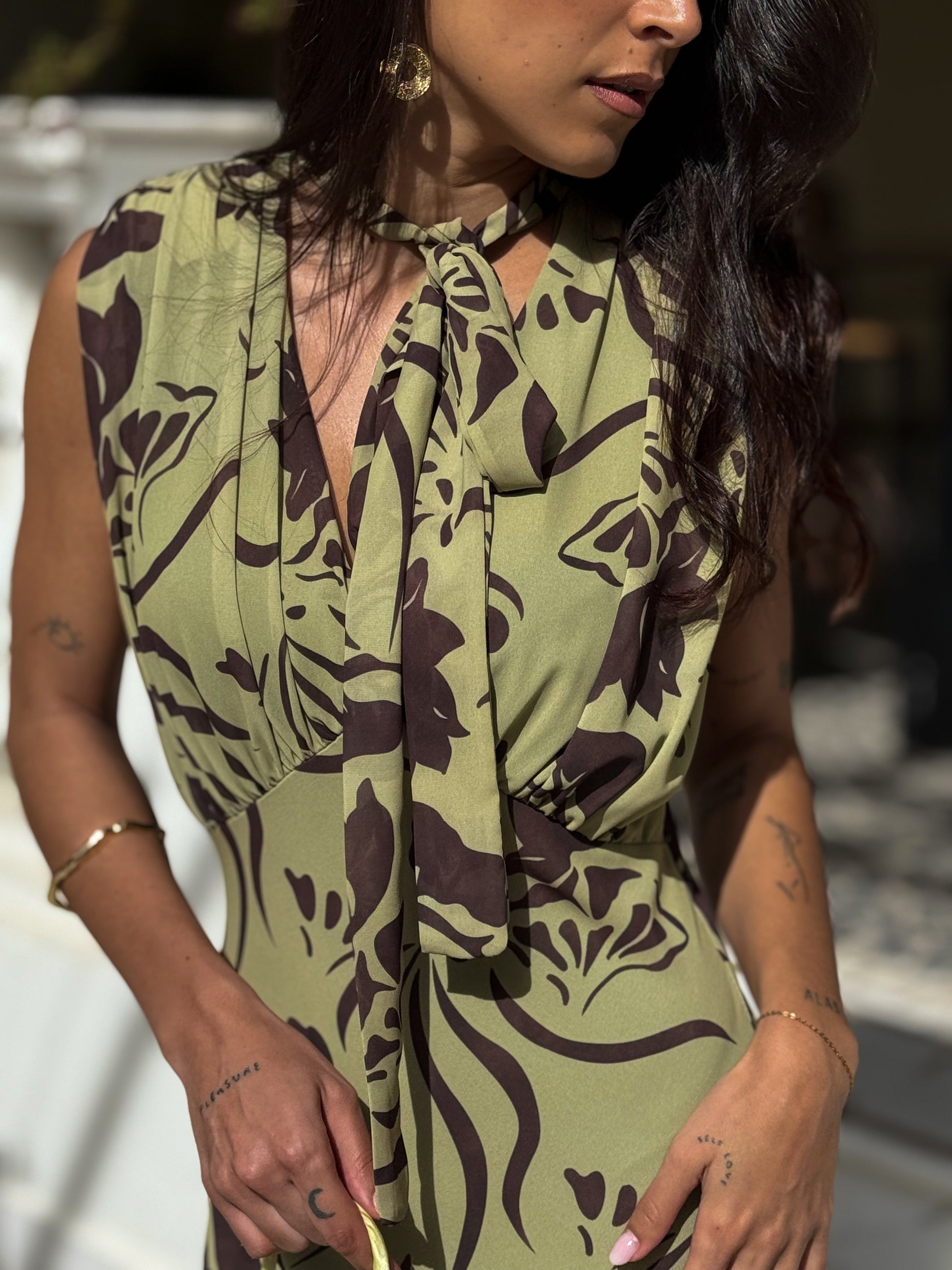 Vestido largo y fluido con escote en pico y detalle drapeado que realza la silueta. Incorpora un elegante cuello tipo choker y un estampado floral en tonos marrón sobre fondo verde claro, perfecto para un look sofisticado y actual ,una opción ideal para lucir como invitada en ocasiones especiales. Incluye forro interior largo