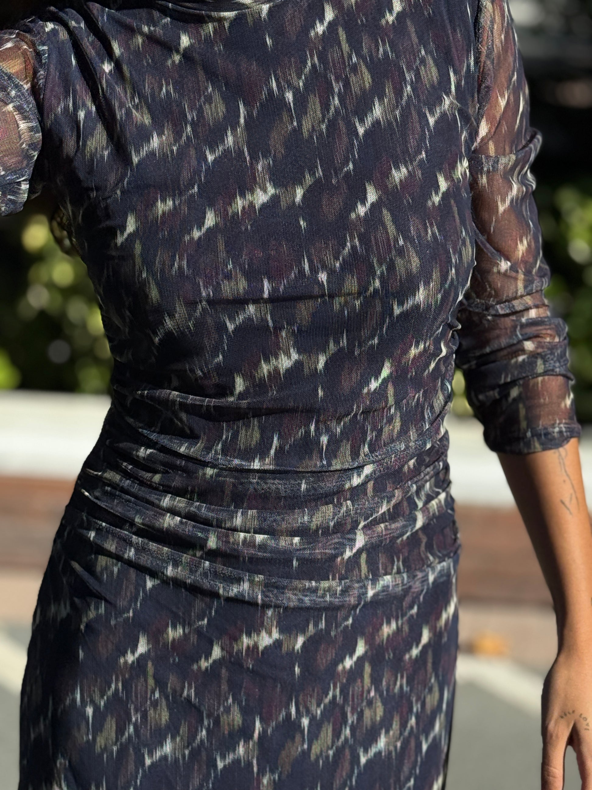 Vestido largo flexible de tul estampado, forro interior con drapeado en cintura. La modelo mide 1,65 usa talla 36 y lleva la S.