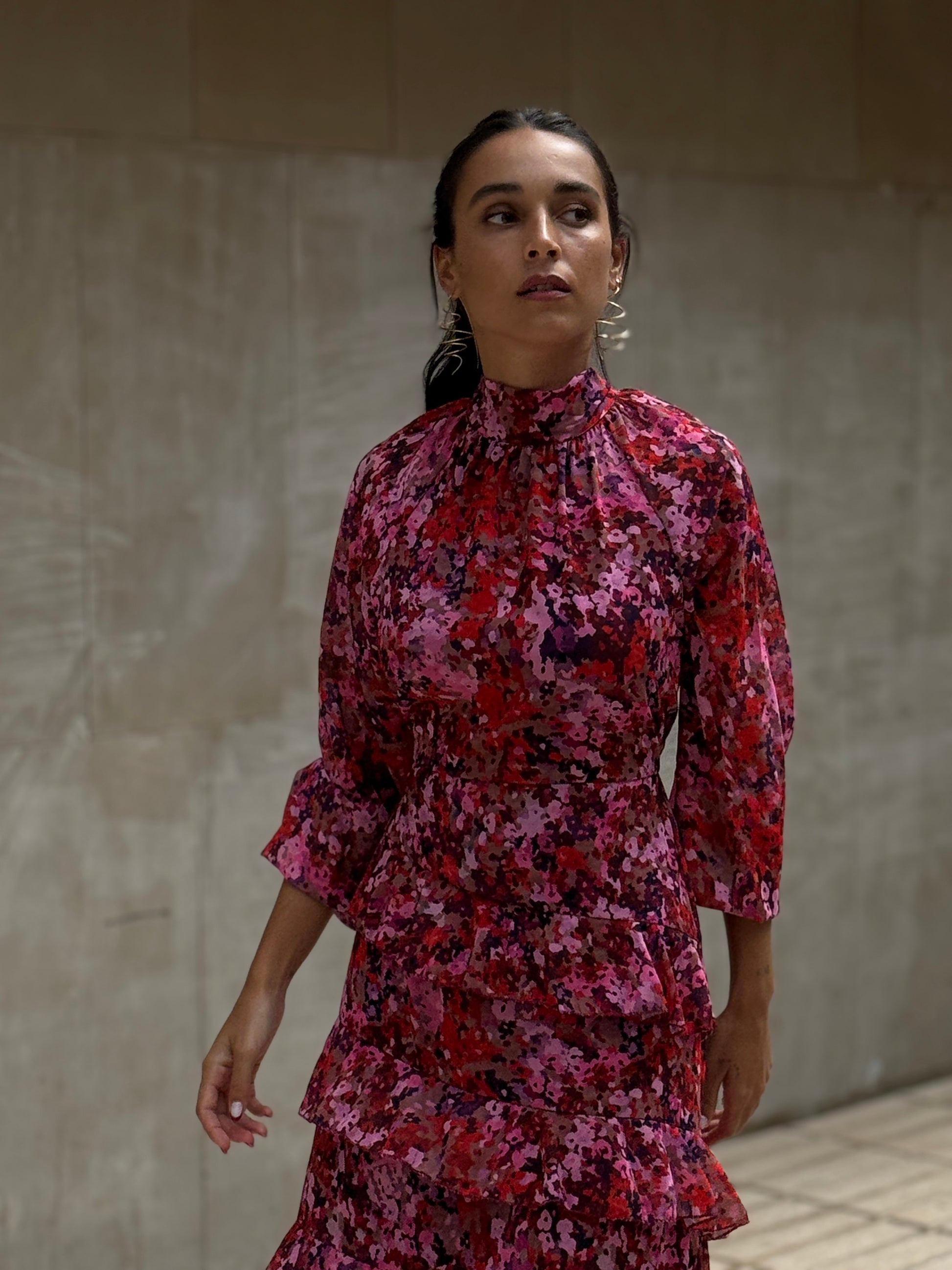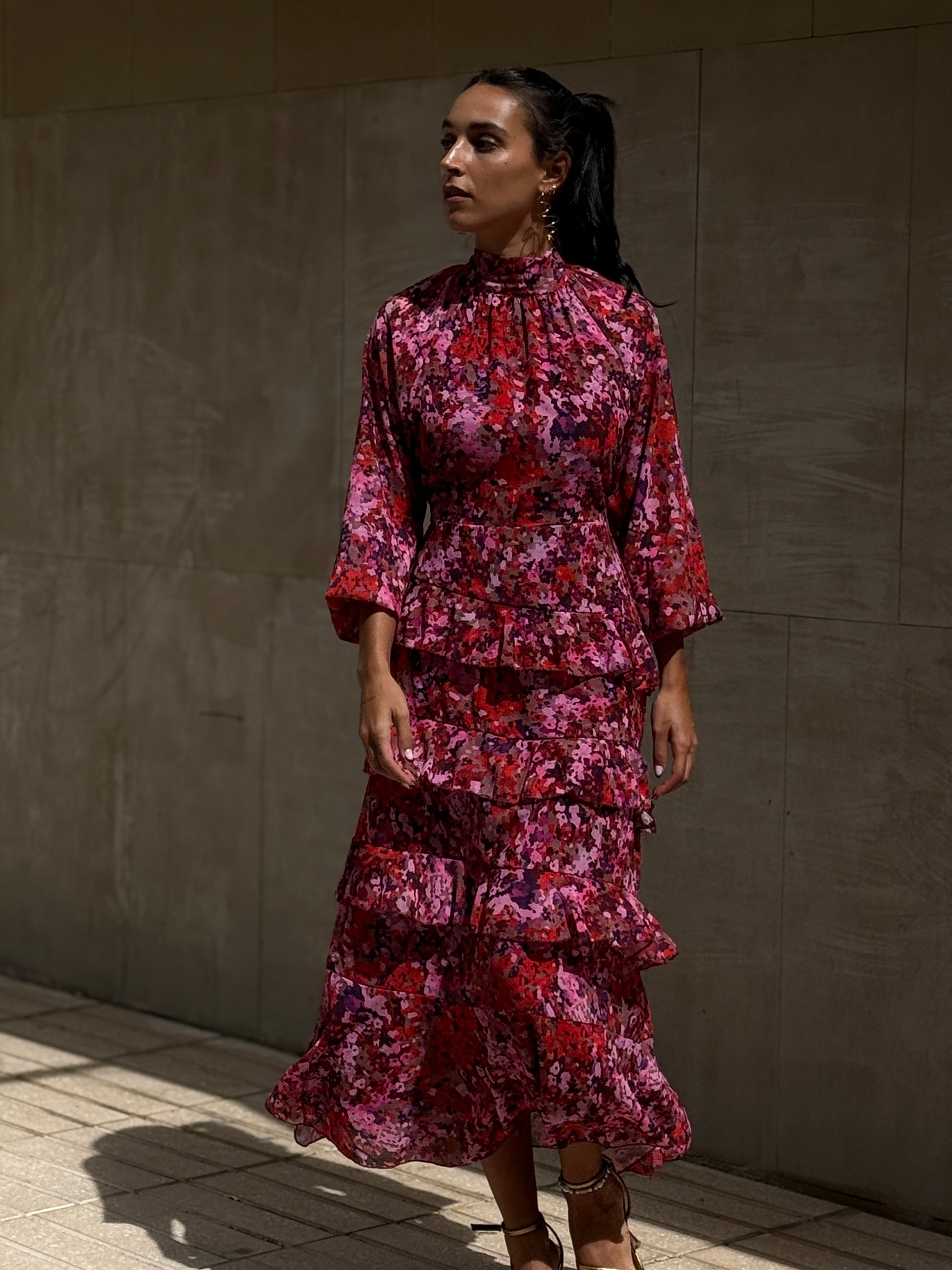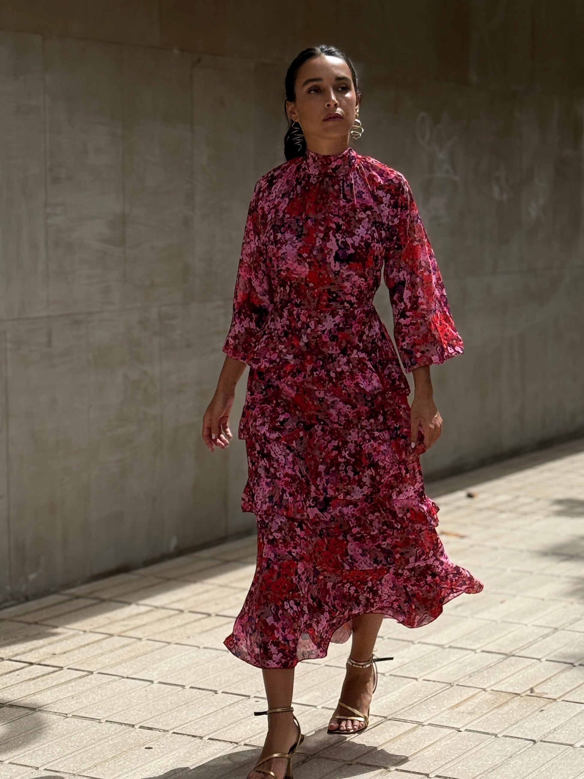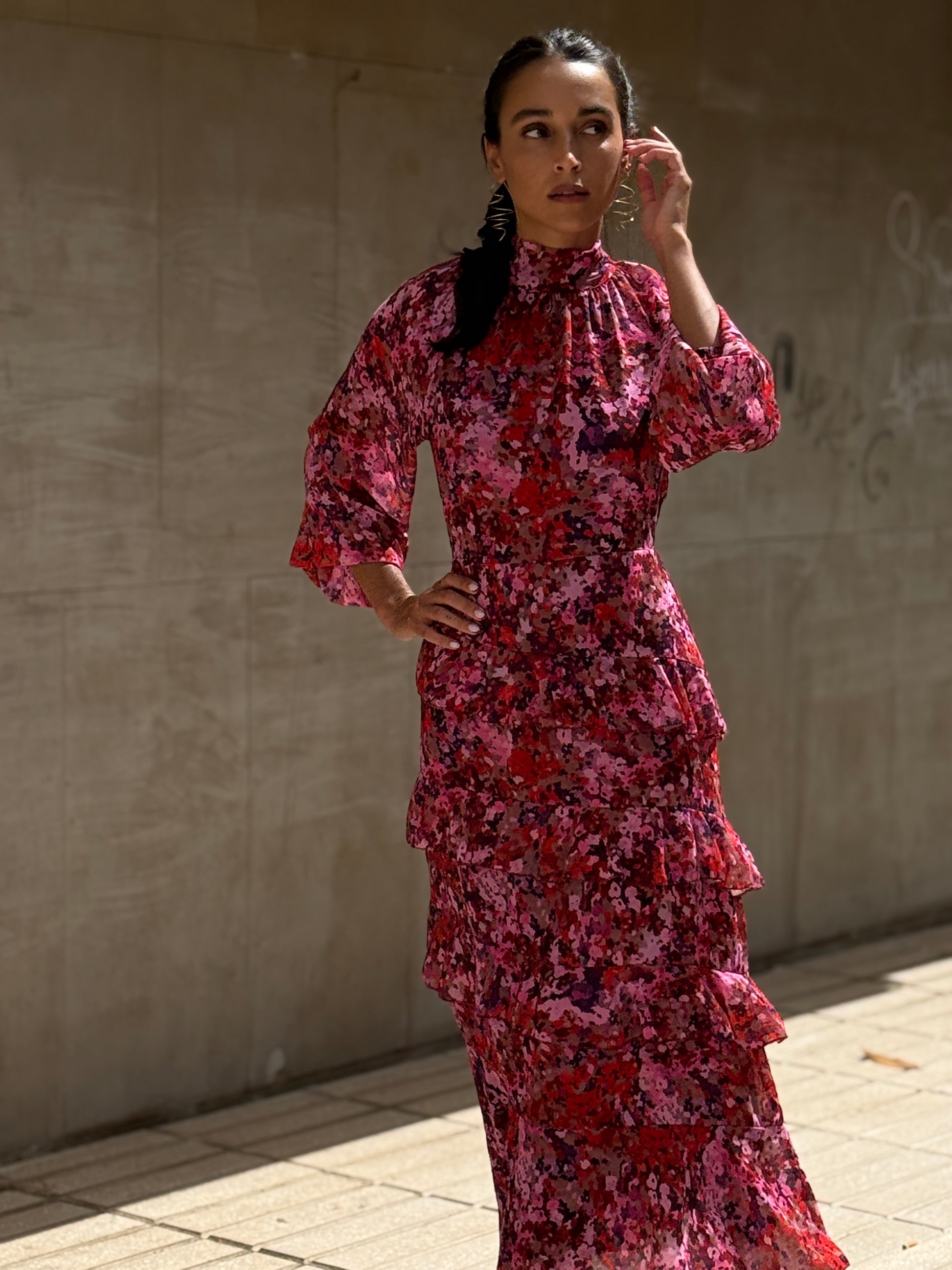 Vestido largo estampado con volantes, elástico en cintura y puños, lazada en cuello yforro interior. La modelo mide 1,65 usa talla 36 y lleva la S.